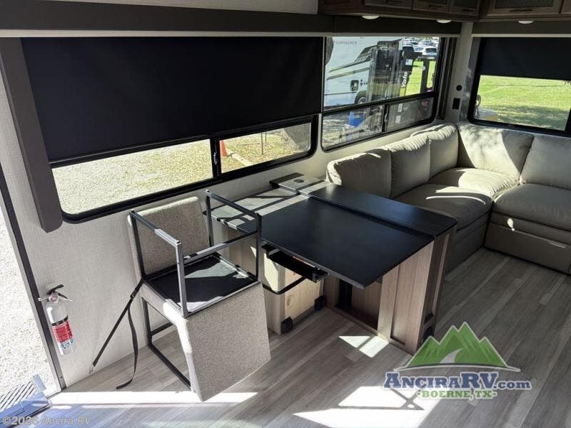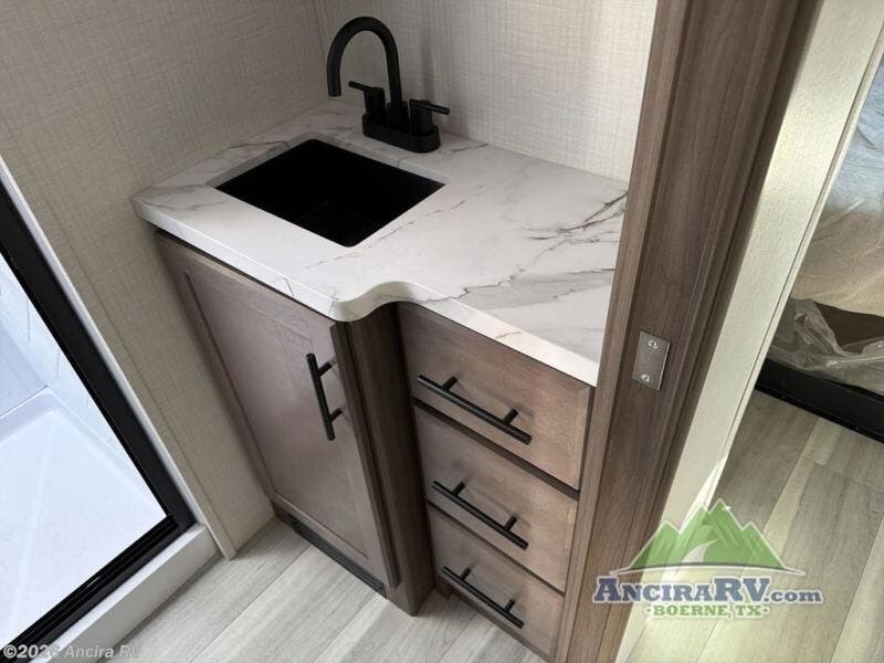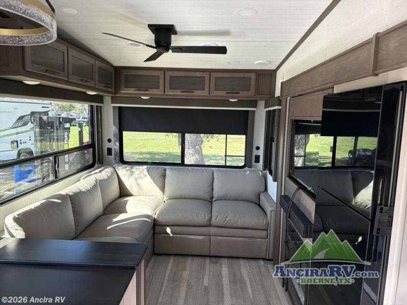 Comfort is just a step away in this fifth wheel with a large slide out. Here, you'll find the hidden pantry behind the pivoting entertainment door plus your kitchen appliances. The stainless steel sink will let you easily clean up, and the pivot dinette with two extra folding chairs provides versatile space to dine or work. Your crew can get comfortable on the L-shaped sofa after dinner, or head outdoors under the 18' power awning. A full bath lets you clean up after a day at the lake, and the front private bedroom with a king bed gives you your own space at night. There are also dual wardrobes and nightstands plus a wardrobe with washer and dryer prep for the option to go full-time!