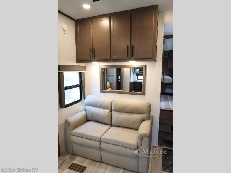 Time spent at the campground in this fifth wheel will be time well spent! Once you arrive, you can unload the unobstructed pass-thru storage, put out the two power awnings, and grab a cold drink from the outdoor mini refrigerator. Head inside to relax on the tri-fold sleeper sofa or theater seating across from the LED HDTV. The rear kitchen includes everything you need to make meals each day, including a pull-out countertop for more space plus a pantry and 16 cu. ft. refrigerator for food storage. The full bath with a 30" x 36" shower will let you freshen up before bed, and speaking of bedtime, the queen bed in the front private bedroom is sure to bring a great night's rest. There are also dual wardrobes and nightstands here for your things, plus a third wardrobe with washer and dryer prep if you want to add these appliances.
