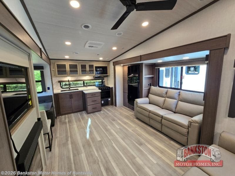 Time spent at the campground in this fifth wheel will be time well spent! Once you arrive, you can unload the unobstructed pass-thru storage, put out the two power awnings, and grab a cold drink from the outdoor mini refrigerator. Head inside to relax on the tri-fold sleeper sofa or theater seating across from the LED HDTV. The rear kitchen includes everything you need to make meals each day, including a pull-out countertop for more space plus a pantry and 12V refrigerator for food storage. The full bath with a 30" x 36" shower will let you freshen up before bed, and speaking of bedtime, the king bed in the front private bedroom is sure to bring a great night's rest. There are also dual wardrobes and nightstands here for your things, plus a third wardrobe with washer and dryer prep if you want to add these appliances.