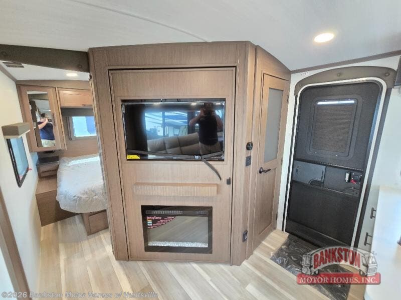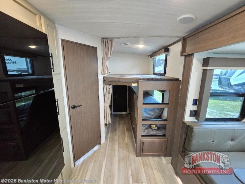 With dual entry doors in this travel trailer, you can enter in through the main living area or the full bath for convenience! Once inside, the sleeper sofa and booth dinette provide places to relax, eat, and play games, plus there is an entertainment center with hidden storage behind to keep movies organized. A full kitchen with a three burner cooktop and 12V refrigerator will allow you to cook and store food, or you can head outdoors to cook on the outdoor kitchen. There is also drop-frame storage outside for fishing poles and hiking gear, and the 21' electric awning provides shade as you relax. When it's time to call it a night, the king bed in the front private bedroom is sure to bring comfort, while the little ones take the double-size bunks, and any other guests can sleep on the living room furniture!
