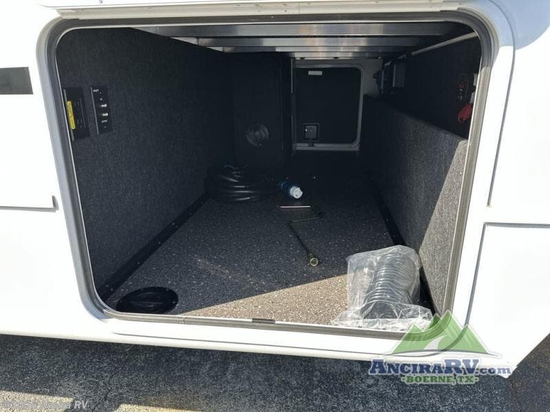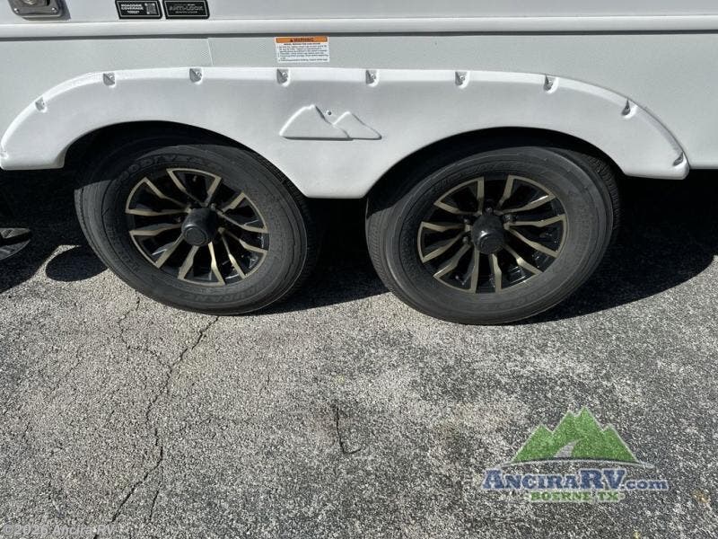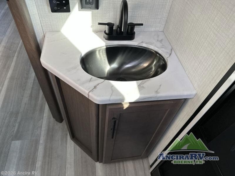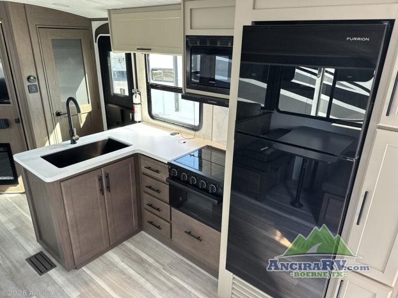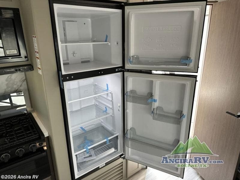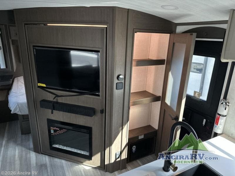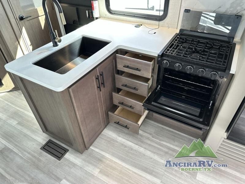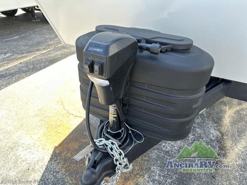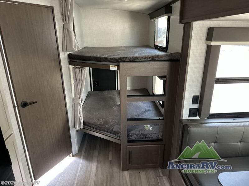 With dual entry doors in this travel trailer, you can enter in through the main living area or the full bath for convenience! Once inside, the sleeper sofa and booth dinette provide places to relax, eat, and play games, plus there is an entertainment center with hidden storage behind to keep movies organized. A full kitchen with a three burner cooktop and 12V refrigerator will allow you to cook and store food, or you can head outdoors to use the outdoor kitchen prep area. There is also drop-frame storage outside for fishing poles and hiking gear, and the 21' electric awning provides shade as you relax. When it's time to call it a night, the king bed in the front private bedroom is sure to bring comfort, while the little ones take the double-size bunks, and any other guests can sleep on the living room furniture!