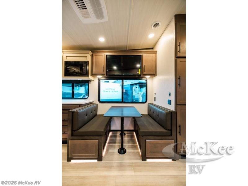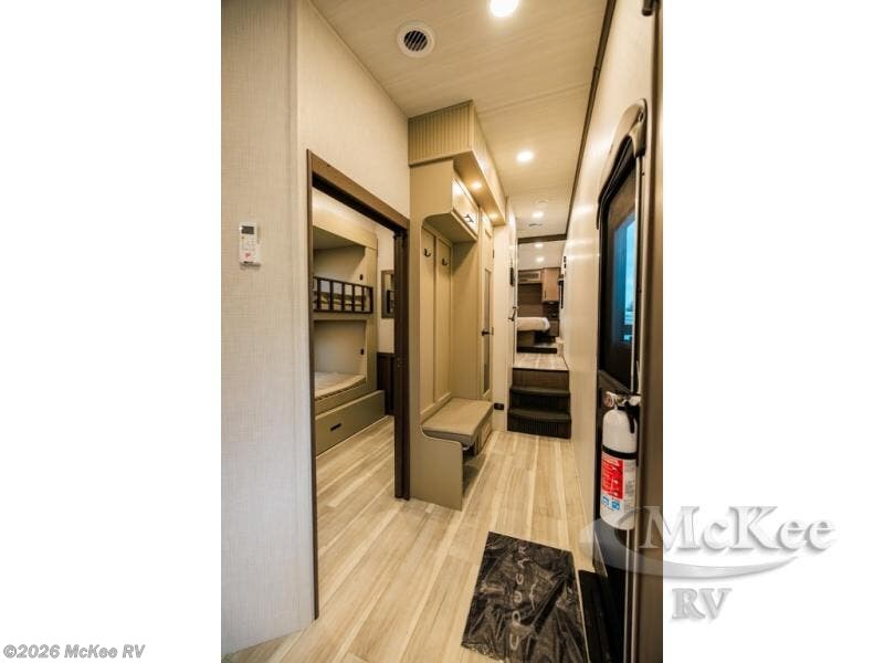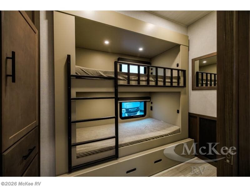 The whole crew will love camping trips in this spacious fifth wheel! From the front bedroom with a walk-around king bed to the rear kitchen with ample counter space, this is something for everyone. A middle bunkroom includes built-in bunk beds with a lower trundle bed and a flip-up table if some work needs done. Once your meals are made, you can dine at the booth dinette, relax on the sofa, or head outdoors to enjoy the power awnings. The full bath is towards the front near the bedroom for convenience. Here, you'll find a king bed, dual nightstands, plus a wardrobe with washer and dryer prep if you choose to add these appliances!
