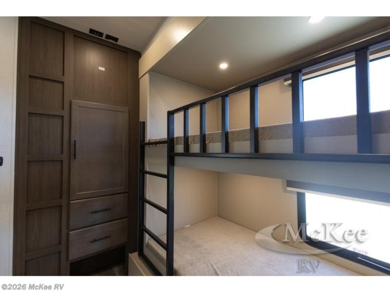 The whole crew will love camping trips in this spacious fifth wheel! From the front bedroom with a walk-around king bed to the rear kitchen with ample counter space, this is something for everyone. A middle bunkroom includes built-in bunk beds with a lower trundle bed and a flip-up table if some work needs done. Once your meals are made, you can dine at the booth dinette, relax on the sofa, or head outdoors to enjoy the power awnings. The full bath is towards the front near the bedroom for convenience. Here, you'll find a king bed, dual nightstands, plus a wardrobe with washer and dryer prep if you choose to add these appliances!