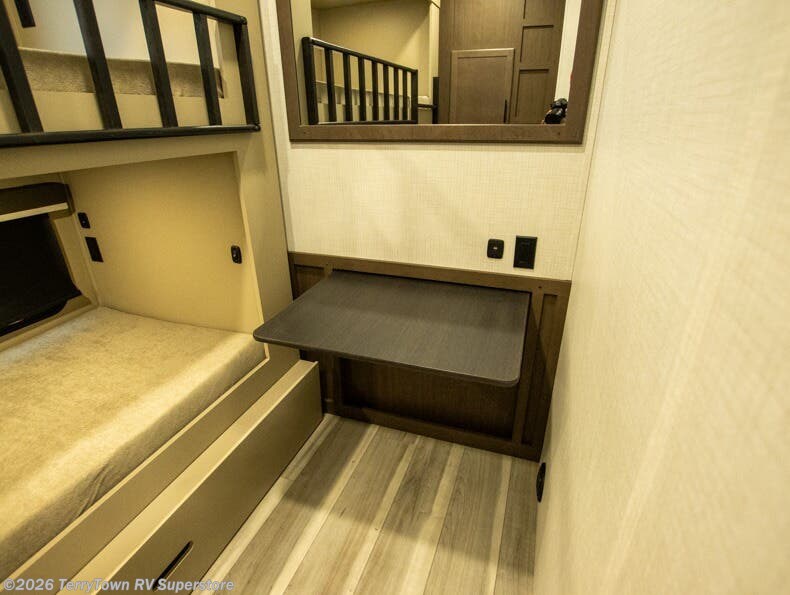 The whole crew will love camping trips in this spacious fifth wheel! From the front bedroom with a walk-around king bed to the rear kitchen with ample counter space, this is something for everyone. A middle bunkroom includes built-in bunk beds with a lower trundle bed and a flip-up table if some work needs done. Once your meals are made, you can dine at the booth dinette, relax on the sofa, or head outdoors to enjoy the power awnings. The full bath is towards the front near the bedroom for convenience. Here, you'll find a king bed, dual nightstands, plus a wardrobe with washer and dryer prep if you choose to add these appliances!