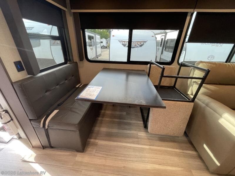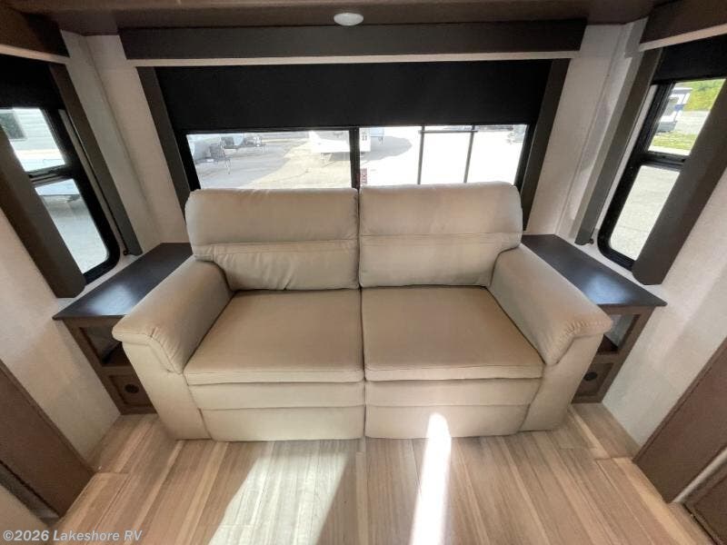 Trips spent in this travel trailer are sure to bring memories! The dual opposing slides in the combined kitchen and living area provide your crew with plenty of space to relax on the theater seating, dine at the dinette table, and prep meals with the kitchen island. There is also a tri-fold sleeper sofa here for guests and a pivoting entertainment center with a hidden pantry to keep snacks stocked. And a second pantry and hutch provides even more storage! You'll love having your own private bedroom up front, complete with a king bed, dual bedside drawers and nightstands and additional storage drawers to keep your space tidy. Outside, you'll find two power awnings, a 2" accessory hitch, and a drop frame pass-thru storage for fishing poles, hiking gear, and more!