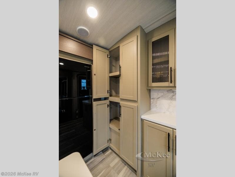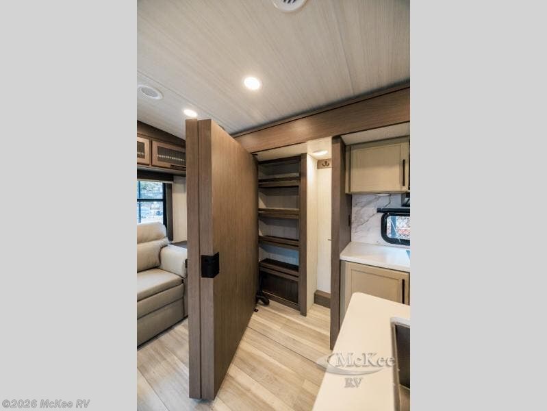 Trips spent in this travel trailer are sure to bring memories! The dual opposing slides in the combined kitchen and living area provide your crew with plenty of space to relax on the theater seating, dine at the dinette table, and prep meals with the kitchen island. There is also a tri-fold sleeper sofa here for guests and a pivoting entertainment center with a hidden pantry to keep snacks stocked. And a second pantry and hutch provides even more storage! You'll love having your own private bedroom up front, complete with a king bed, dual bedside drawers and nightstands and additional storage drawers to keep your space tidy. Outside, you'll find two power awnings, a 2" accessory hitch, and a drop frame pass-thru storage for fishing poles, hiking gear, and more!