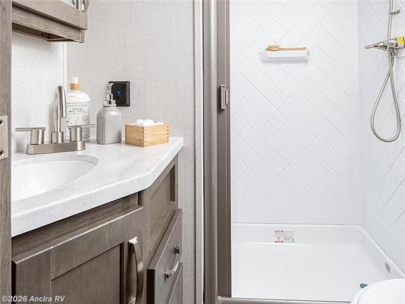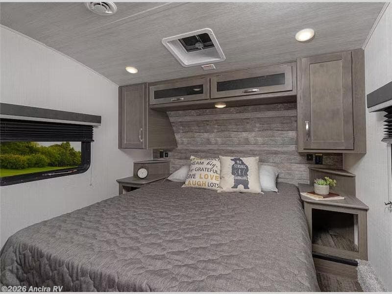 The Cougar Sport structural I-beam frame with stamped steel cross-members and outriggers, plus its laminated sidewalls with five-sided aluminum superstructure and Alpha Super Flex roof membrane are what active RVers love about the construction of the Cougar line. The Cougar Sport models are no exception when it comes to a great package, as well as being smaller and lighter weight than their big brother Cougar models. A one-piece, heated and enclosed polypropylene underbelly means a longer camping season. On the inside, residential shaker style hardwood cabinet doors and decorative crown molding, plus seamless pressed countertops and an on-demand water heater will make your unit feel even more like home. You are also sure to appreciate the shiplap style decorative accent wall behind the bed, a porcelain foot flush toilet in the bathroom, plus residential kitchen hardware, and so much more.