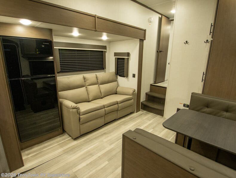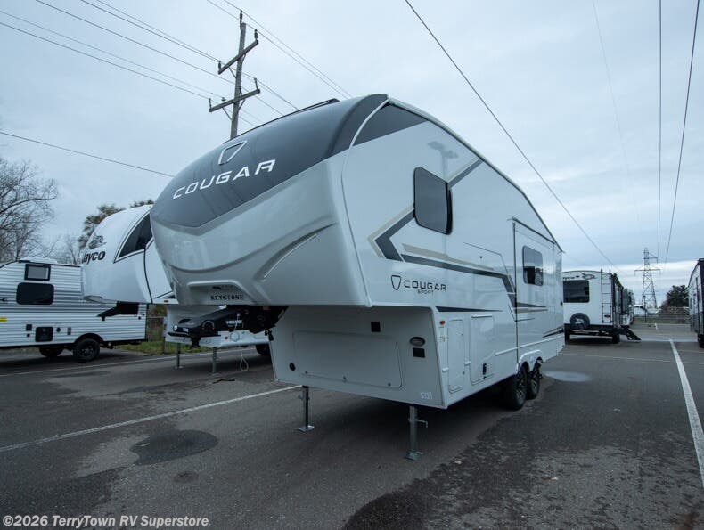 Your crew of three will love traveling in this Cougar Sport lightweight fifth wheel! Enter to find a convenient rear kitchen layout just steps inside the door. Drop your shoes off in the shoe cubby to your right at the door, and relax on either the theater seating or at the booth dinette. Head up the steps to a complete bath and private front bedroom featuring a queen size bed with dual shirt wardrobes and nightstands on both sides of the bed. The bathroom offers a shower with a skylight for added headroom and natural lighting. Back down to the main living and kitchen area, a nice size pantry will hold all of your dry goods and snacks, and there is ample storage in the overhead cabinets above the dinette on either side of the TV, plus in the kitchen area all along the rear wall. Here you can cook your family their camp favorites using either the 17" Furrion range, or overhead microwave. Outside, a 17' awning provides added living space protected from the elements!