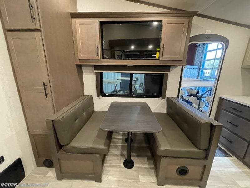 Your crew of three will love traveling in this Cougar Sport lightweight fifth wheel! Enter to find a convenient rear kitchen layout just steps inside the door. Drop your shoes off in the shoe cubby to your right at the door, and relax on either the theater seating or at the booth dinette. Head up the steps to a complete bath and private front bedroom featuring a queen size bed with dual shirt wardrobes and nightstands on both sides of the bed. The bathroom offers a shower with a skylight for added headroom and natural lighting. Back down to the main living and kitchen area, a nice size pantry will hold all of your dry goods and snacks, and there is ample storage in the overhead cabinets above the dinette on either side of the TV, plus in the kitchen area all along the rear wall. Here you can cook your family their camp favorites using either the 17" Furrion range, or overhead microwave. Outside, a 17' awning provides added living space protected from the elements!