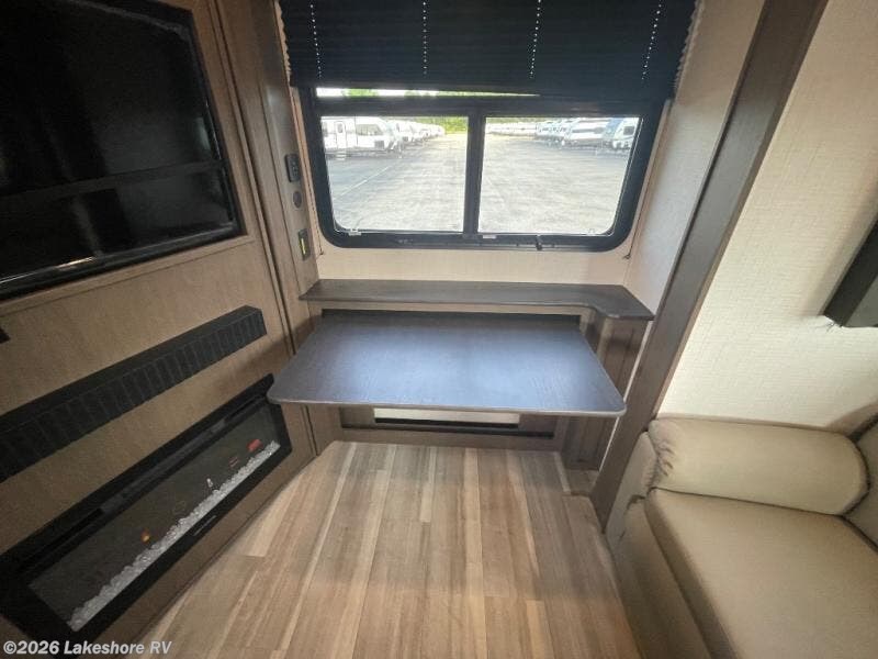 This lightweight fifth wheel is big enough for your small family to camp together! Enter to find a convenient combined kitchen and living space with large slide for added space. The slide features theater seating and a booth dinette which offers ample seating for meals and hanging out. There is a flip up table along the rear wall with a nearby 40" LED TV which features a butler pantry behind. Head up the steps to the right of the entry door to a complete bath and private front bedroom featuring a queen size bed with dual shirt wardrobes and nightstands on both sides of the bed. The bathroom offers a shower with a skylight for added headroom and natural lighting. Outside, a 16' awning provides added living space protected from the elements!