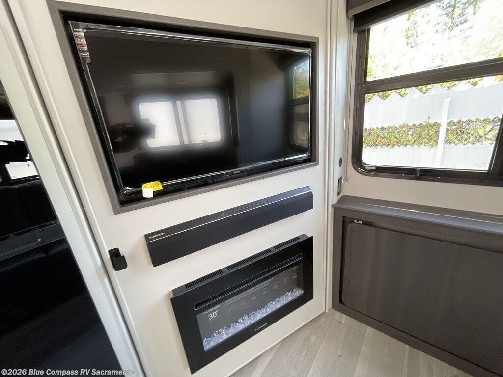 This lightweight fifth wheel is big enough for your small family to camp together! Enter to find a convenient combined kitchen and living space with large slide for added space. The slide features theater seating and a booth dinette which offers ample seating for meals and hanging out. There is a flip up table along the rear wall with a nearby 40" LED TV which features a butler pantry behind. Head up the steps to the right of the entry door to a complete bath and private front bedroom featuring a queen size bed with dual nightstands on both sides of the bed. The bathroom offers a shower with a skylight for added headroom and natural lighting. Outside, a 16' awning provides added living space protected from the elements!