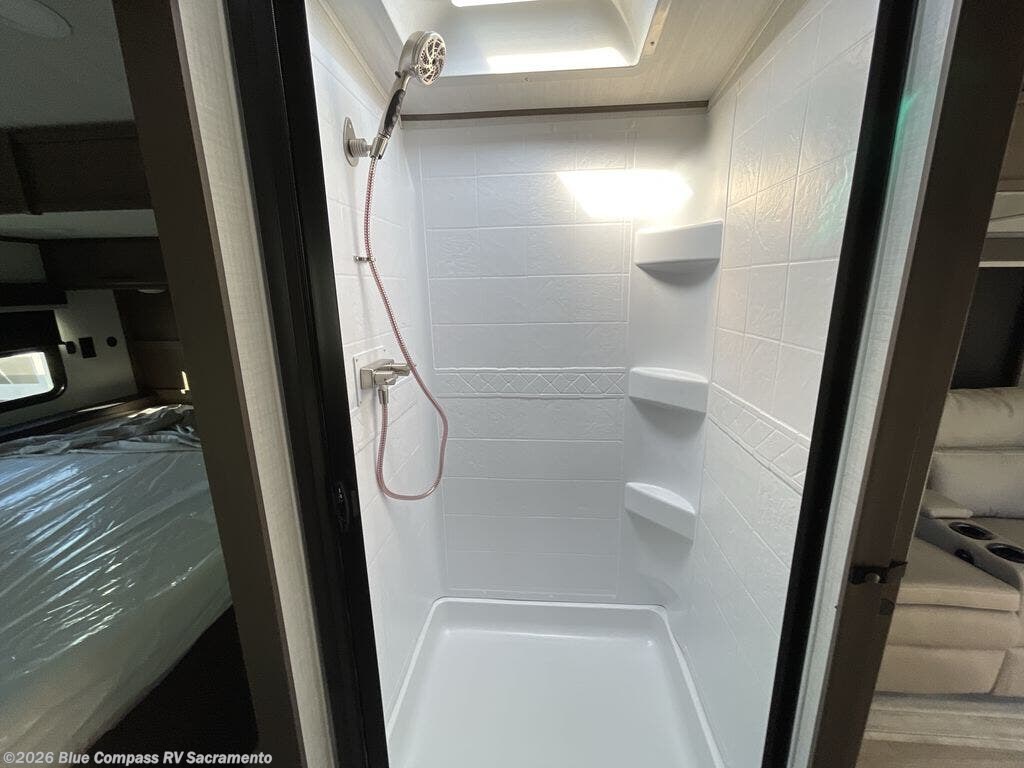 With a queen-size bed and a king bed option, this travel trailer shows that you can still be comfortable even while you're away from home! The bed slides out to provide more floor space and there is a wardrobe and dresser opposite near the private entry door. The main entry up front leads into a spacious combined kitchen and living area with the front kitchen offering plenty of counter space and overhead storage. There is a 12-volt refrigerator to the left of the entry door, and access to a walk-in pantry is right around the corner from the pivoting entertainment center opposite a tri-fold sofa sleeper and booth dinette slide. This unit also features a full-width walk-thru bath giving you plenty of room to shower and change.