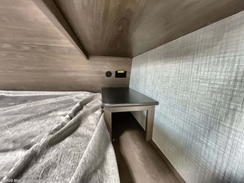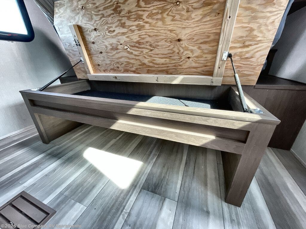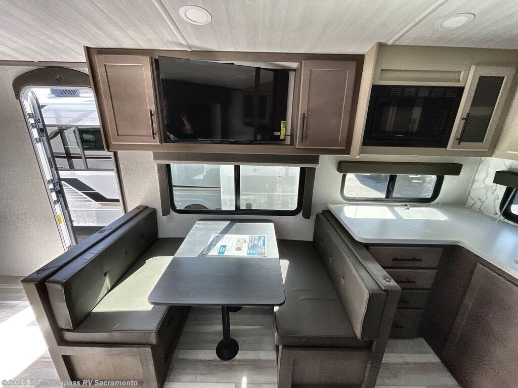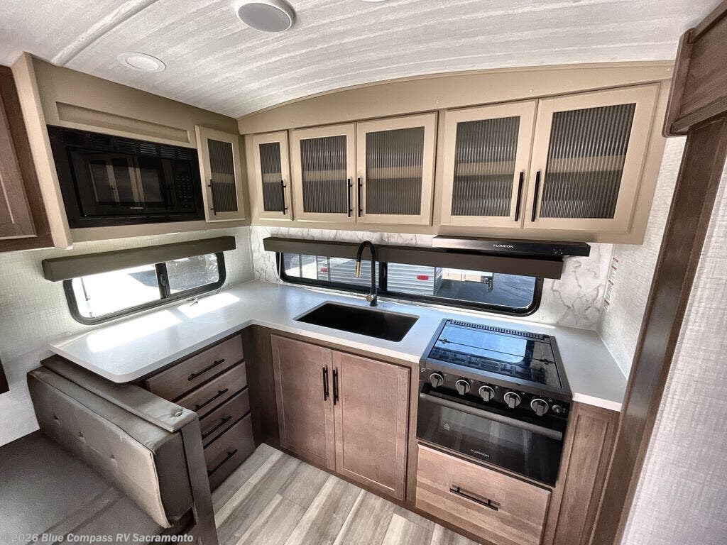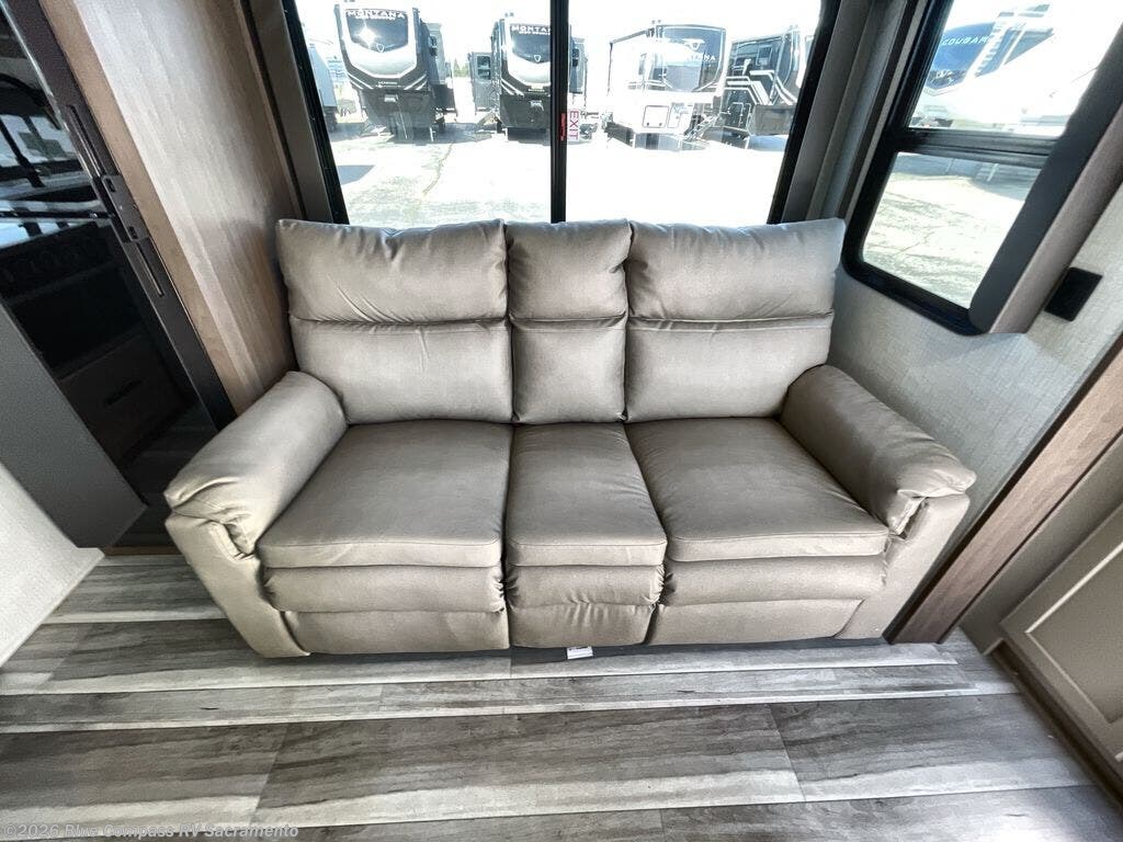 Camping trips just got better in this spacious travel trailer! The front walk-around king bed is sure to bring a great night's rest, and there are dual nightstands to keep your things tidy. A large slide out houses the three-burner range and 12V refrigerator so you can cook and store food, plus there is theater seating for ultimate relaxation. The rear of this unit is shared with the kitchen sink and countertop, plus the full bath, allowing you to easily clean up each day. Outside, you'll find an 18' electric awning with LED lighting, a rear 2" accessory hitch, plus a universal docking station for added convenience.