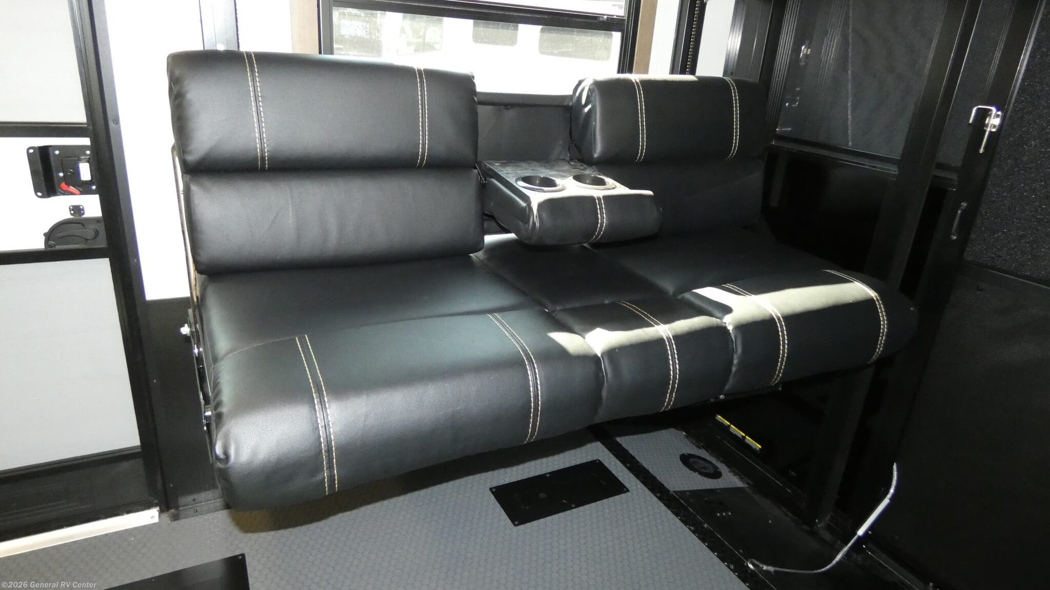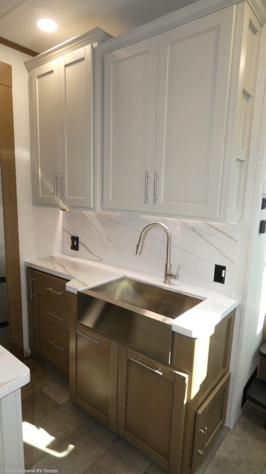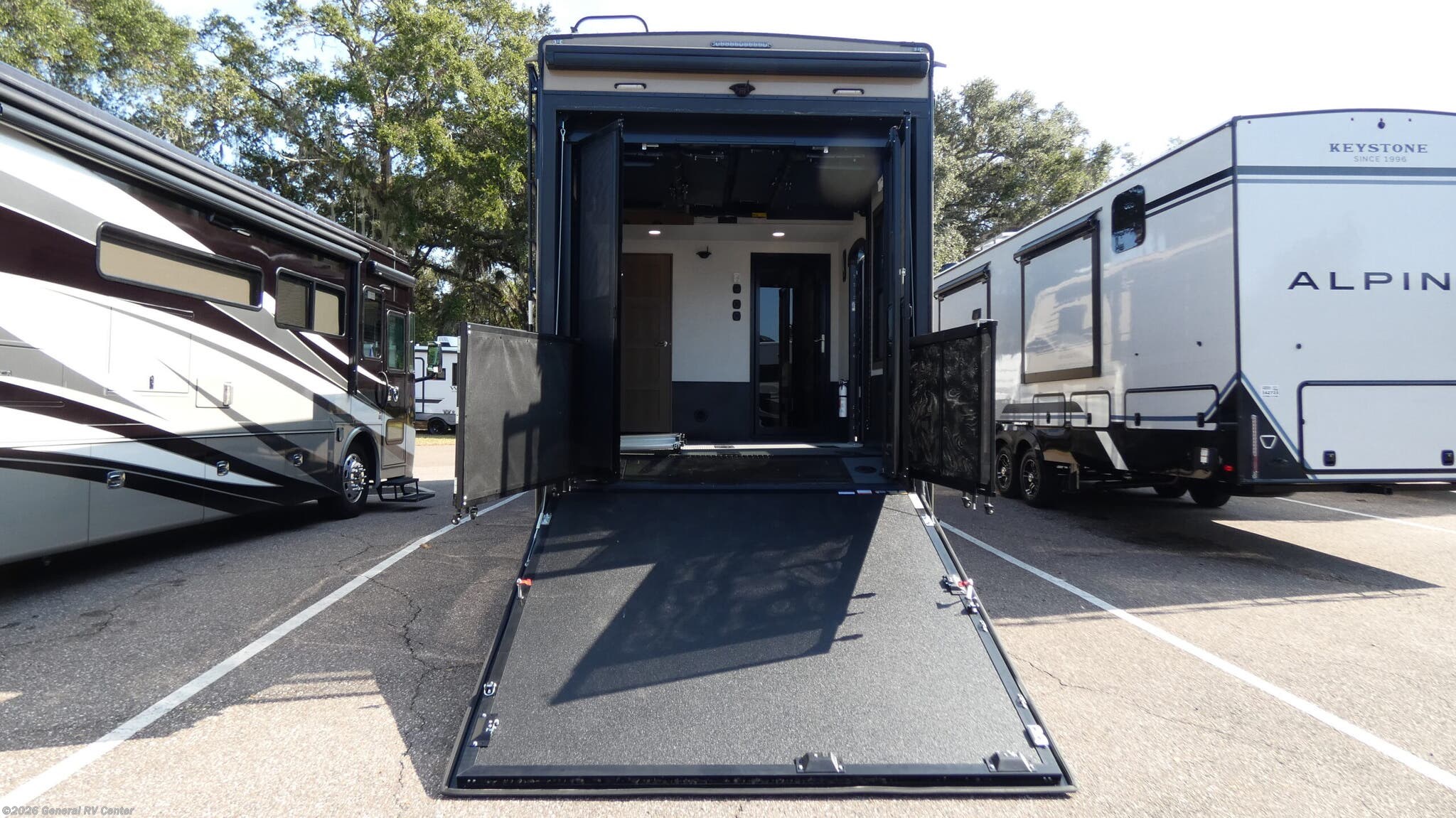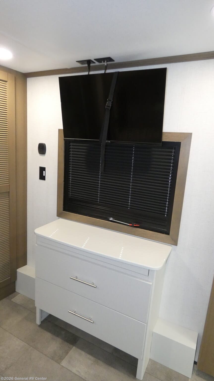 Experience the ultimate in luxury and adventure with the 2026 Keystone Fuzion 373. This RV is designed for those who crave both comfort and excitement on the road. With its spacious 39.5-foot length, this model offers a versatile living space that accommodates up to seven guests. The master suite features a plush king bed, while the garage area transforms into a cozy sleeping space with a queen bed. The convertible seating adds even more sleeping options, perfect for family and friends. The Fuzion 373 boasts a center kitchen equipped for culinary delights, featuring a four-burner cooktop and convection cooking. Enjoy meals at the stylish table with stools, and keep your ingredients fresh in the full-size electric refrigerator. The center living area is ideal for relaxation, enhanced by a 50" outdoor TV for entertainment under the stars. With three powered retractable awnings, you can create a perfect outdoor oasis. The RV also includes washer/dryer prep for added convenience during extended trips. Designed with practicality in mind, this RV offers ample storage, a residential shower, and robust tank capacities for fresh, gray, and black water. Whether you're parked at a scenic campsite or exploring off the beaten path, the Keystone Fuzion 373 ensures you travel in style and comfort. For more details or to see this model in person, visit your nearest General RV Dealership.