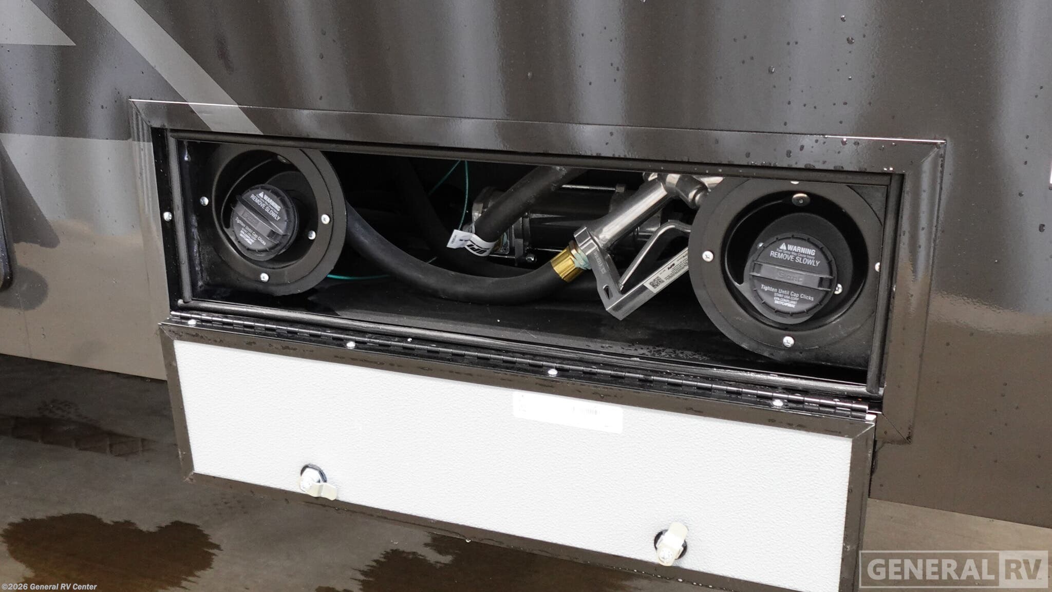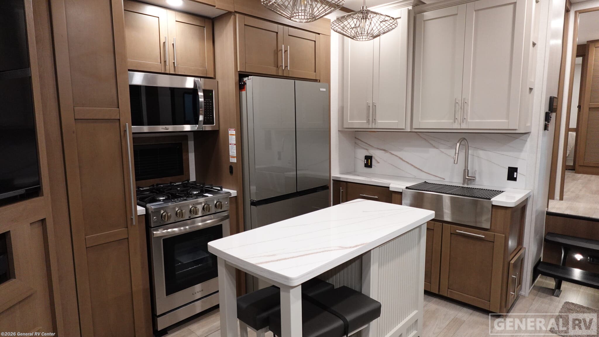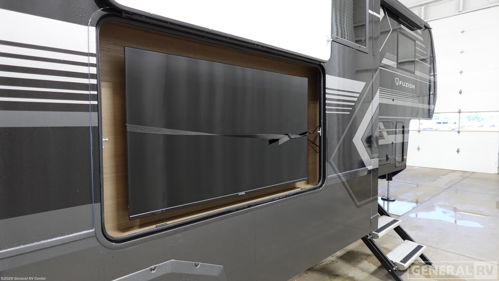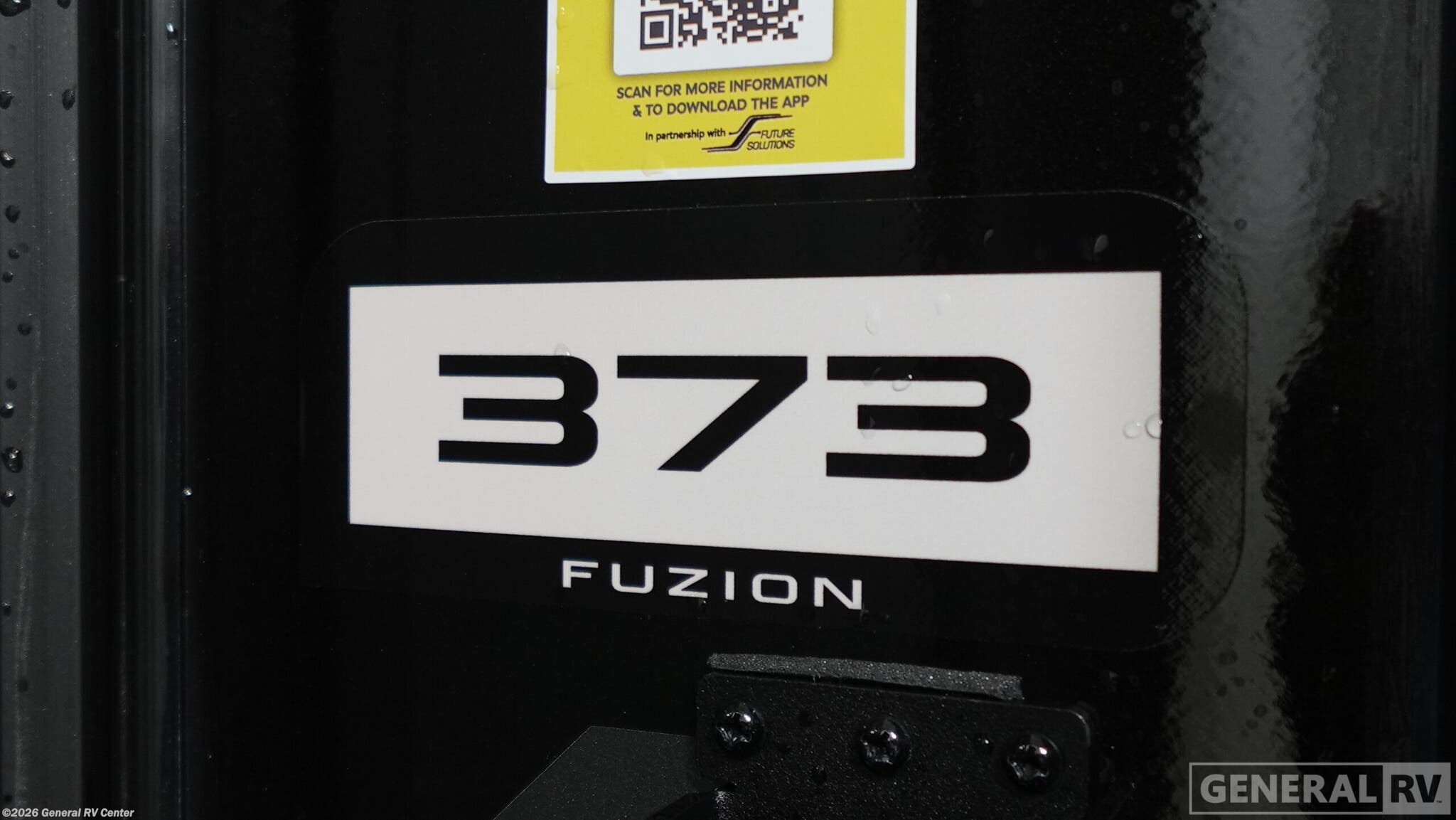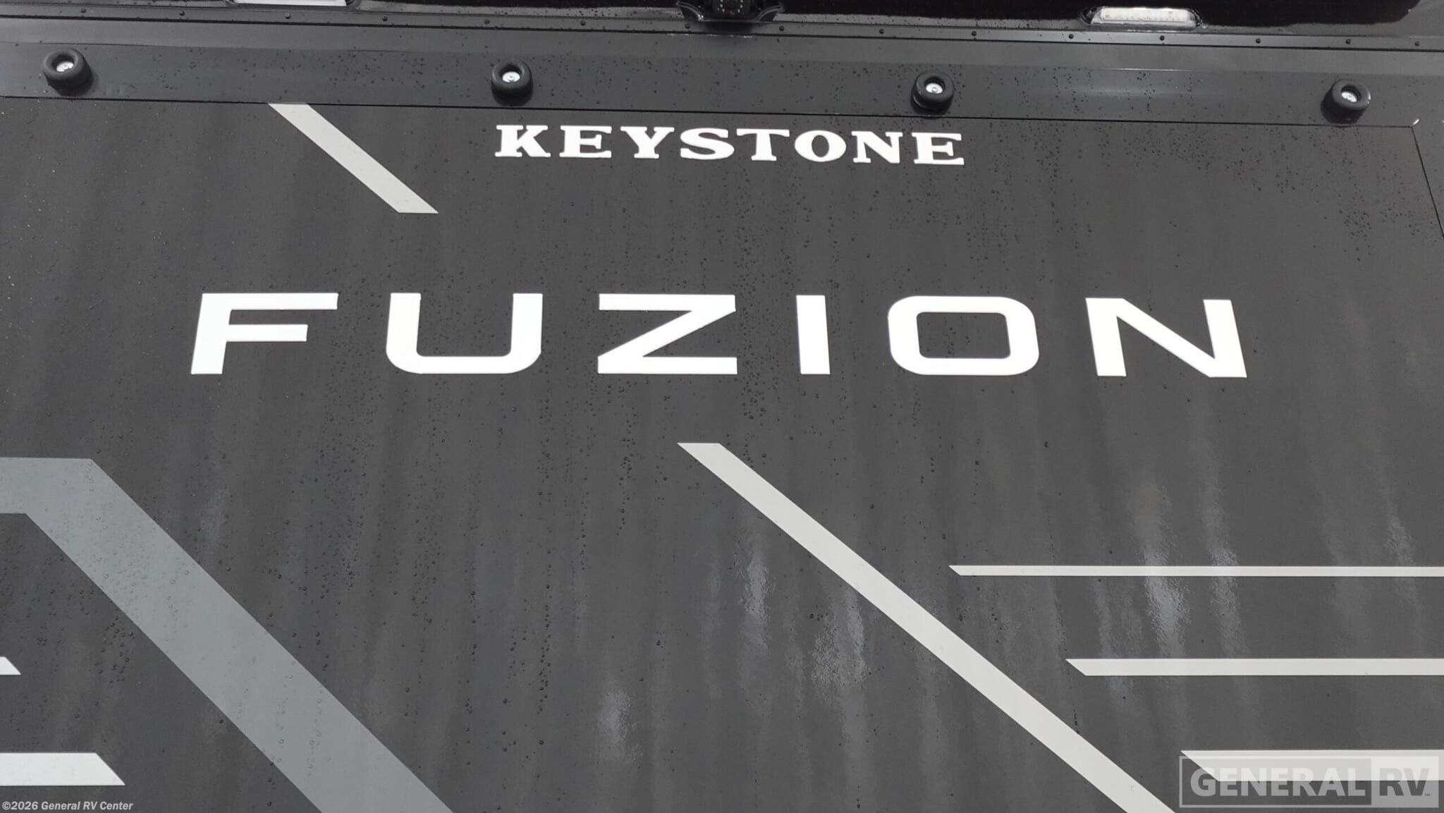 Experience the ultimate in luxury and adventure with the 2026 Keystone Fuzion 373. This RV is designed for those who crave both comfort and excitement on the road. With its spacious 39.5-foot length, this model offers a versatile living space that accommodates up to seven guests. The master suite features a plush king bed, while the garage area transforms into a cozy sleeping space with a queen bed. The convertible seating adds even more sleeping options, perfect for family and friends. The Fuzion 373 boasts a center kitchen equipped for culinary delights, featuring a four-burner cooktop and convection cooking. Enjoy meals at the stylish table with stools, and keep your ingredients fresh in the full-size electric refrigerator. The center living area is ideal for relaxation, enhanced by a 50" outdoor TV for entertainment under the stars. With three powered retractable awnings, you can create a perfect outdoor oasis. The RV also includes washer/dryer prep for added convenience during extended trips. Designed with practicality in mind, this RV offers ample storage, a residential shower, and robust tank capacities for fresh, gray, and black water. Whether you're parked at a scenic campsite or exploring off the beaten path, the Keystone Fuzion 373 ensures you travel in style and comfort. For more details or to see this model in person, visit your nearest General RV Dealership.