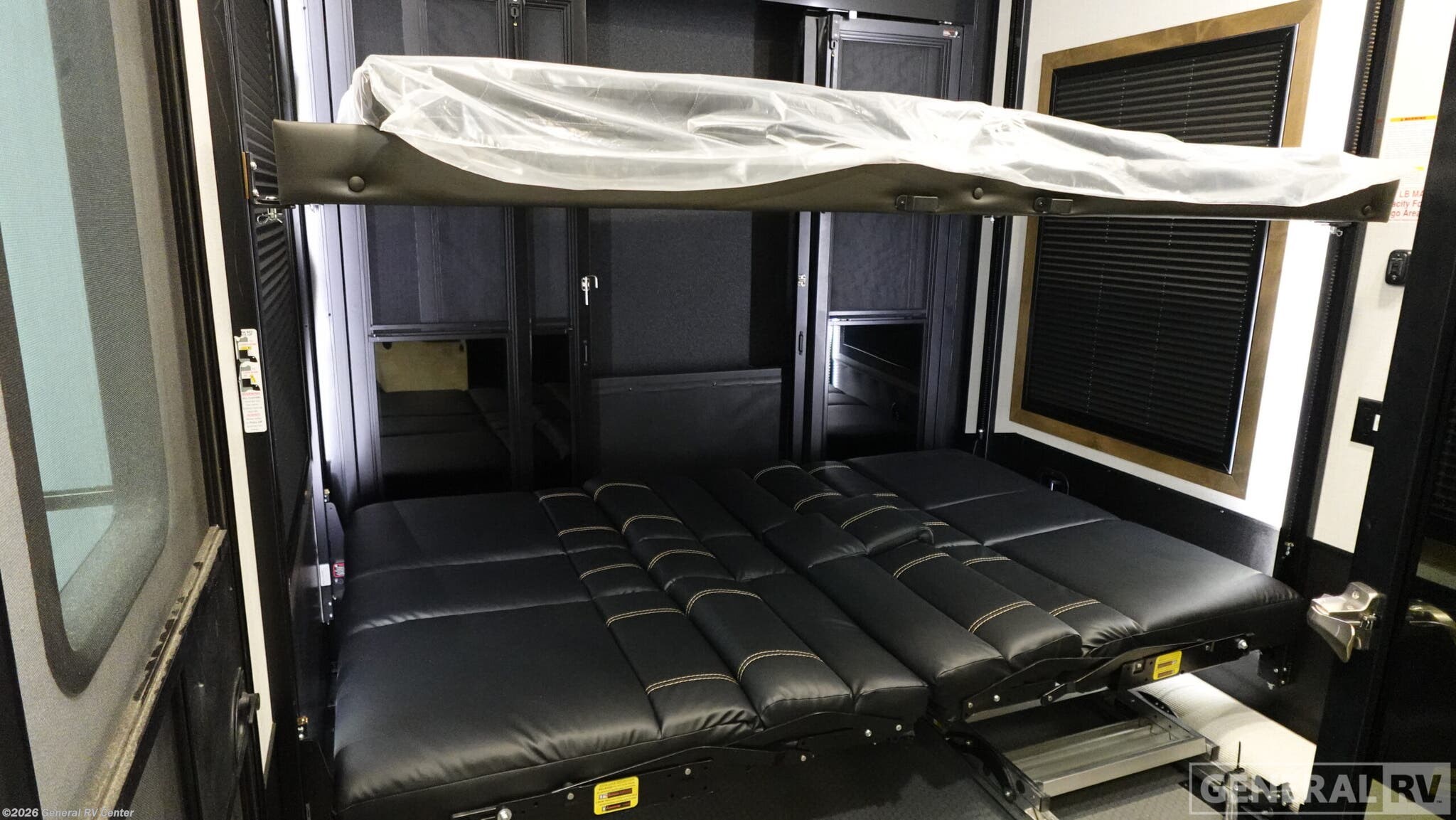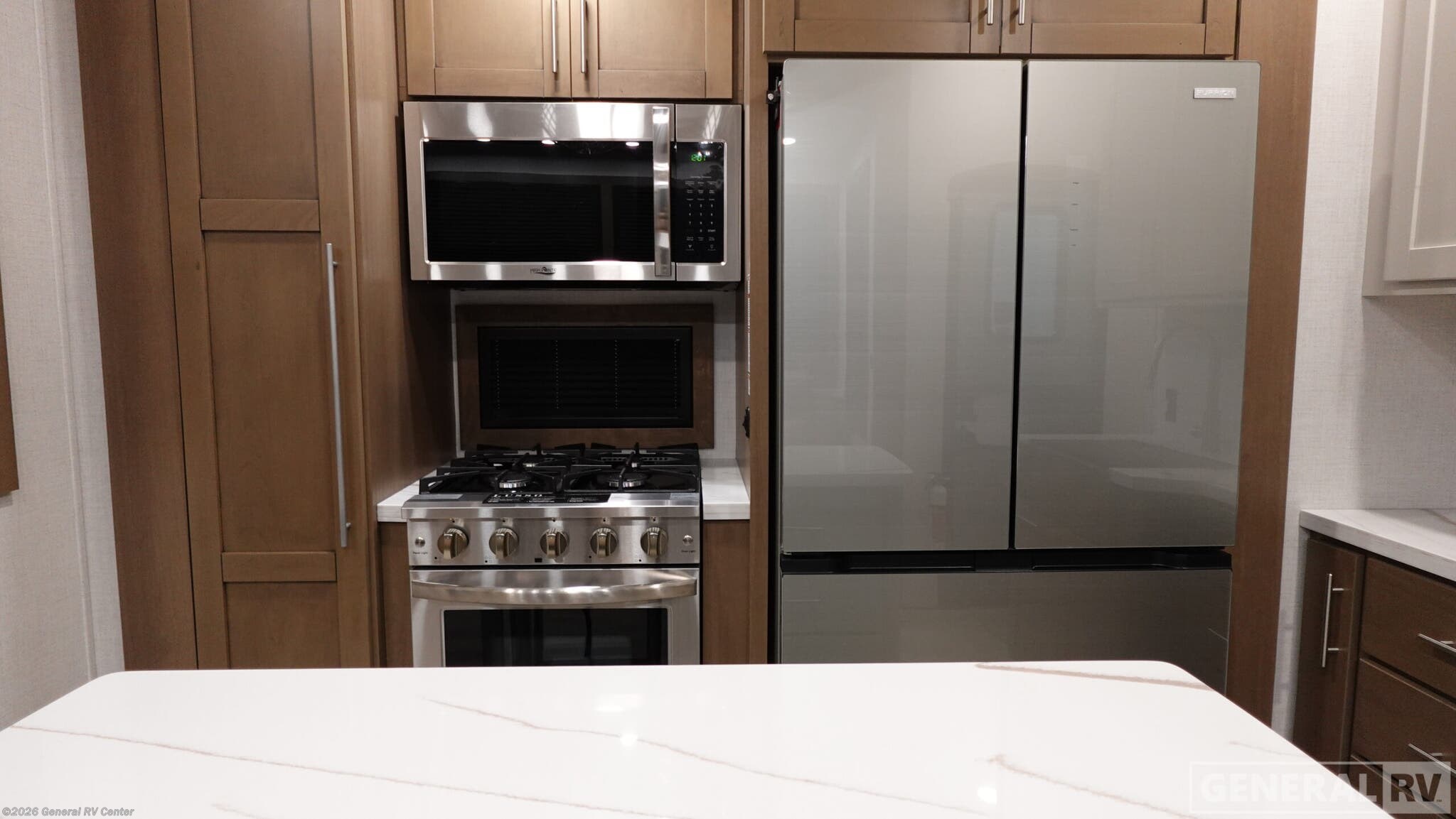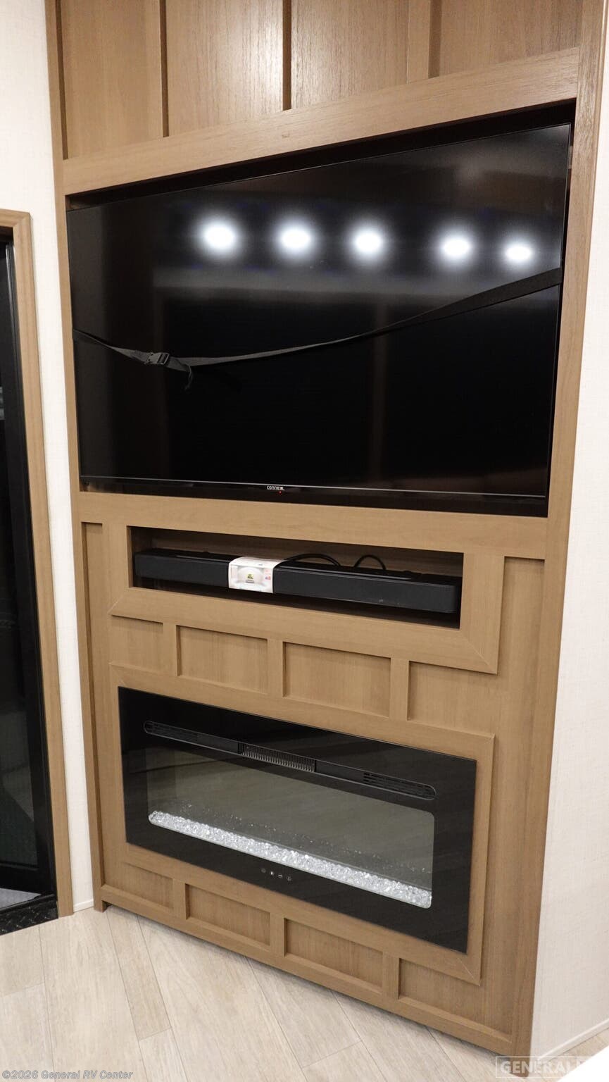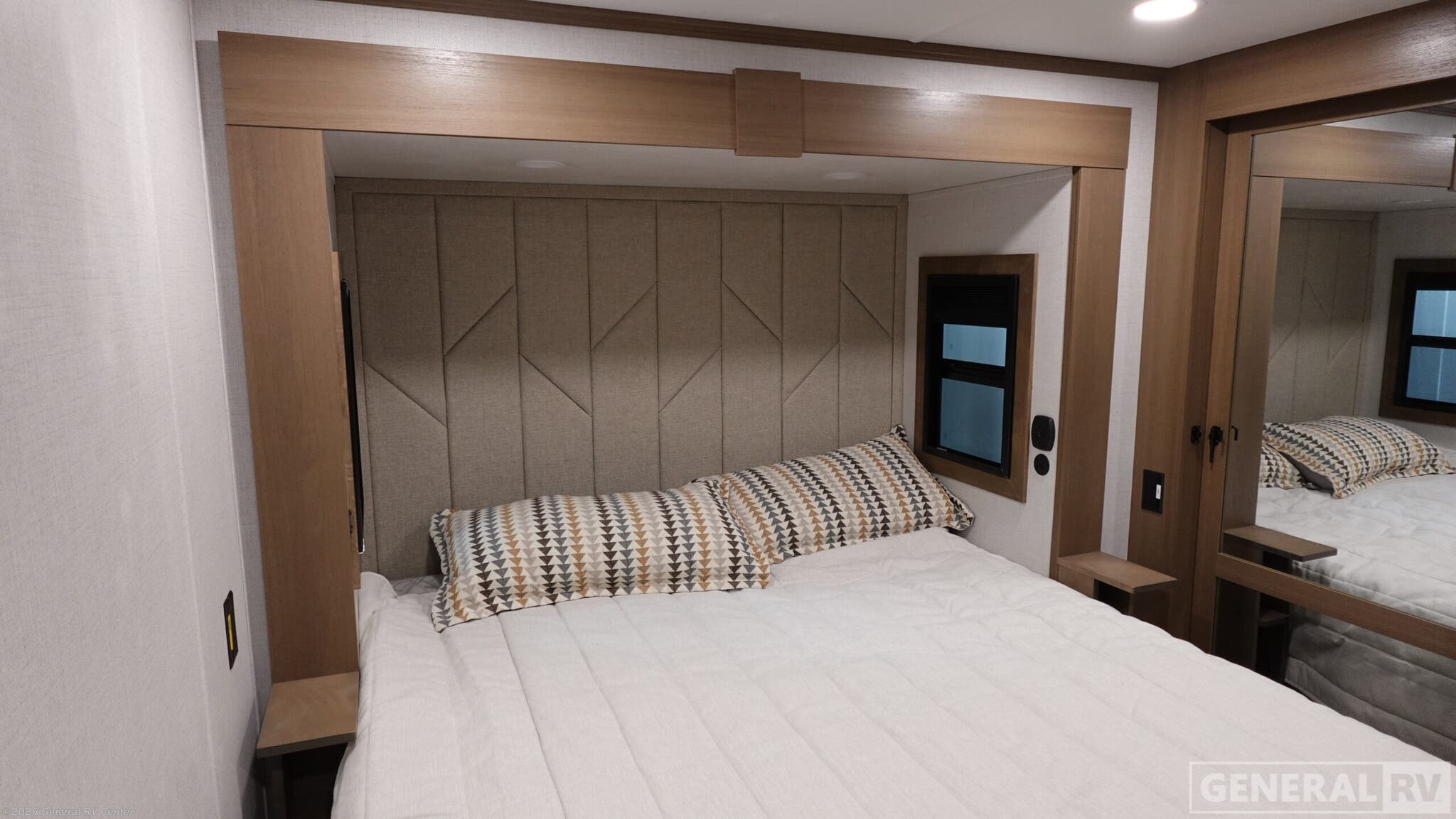 Experience the ultimate in luxury and adventure with the 2026 Keystone Fuzion 373. This RV is designed for those who crave both comfort and excitement on the road. With its spacious 39.5-foot length, this model offers a versatile living space that accommodates up to seven guests. The master suite features a plush king bed, while the garage area transforms into a cozy sleeping space with a queen bed. The convertible seating adds even more sleeping options, perfect for family and friends. The Fuzion 373 boasts a center kitchen equipped for culinary delights, featuring a four-burner cooktop and convection cooking. Enjoy meals at the stylish table with stools, and keep your ingredients fresh in the full-size electric refrigerator. The center living area is ideal for relaxation, enhanced by a 50" outdoor TV for entertainment under the stars. With three powered retractable awnings, you can create a perfect outdoor oasis. The RV also includes washer/dryer prep for added convenience during extended trips. Designed with practicality in mind, this RV offers ample storage, a residential shower, and robust tank capacities for fresh, gray, and black water. Whether you're parked at a scenic campsite or exploring off the beaten path, the Keystone Fuzion 373 ensures you travel in style and comfort. For more details or to see this model in person, visit your nearest General RV Dealership.