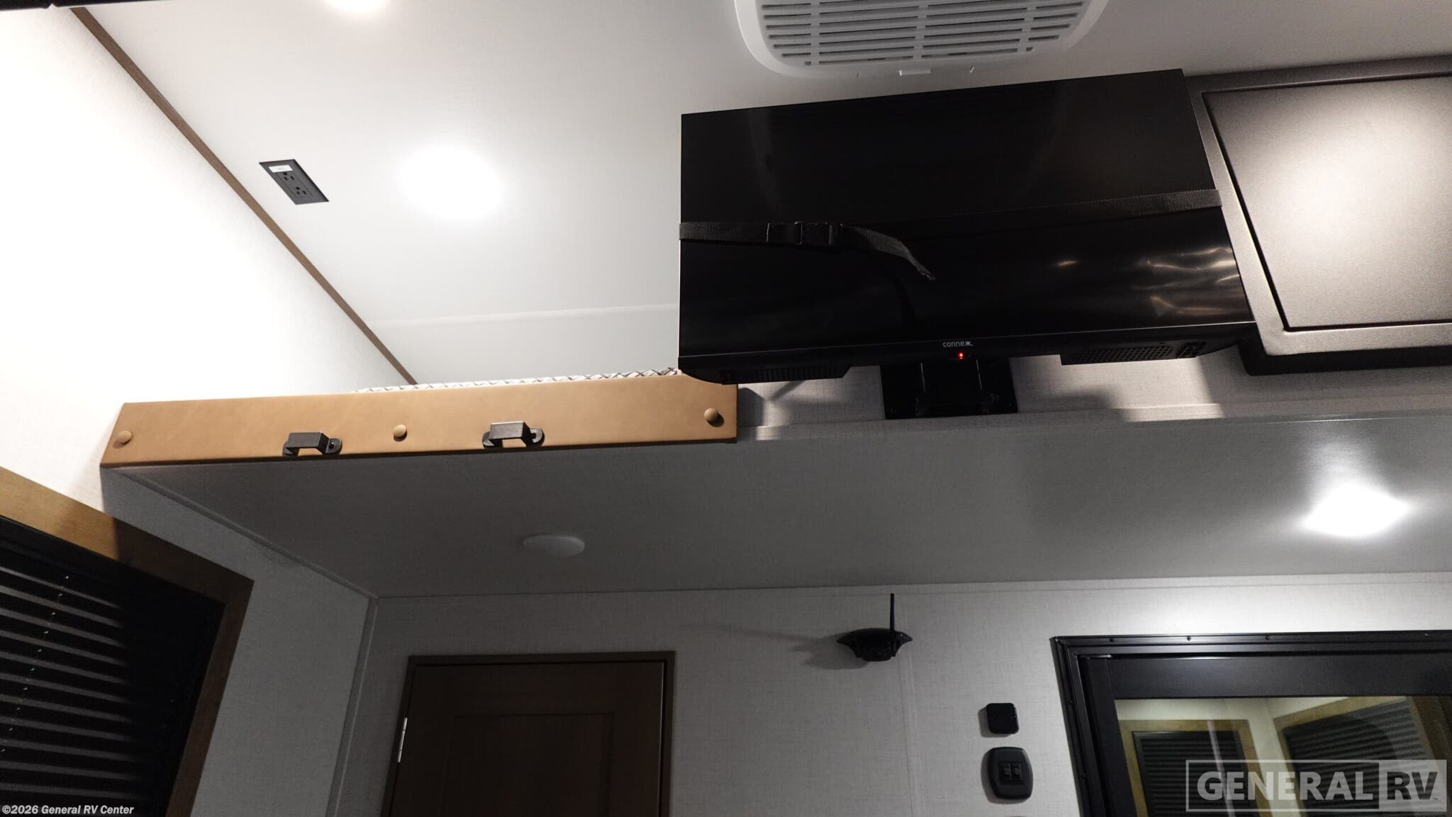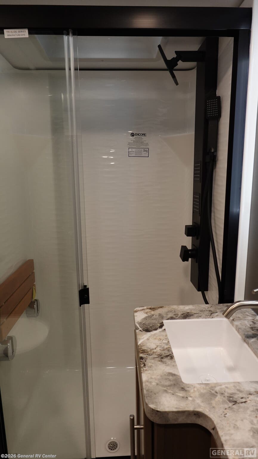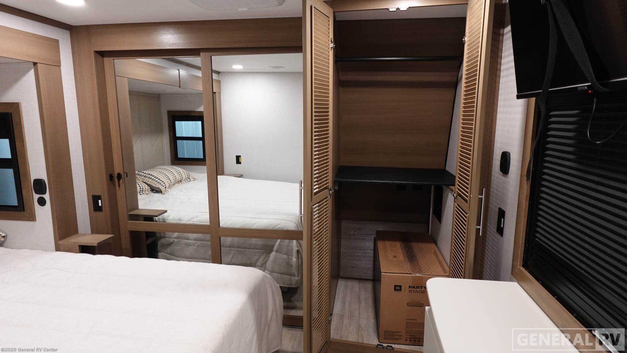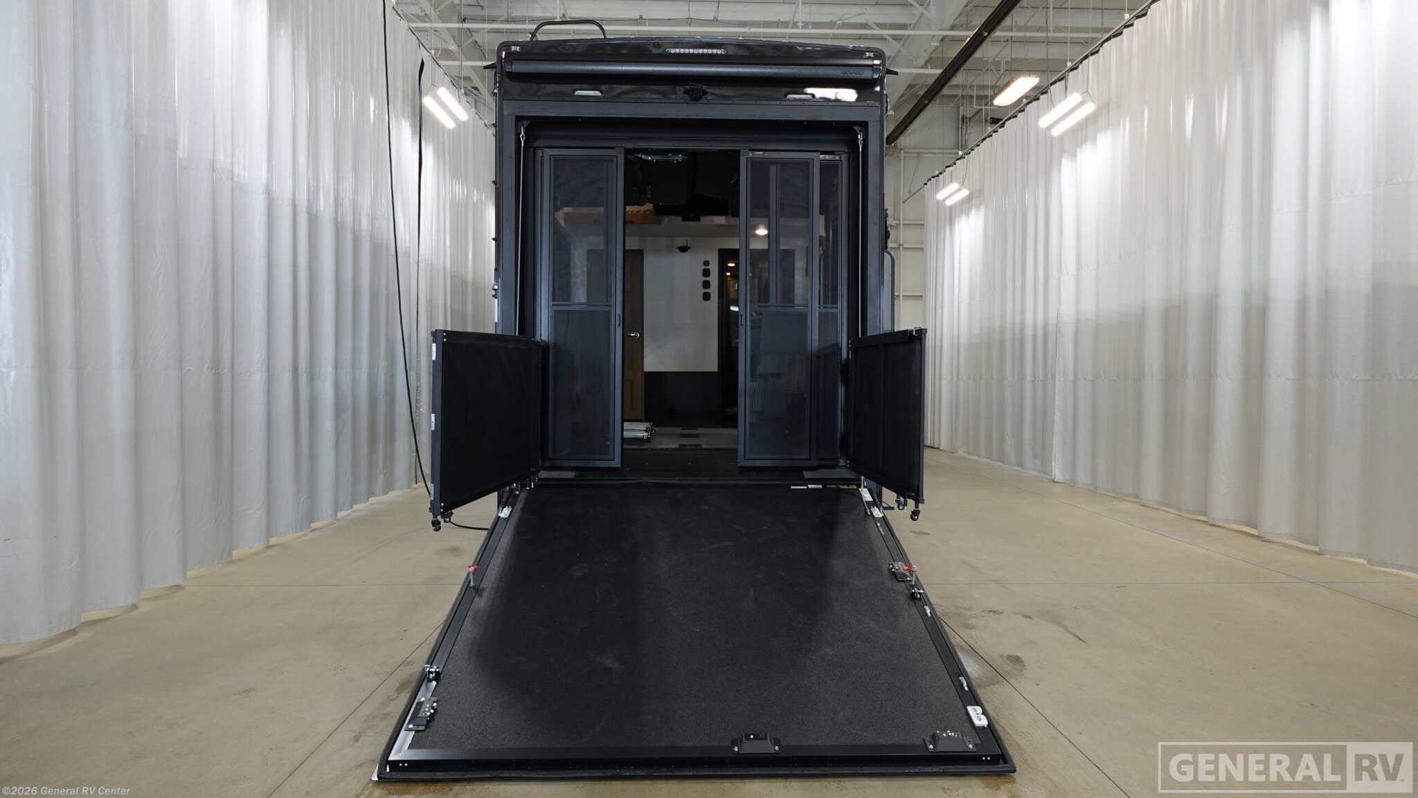 Experience the ultimate in luxury and adventure with the 2026 Keystone Fuzion 373. This RV is designed for those who crave both comfort and excitement on the road. With its spacious 39.5-foot length, this model offers a versatile living space that accommodates up to seven guests. The master suite features a plush king bed, while the garage area transforms into a cozy sleeping space with a queen bed. The convertible seating adds even more sleeping options, perfect for family and friends. The Fuzion 373 boasts a center kitchen equipped for culinary delights, featuring a four-burner cooktop and convection cooking. Enjoy meals at the stylish table with stools, and keep your ingredients fresh in the full-size electric refrigerator. The center living area is ideal for relaxation, enhanced by a 50" outdoor TV for entertainment under the stars. With three powered retractable awnings, you can create a perfect outdoor oasis. The RV also includes washer/dryer prep for added convenience during extended trips. Designed with practicality in mind, this RV offers ample storage, a residential shower, and robust tank capacities for fresh, gray, and black water. Whether you're parked at a scenic campsite or exploring off the beaten path, the Keystone Fuzion 373 ensures you travel in style and comfort. For more details or to see this model in person, visit your nearest General RV Dealership.