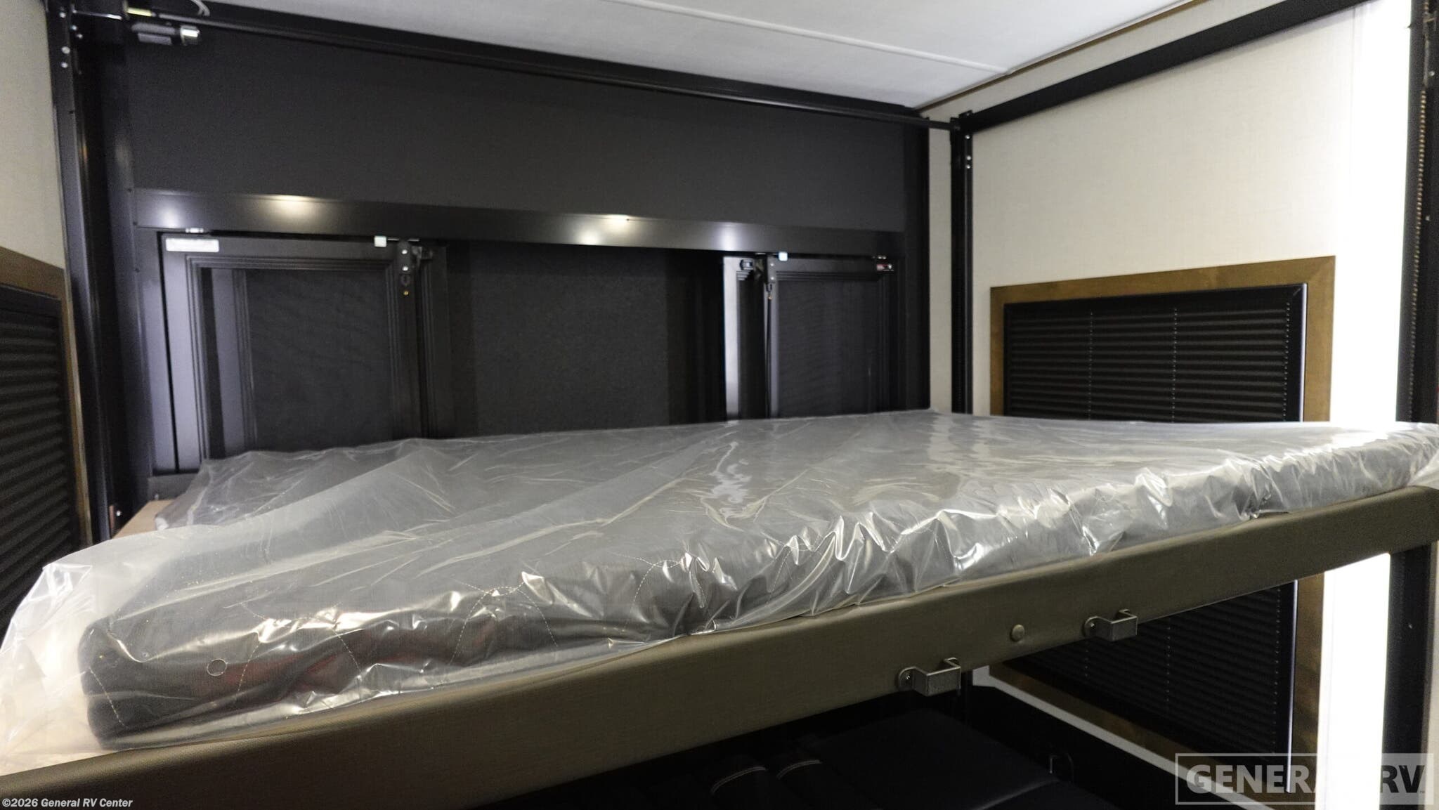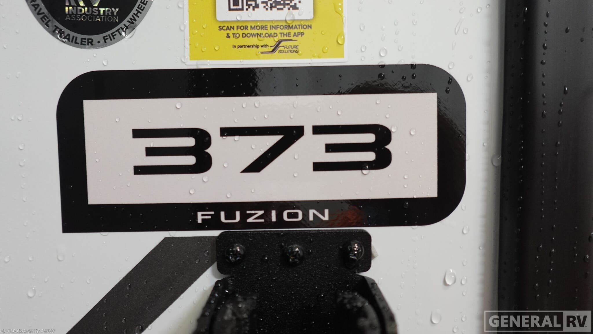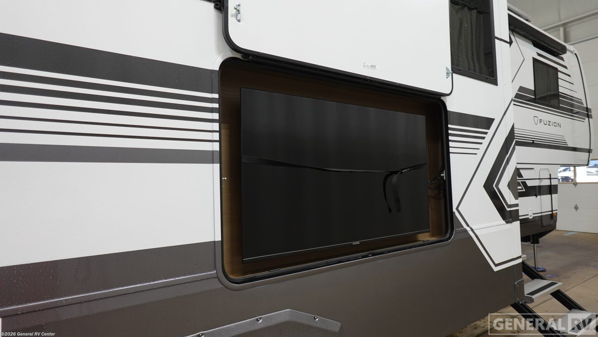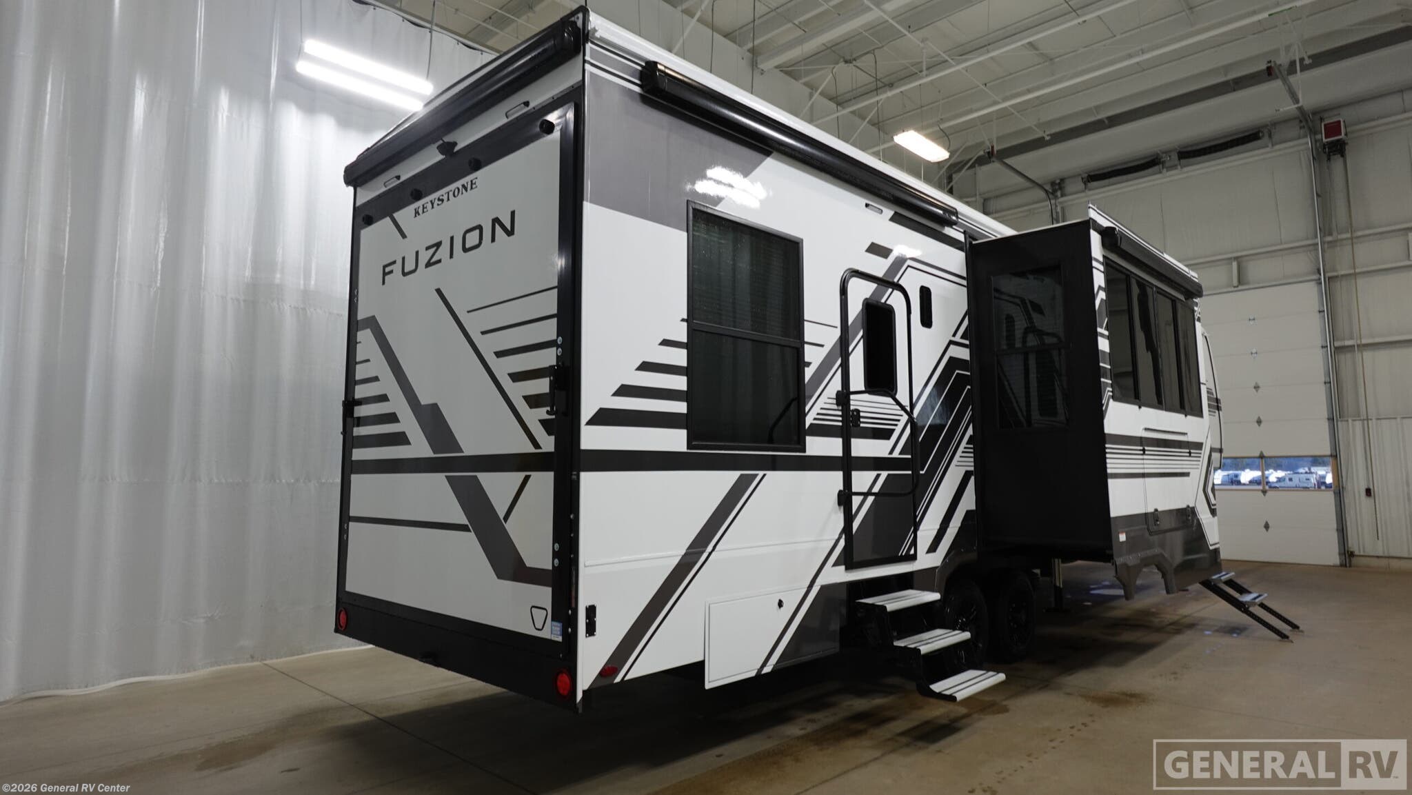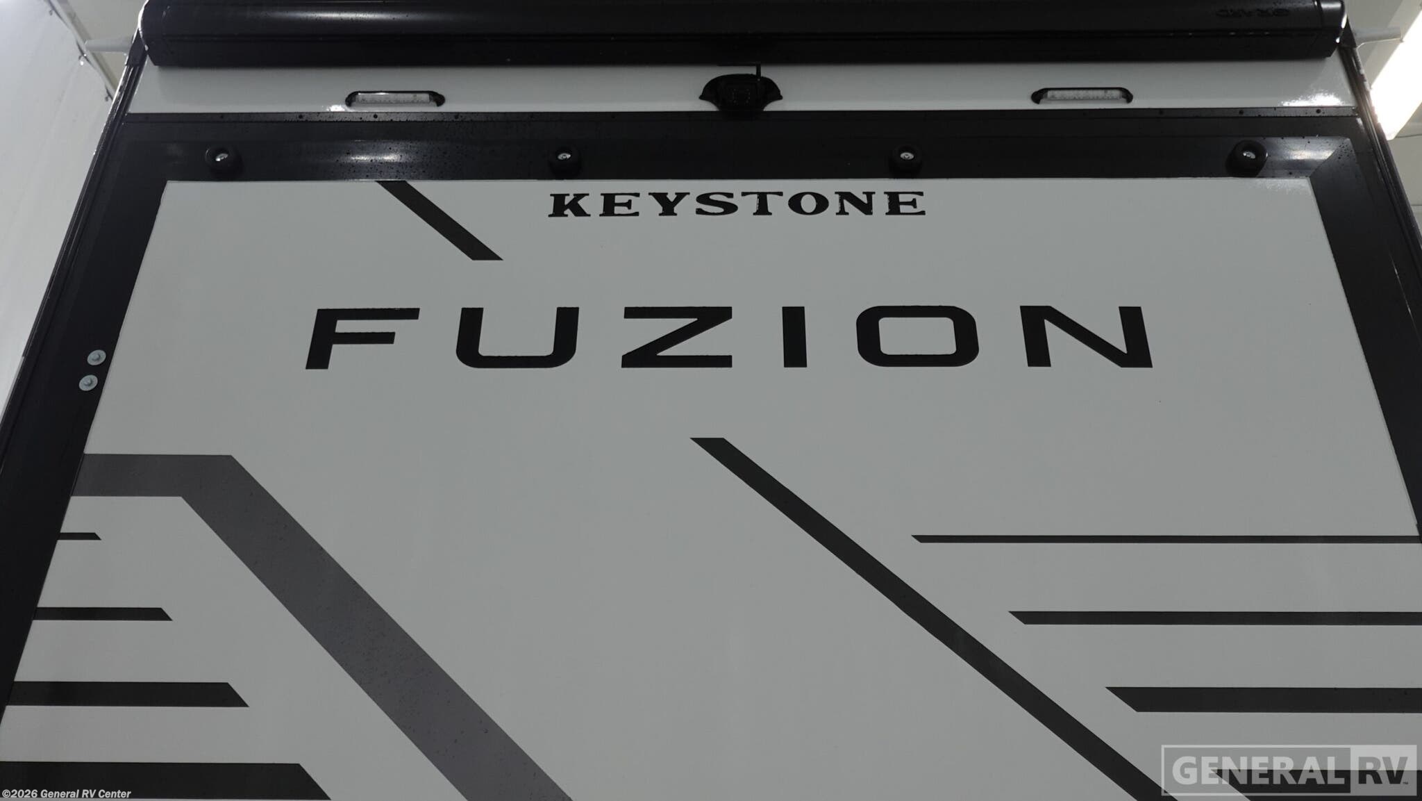 Experience the ultimate in luxury and adventure with the 2026 Keystone Fuzion 373. This RV is designed for those who crave both comfort and excitement on the road. With its spacious 39.5-foot length, this model offers a versatile living space that accommodates up to seven guests. The master suite features a plush king bed, while the garage area transforms into a cozy sleeping space with a queen bed. The convertible seating adds even more sleeping options, perfect for family and friends. The Fuzion 373 boasts a center kitchen equipped for culinary delights, featuring a four-burner cooktop and convection cooking. Enjoy meals at the stylish table with stools, and keep your ingredients fresh in the full-size electric refrigerator. The center living area is ideal for relaxation, enhanced by a 50" outdoor TV for entertainment under the stars. With three powered retractable awnings, you can create a perfect outdoor oasis. The RV also includes washer/dryer prep for added convenience during extended trips. Designed with practicality in mind, this RV offers ample storage, a residential shower, and robust tank capacities for fresh, gray, and black water. Whether you're parked at a scenic campsite or exploring off the beaten path, the Keystone Fuzion 373 ensures you travel in style and comfort. For more details or to see this model in person, visit your nearest General RV Dealership.