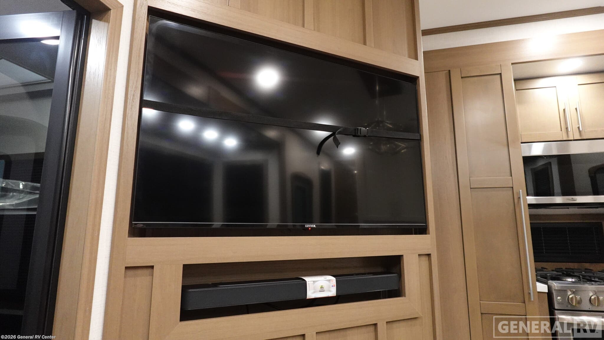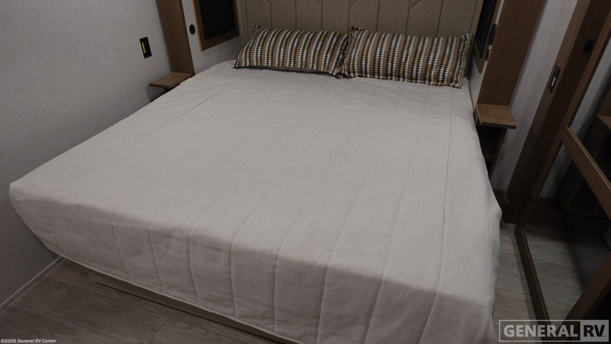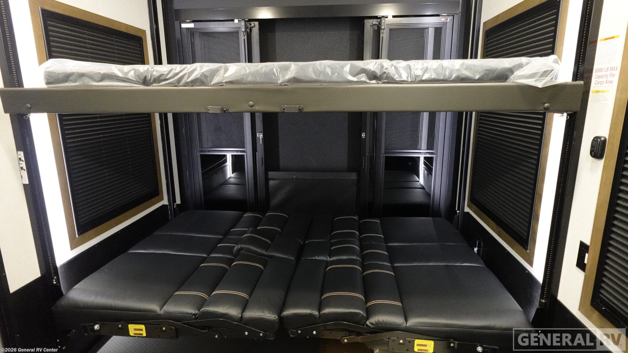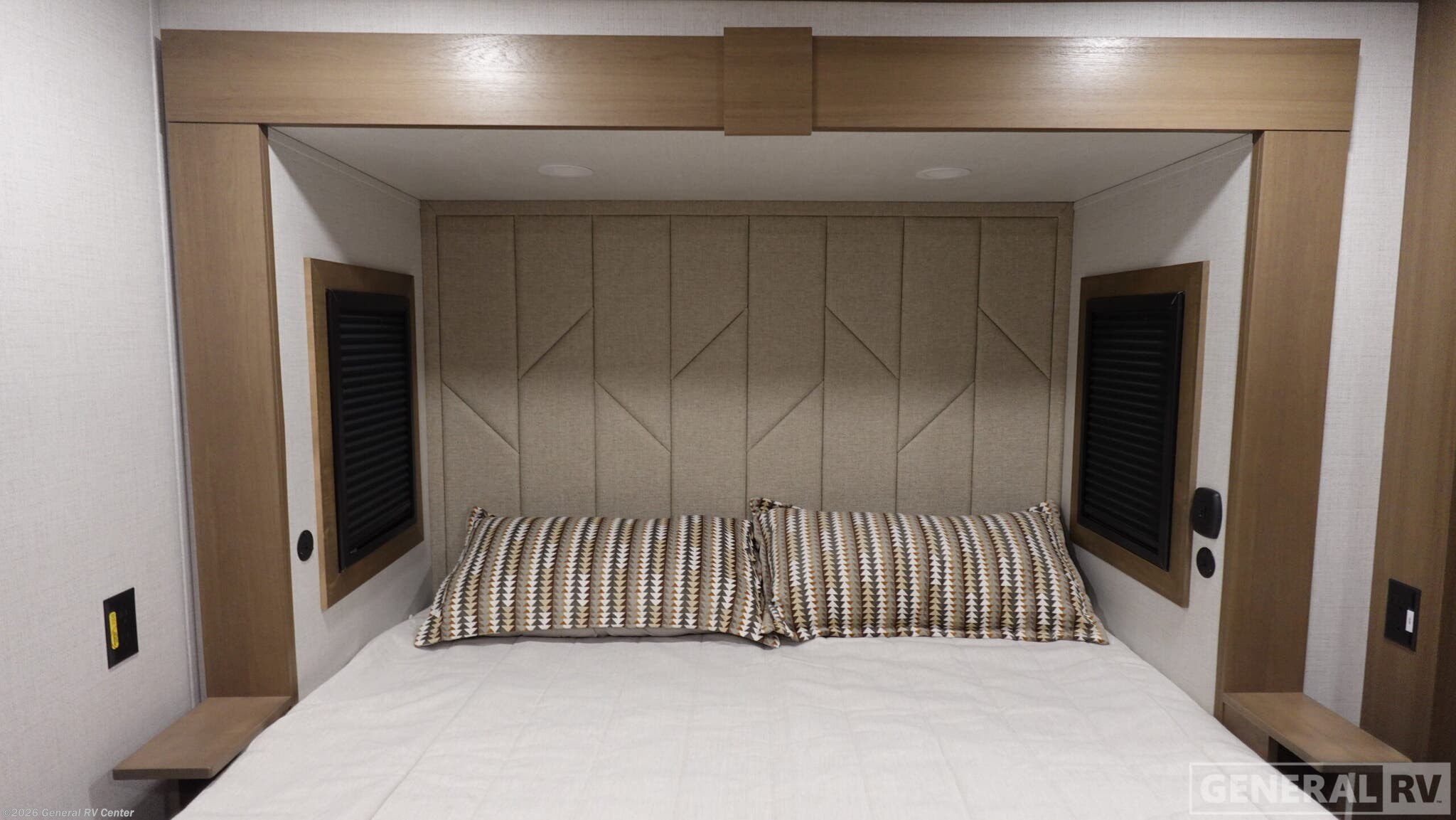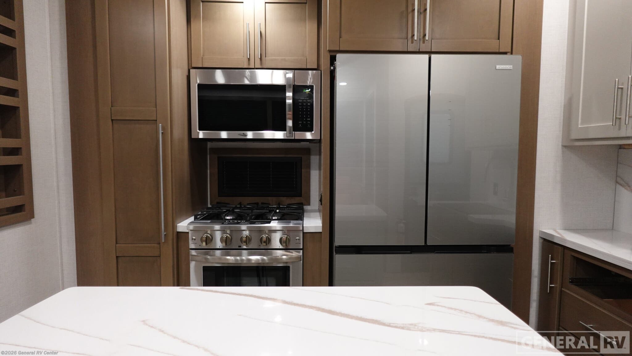 Experience the ultimate in luxury and adventure with the 2026 Keystone Fuzion 373. This RV is designed for those who crave both comfort and excitement on the road. With its spacious 39.5-foot length, this model offers a versatile living space that accommodates up to seven guests. The master suite features a plush king bed, while the garage area transforms into a cozy sleeping space with a queen bed. The convertible seating adds even more sleeping options, perfect for family and friends. The Fuzion 373 boasts a center kitchen equipped for culinary delights, featuring a four-burner cooktop and convection cooking. Enjoy meals at the stylish table with stools, and keep your ingredients fresh in the full-size electric refrigerator. The center living area is ideal for relaxation, enhanced by a 50" outdoor TV for entertainment under the stars. With three powered retractable awnings, you can create a perfect outdoor oasis. The RV also includes washer/dryer prep for added convenience during extended trips. Designed with practicality in mind, this RV offers ample storage, a residential shower, and robust tank capacities for fresh, gray, and black water. Whether you're parked at a scenic campsite or exploring off the beaten path, the Keystone Fuzion 373 ensures you travel in style and comfort. For more details or to see this model in person, visit your nearest General RV Dealership.
