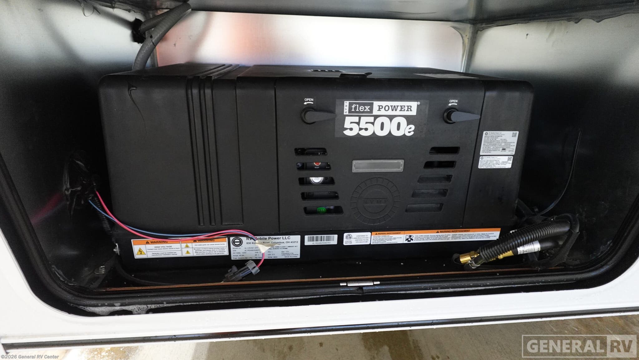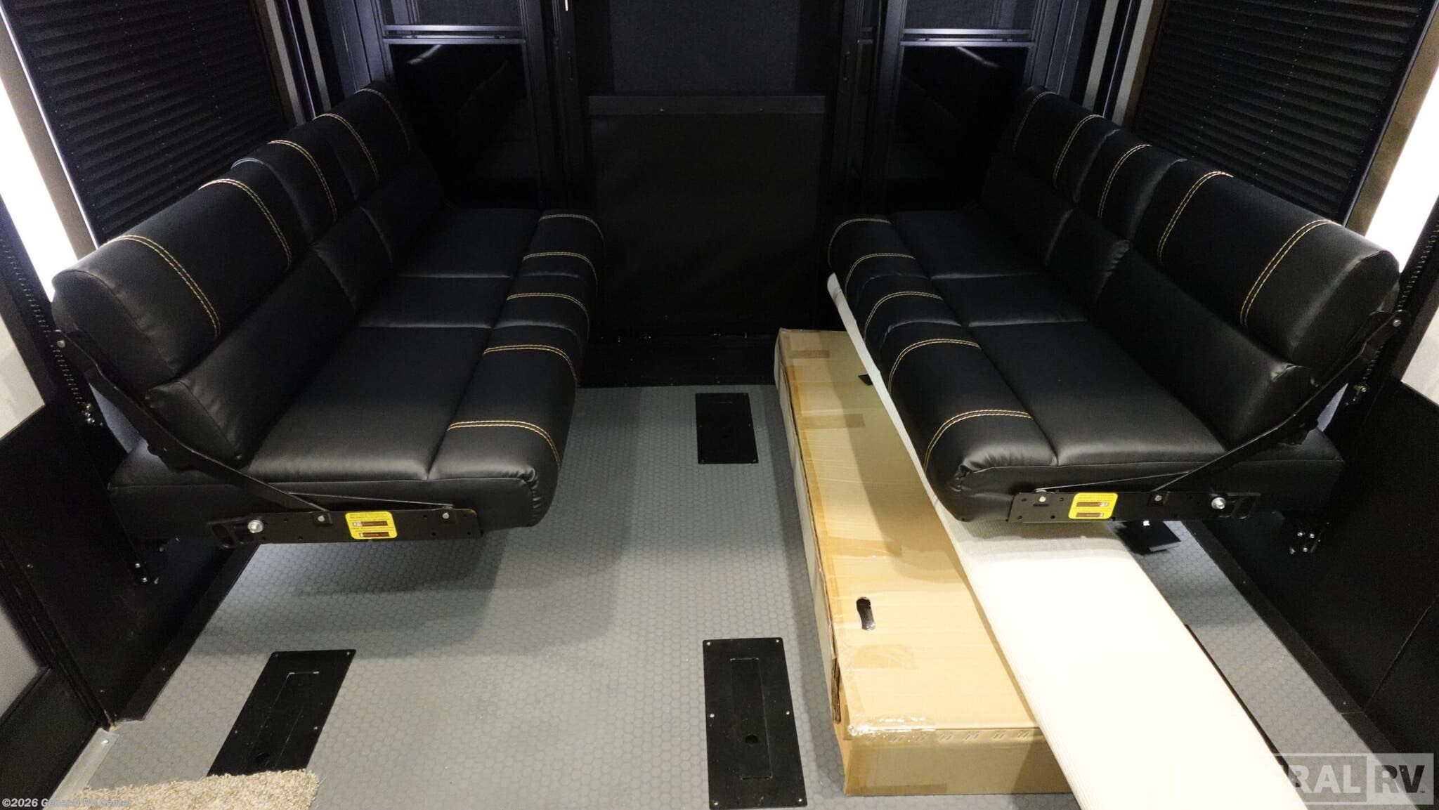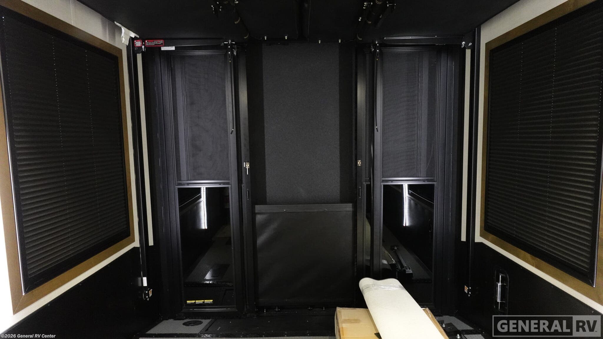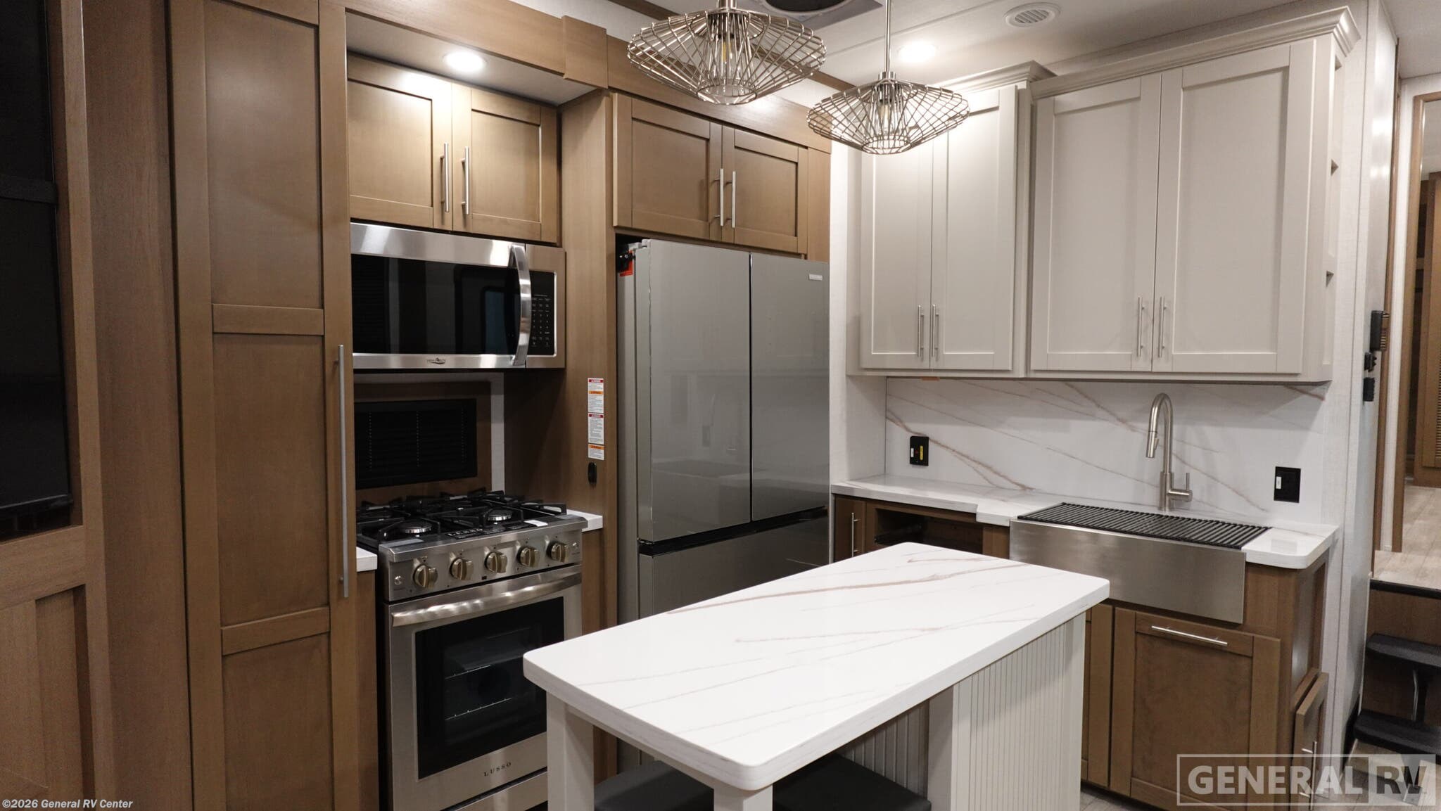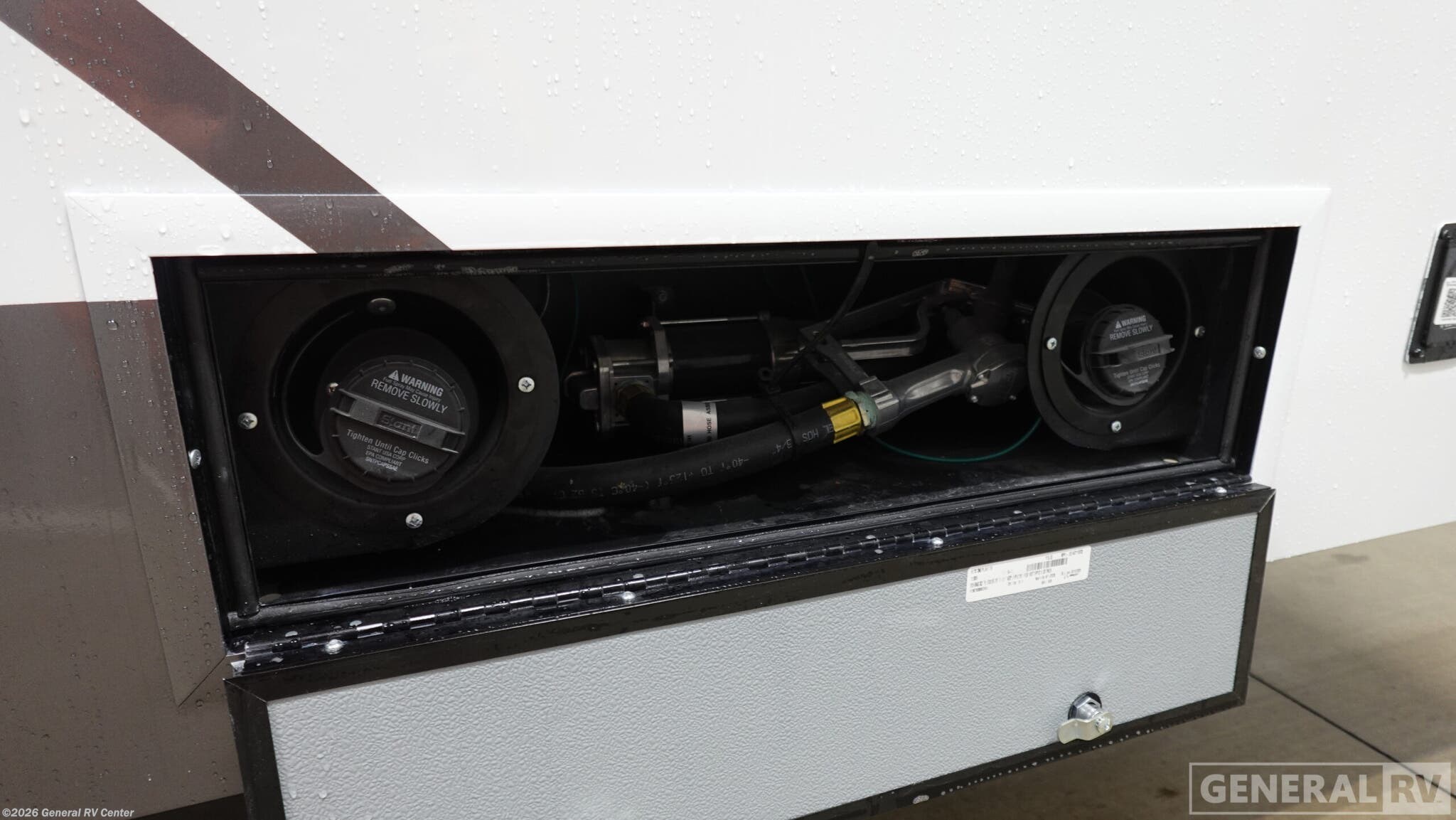 Experience the ultimate in luxury and adventure with the 2026 Keystone Fuzion 373. This RV is designed for those who crave both comfort and excitement on the road. With its spacious 39.5-foot length, this model offers a versatile living space that accommodates up to seven guests. The master suite features a plush king bed, while the garage area transforms into a cozy sleeping space with a queen bed. The convertible seating adds even more sleeping options, perfect for family and friends. The Fuzion 373 boasts a center kitchen equipped for culinary delights, featuring a four-burner cooktop and convection cooking. Enjoy meals at the stylish table with stools, and keep your ingredients fresh in the full-size electric refrigerator. The center living area is ideal for relaxation, enhanced by a 50" outdoor TV for entertainment under the stars. With three powered retractable awnings, you can create a perfect outdoor oasis. The RV also includes washer/dryer prep for added convenience during extended trips. Designed with practicality in mind, this RV offers ample storage, a residential shower, and robust tank capacities for fresh, gray, and black water. Whether you're parked at a scenic campsite or exploring off the beaten path, the Keystone Fuzion 373 ensures you travel in style and comfort. For more details or to see this model in person, visit your nearest General RV Dealership.