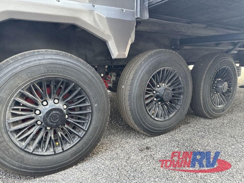 Adventure is just around the corner in this triple slide out, triple axle toy hauler. Once your toys are unloaded from the 13' 6" separate garage, you can relax on the dual opposing sofas that include a top queen bed for nighttime use. There is also a loft with a bunk mat here, overhead cabinets for storage, and an LED TV to watch the big game. The living area is where everyone can come together since there is a large L-shaped sofa, theater seating, and an entertainment center with a fireplace. You'll love the kitchen with its ample counter space, two pull-out pantries, a pull-out trash can, and residential refrigerator. You'll find the front private bedroom to be ultra accommodating with its master closet, dresser with hidden storage, LED TV, plus washer and dryer prep. And we saved the best for last! This unit also includes two full baths to make camping with friends and family easier than ever!