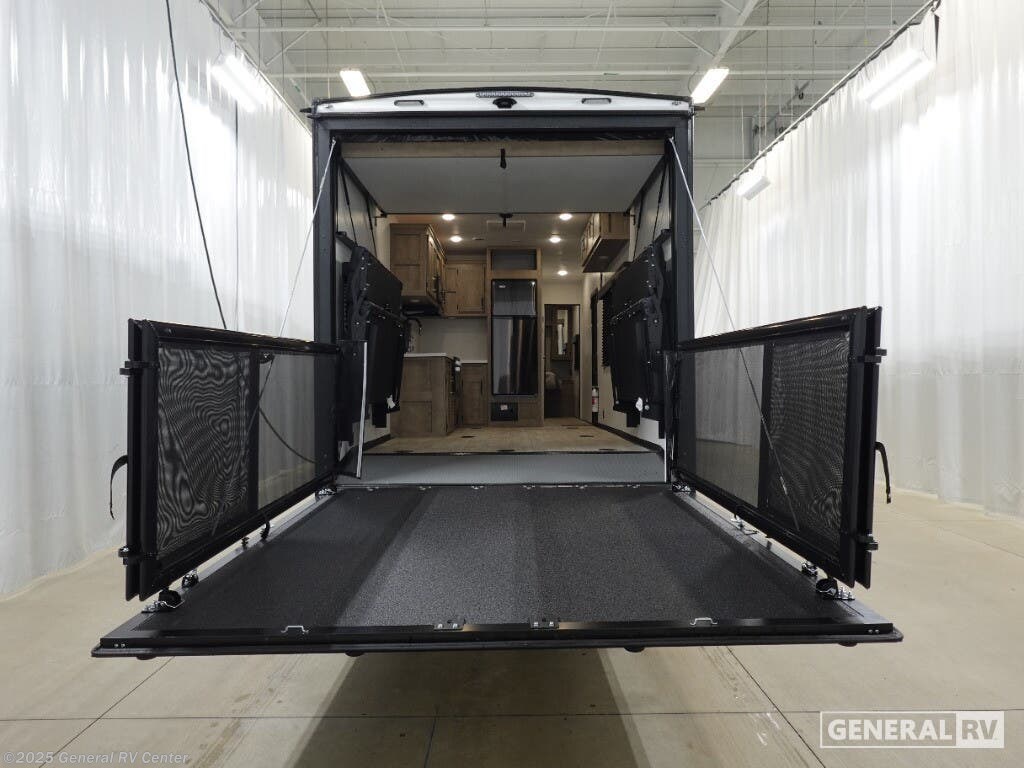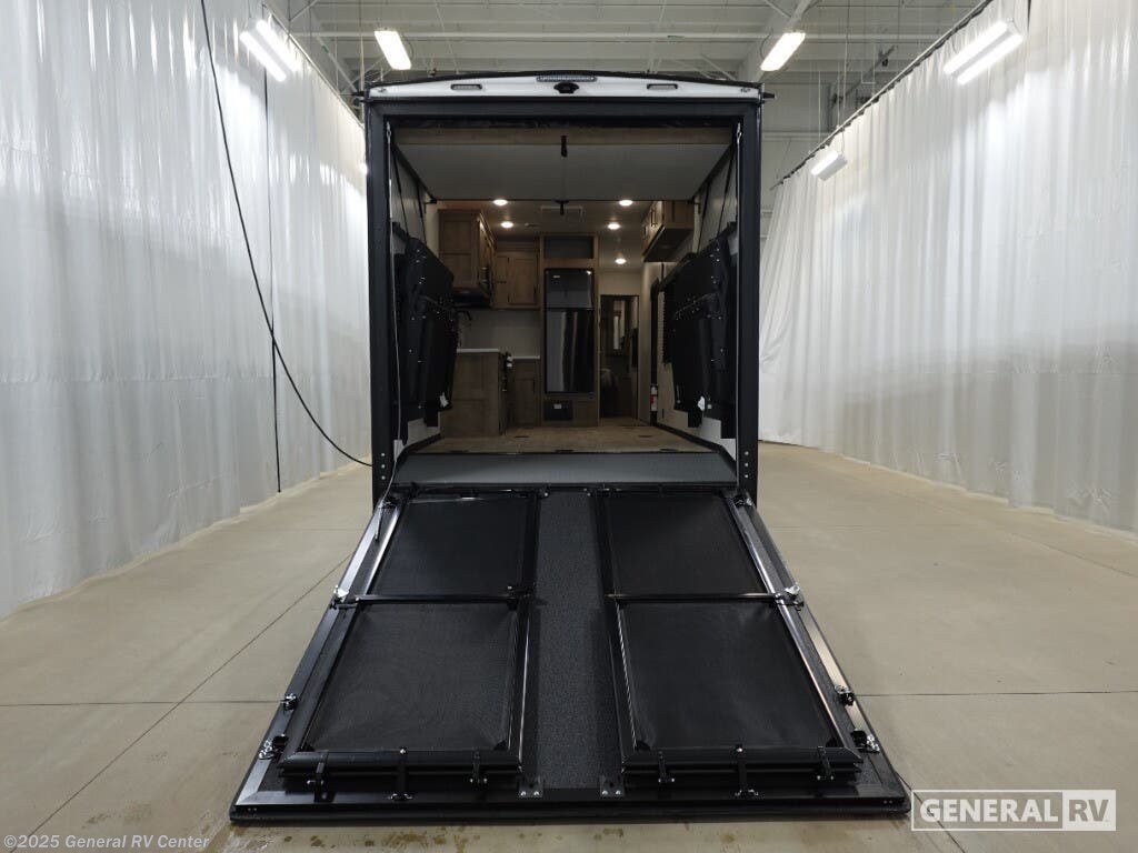 Keystone Fuzion Impact Edition toy hauler 2813 highlights: RV Queen Bed 10 Cu. Ft. 12V Refrigerator 8' Garage Door Aluminum Exterior This open concept toy hauler is sure to meet all of your needs. There is a full kitchen with a Furrion three burner gas range and a microwave oven to prepare meals, plus a 10 cu. ft. 12V refrigerator to keep food fresh. You'll find comfortable seating space on the dual opposing sofas with a top queen bed, and there is an entertainment center. The RV queen bed in the front master bedroom will bring a great night's rest, and the dual entry bath lets you clean up after trail riding. When you're ready to head home, the 13' 4" garage area includes frame welded tie downs to keep your toys secure. Embrace the great outdoors with a Fuzion Impact Edition toy hauler by Keystone! There is an aluminum exterior and a 8' 4" wide-body construction for your toys and gear! The one-piece polypropylene heated underbelly includes enclosed tanks and valves which will help extend your camping season, and the leaf spring suspension system will provide smooth towing. Head inside to enjoy night shades, hardwood cabinetry, and fiberglass backed linoleum floor with no carpet-free for easy cleaning. Each model also includes a Girard on-demand water heater, two 30 lb. LP tanks, recessed LED puck lighting throughout, and the list of comforts goes on!