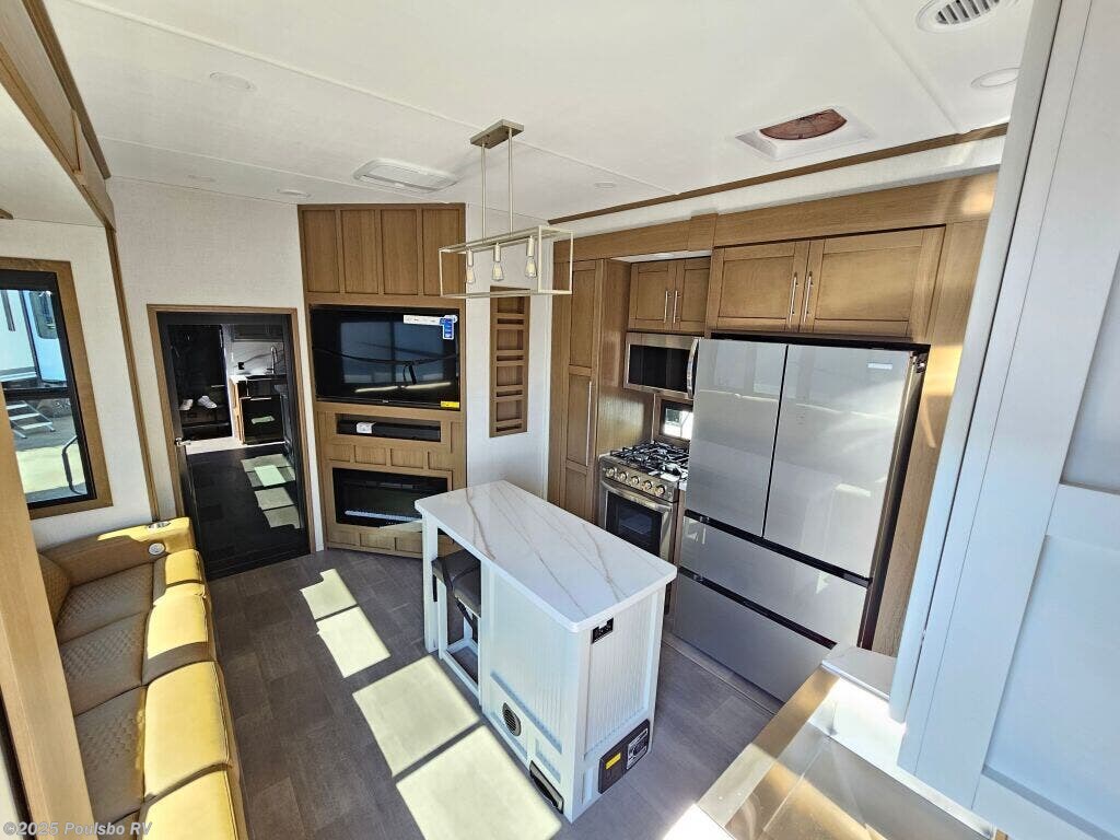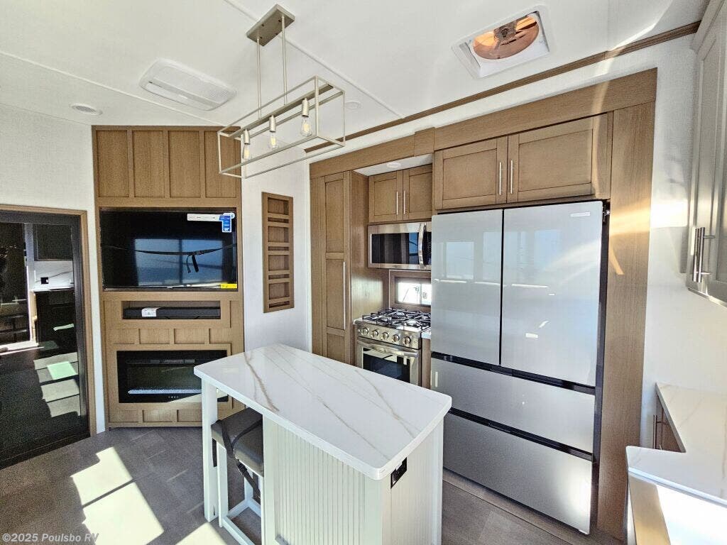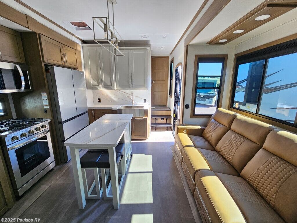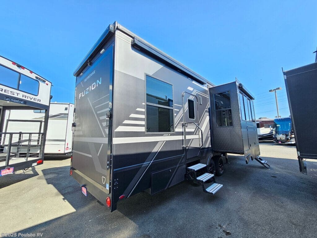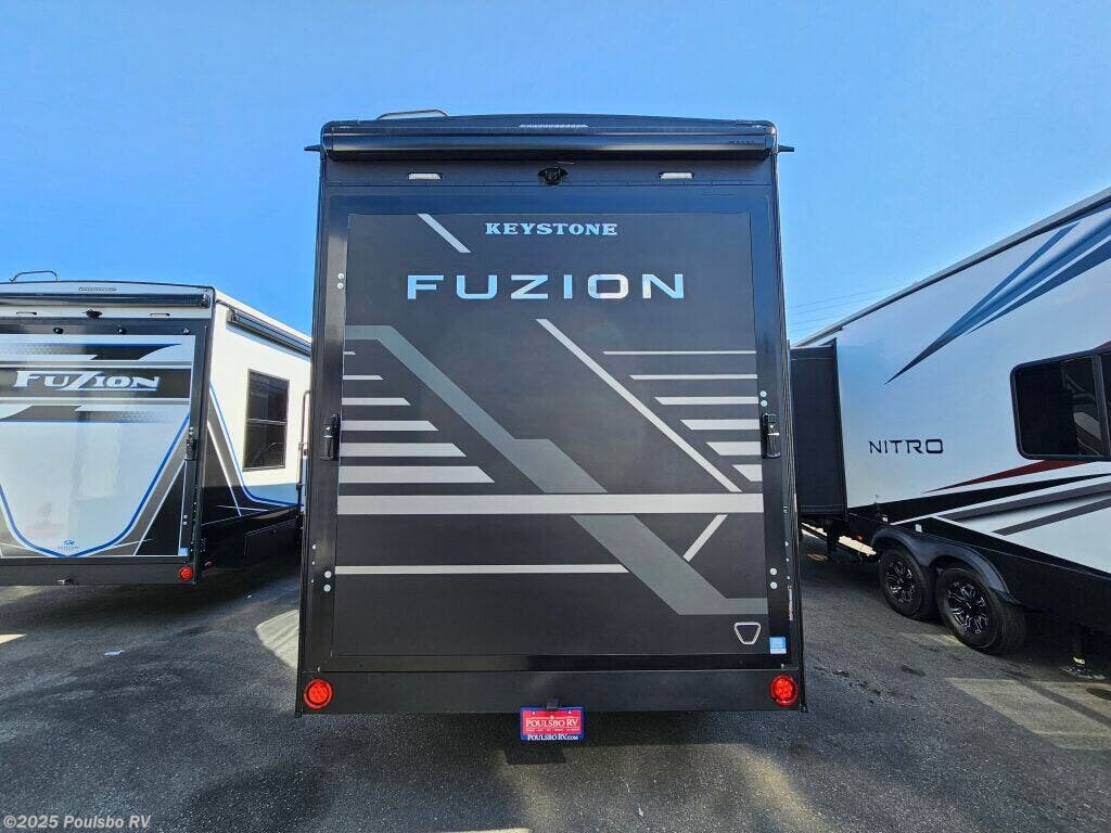 Introducing the 2026 Keystone Fuzion 373, a sophisticated and well-designed fifth wheel that caters to those who crave exploration and luxury in their travels. This new recreational vehicle spans approximately 39.37 feet in length, creating an expansive living area that comfortably accommodates up to 7 occupants, making it an ideal choice for family adventures or friendly getaways. With a dry weight of 16,325 pounds and a hitch weight of 3,745 pounds, this RV delivers both stability and impressive towing capability, allowing you to navigate various terrains with confidence. The Fuzion 373 comes equipped with three slide-outs, which effectively enhance the interior space, resulting in a bright and airy ambiance that is perfect for relaxation and gathering. Convenience is at the forefront with front and rear power leveling jacks, which simplify the setup process when you arrive at your destination. Designed for memorable RVing experiences, this model offers ample sleeping arrangements along with a multitude of modern amenities to keep you comfortable on the road. The well-appointed living area is perfect for entertaining, featuring inviting seating and an entertainment center for movie nights. Whether you are seeking weekend escapades or planning an extended journey, the 2026 Fuzion combines comfort, functionality, and style, ensuring an enjoyable experience for all travelers on board. As a family-owned, award-winning local RV dealer with multiple locations in Sumner, Everett, Kent, and Mt. Vernon Washington, Poulsbo RV is here to help you find the perfect RV. Stock#: E5968, VIN: 4YDFFZT21TF810004.