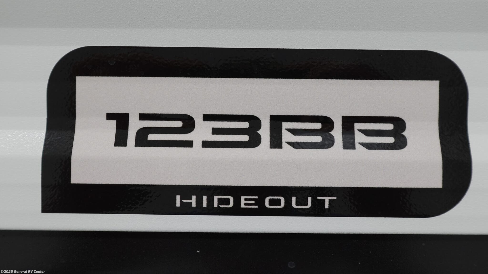 Keystone Hideout Mini travel trailer 123BB highlights: Full-Size Bed Exterior Pass-Through Storage 3.3 Cu. Ft. 12V Refrigerator Double-Size Bunks This lightweight travel trailer is perfect for six happy campers. You'll enjoy the front full-size bed, while your guests or little ones take the double-size bunks. There is also a shelf above the bed to keep your things organized. A private bath includes a shower with a toilet so you can freshen up each day without having to leave your camper. You can make your meals on the two-burner gas cooktop or in the microwave oven, then take your plate outdoors to eat under the 8' power awning! With any Hideout Mini travel trailer by Keystone, you will enjoy lightweight towing thanks to their single axle! The XL tinted safety glass windows are ultra durable, and the power awning will provide protection from the sun as you relax in your camp chairs outside. Each model includes blackout night shades, LED lighting, plus many more interior comforts. There is also a 20K BTU furnace to keep you comfortable, plus a tankless water heater for endless hot showers!