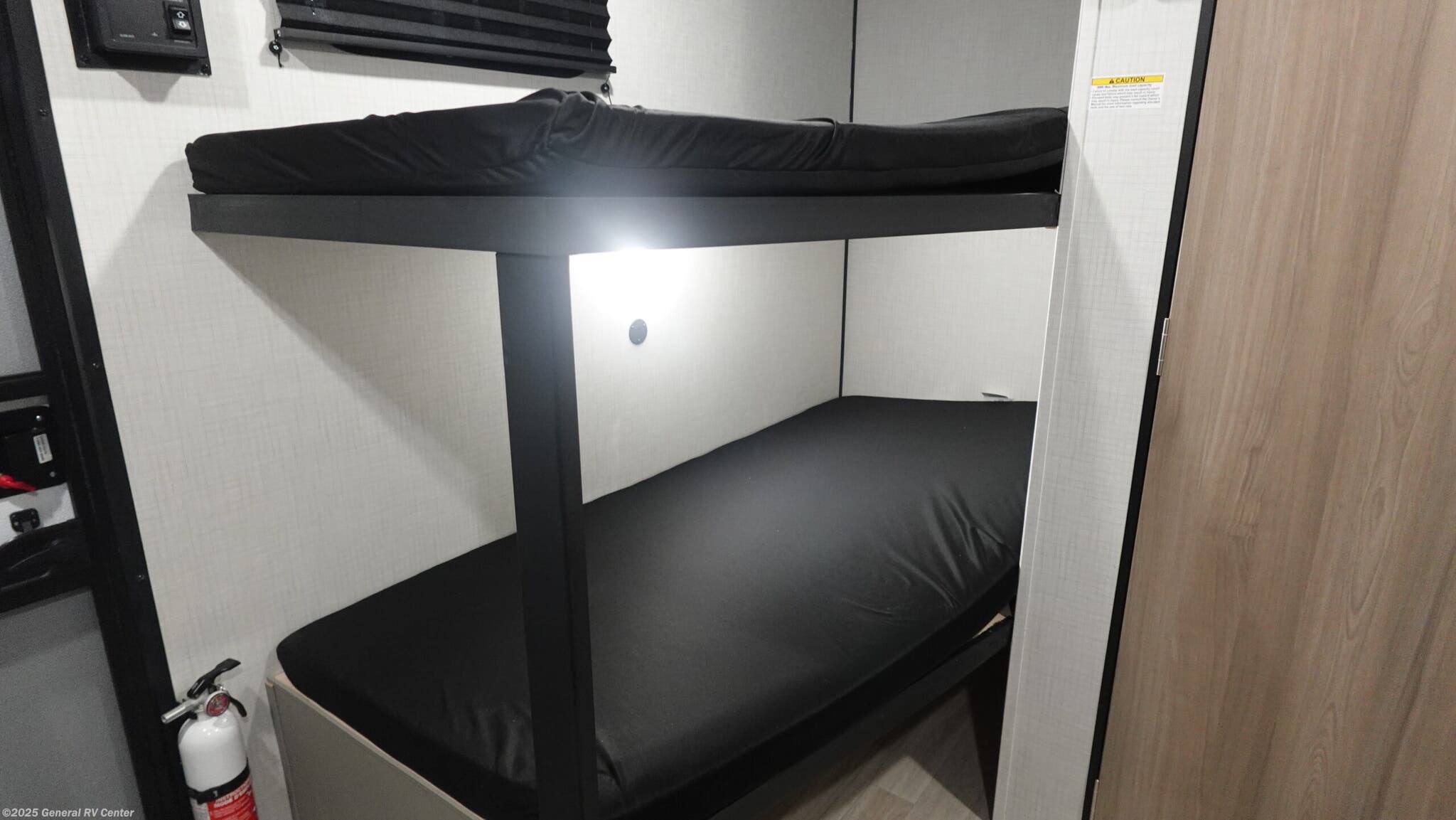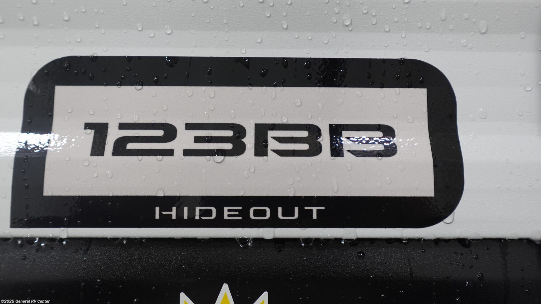 Keystone Hideout Mini travel trailer 123BB highlights: Full-Size Bed Exterior Pass-Through Storage 3.3 Cu. Ft. 12V Refrigerator Double-Size Bunks This lightweight travel trailer is perfect for six happy campers. You'll enjoy the front full-size bed, while your guests or little ones take the double-size bunks. There is also a shelf above the bed to keep your things organized. A private bath includes a shower with a toilet so you can freshen up each day without having to leave your camper. You can make your meals on the two-burner gas cooktop or in the microwave oven, then take your plate outdoors to eat under the 8' power awning! With any Hideout Mini travel trailer by Keystone, you will enjoy lightweight towing thanks to their single axle! The XL tinted safety glass windows are ultra durable, and the power awning will provide protection from the sun as you relax in your camp chairs outside. Each model includes blackout night shades, LED lighting, plus many more interior comforts. There is also a 20K BTU furnace to keep you comfortable, plus a tankless water heater for endless hot showers!