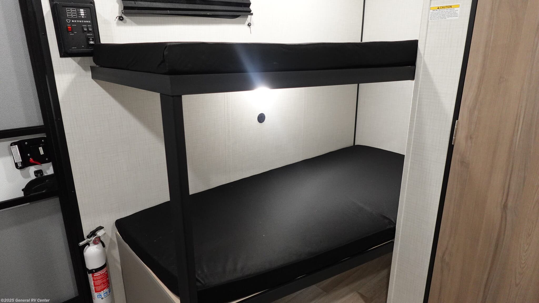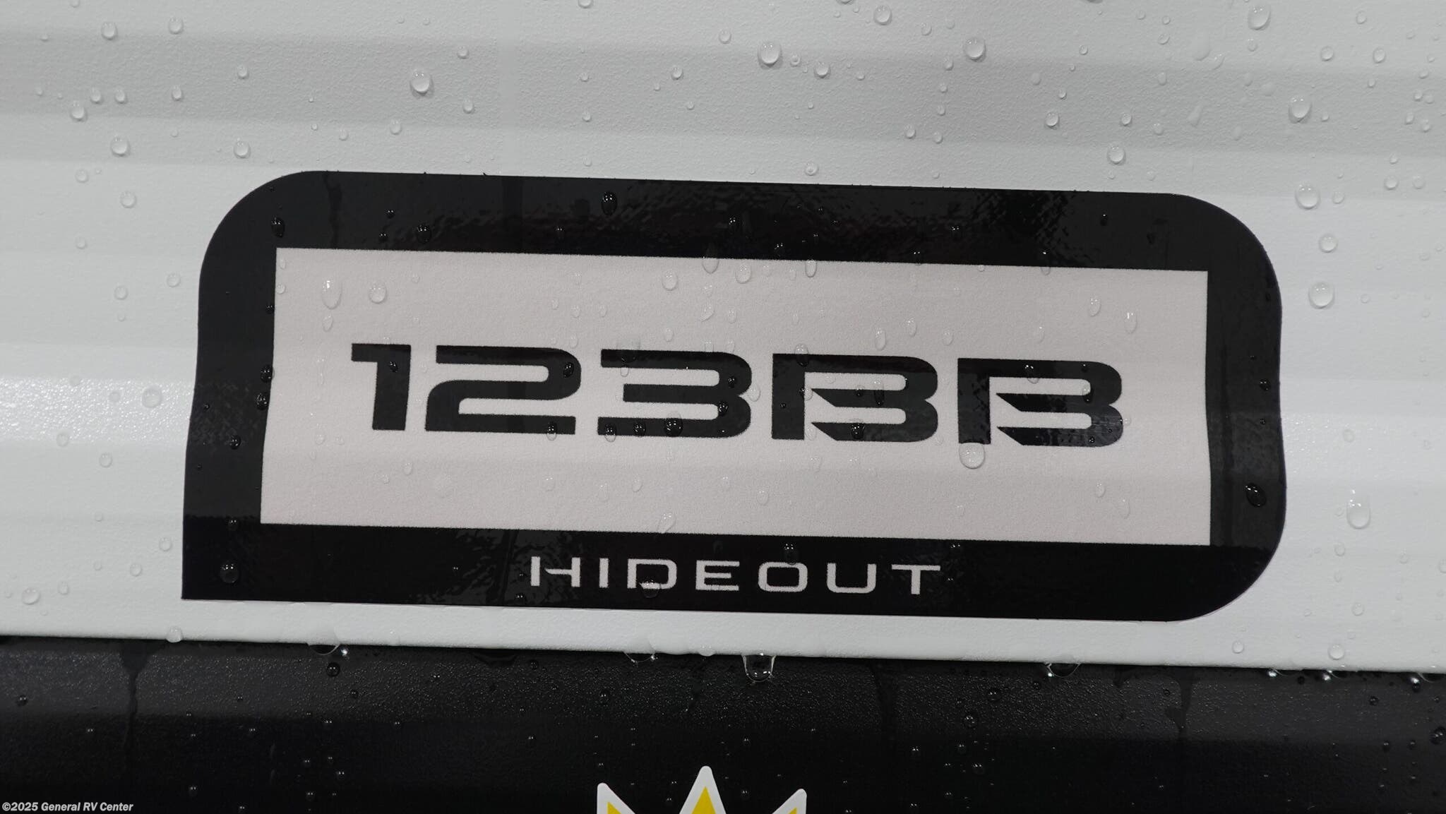 Keystone Hideout Mini travel trailer 123BB highlights: Full-Size Bed Exterior Pass-Through Storage 3.3 Cu. Ft. 12V Refrigerator Double-Size Bunks This lightweight travel trailer is perfect for six happy campers. You'll enjoy the front full-size bed, while your guests or little ones take the double-size bunks. There is also a shelf above the bed to keep your things organized. A private bath includes a shower with a toilet so you can freshen up each day without having to leave your camper. You can make your meals on the two-burner gas cooktop or in the microwave oven, then take your plate outdoors to eat under the 8' power awning! With any Hideout Mini travel trailer by Keystone, you will enjoy lightweight towing thanks to their single axle! The XL tinted safety glass windows are ultra durable, and the power awning will provide protection from the sun as you relax in your camp chairs outside. Each model includes blackout night shades, LED lighting, plus many more interior comforts. There is also a 20K BTU furnace to keep you comfortable, plus a tankless water heater for endless hot showers!