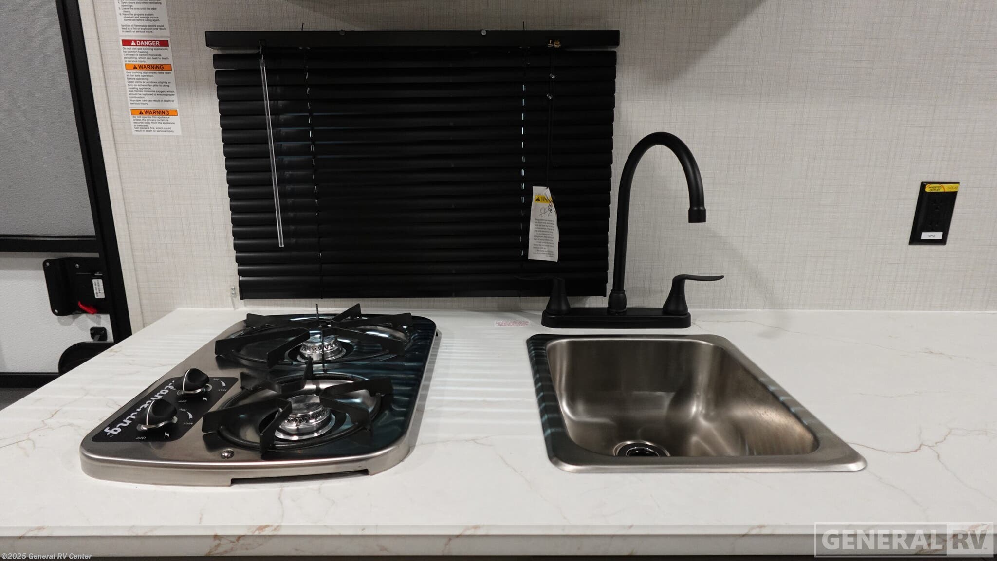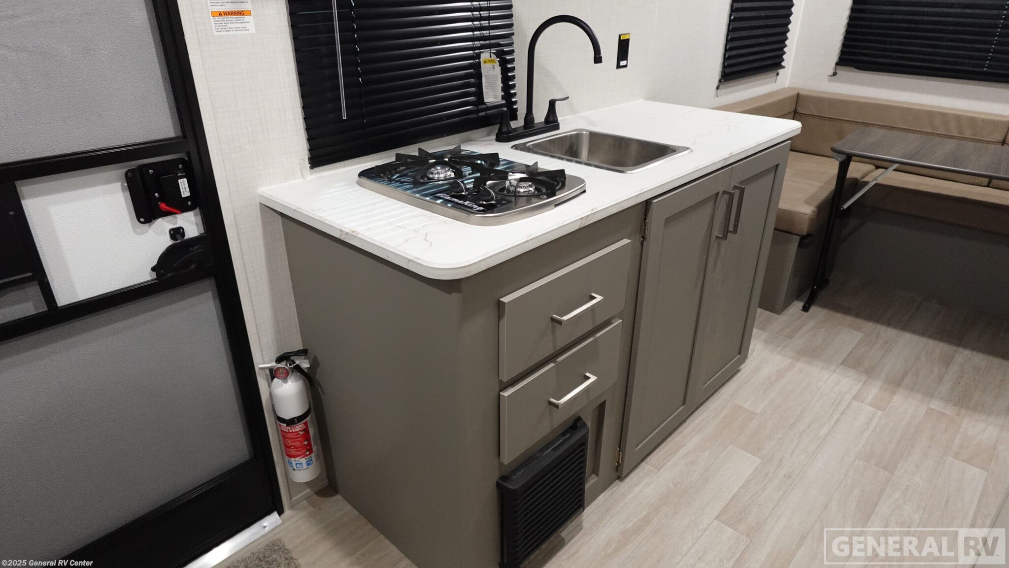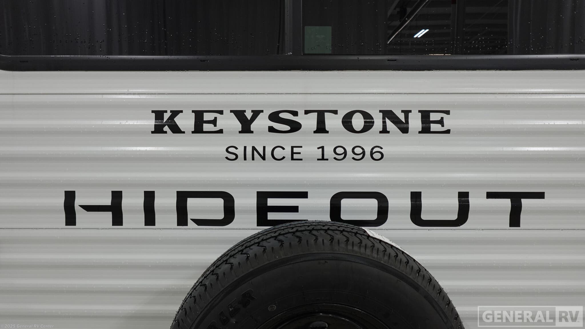 Enjoy the views out of the large rear window as you dine, play games and/or sleep on the U-shaped dinette. The cook will love the galley kitchen with everything from a two burner cooktop and a 3.3 cu. ft. refrigerator nearby, and the pantry is a few steps away offering space for dry goods, snacks and more dishes. There is a full bathroom to get cleaned up in and change in privacy, and a queen-size bed up front with a nightstand and closet. There is also an exterior pass-through storage compartment for all of your camping necessities! With any Hideout Mini travel trailer by Keystone, you will enjoy lightweight towing thanks to their single-axle! The AlphaPly TPO roof membrane is ultra durable, and the power awning will provide protection from the sun as you relax in your camp chairs outside. Each model includes blackout night shades, LED lighting, plus many more interior comforts. There is also a roof A/C and 20K BTU furnace to keep you comfortable, plus a tankless water heater for endless hot showers!