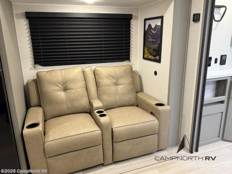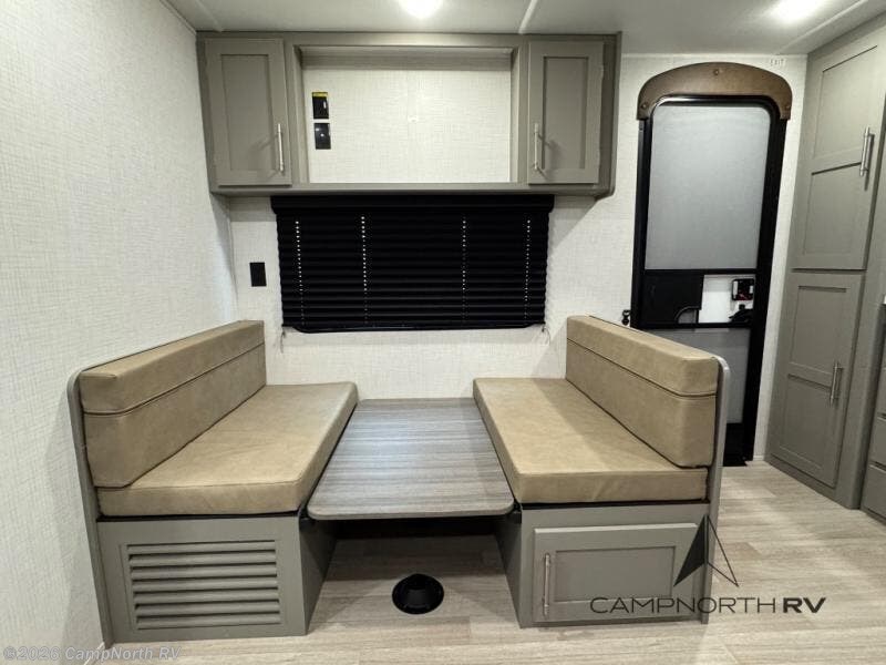 The main living area includes a booth dinette and theater seating, offering comfortable spaces for dining, relaxing, or entertaining indoors.