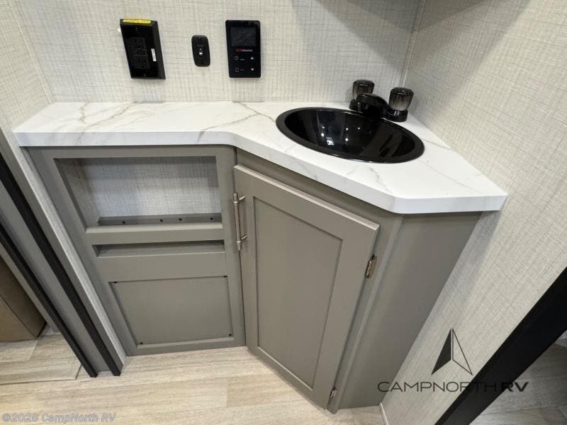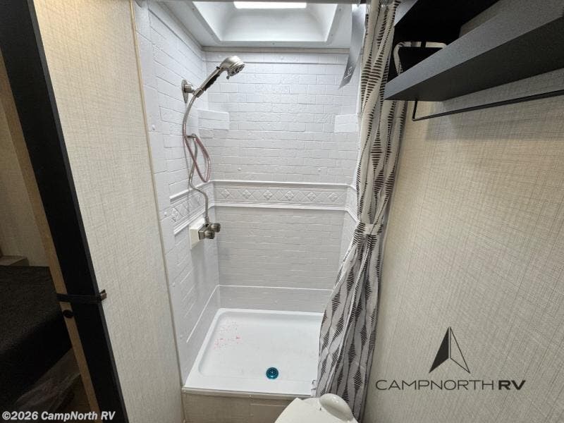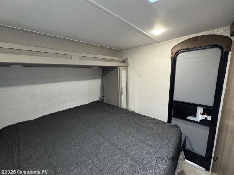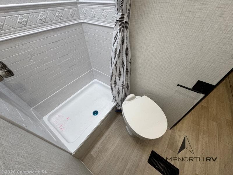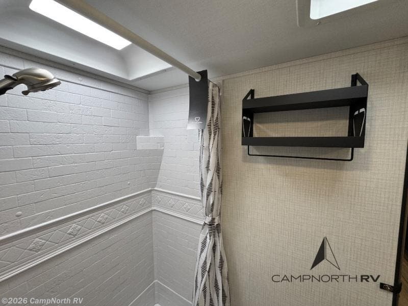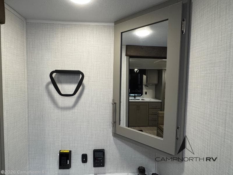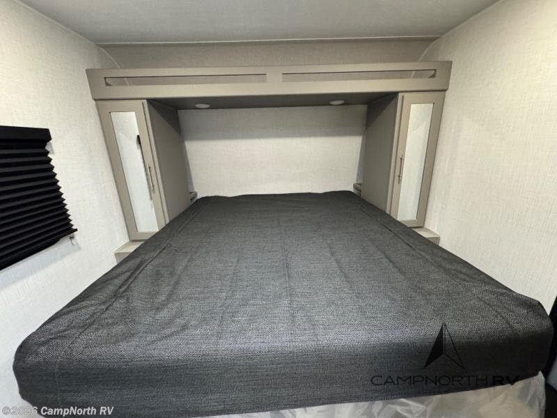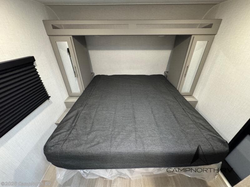 A walk-through bathroom connects the living area to the front bedroom, adding convenience and privacy for both you and your guests. In the front, the private bedroom features an Olympic RV queen bed and wardrobe storage, creating a comfortable place to rest after a day of outdoor activities.