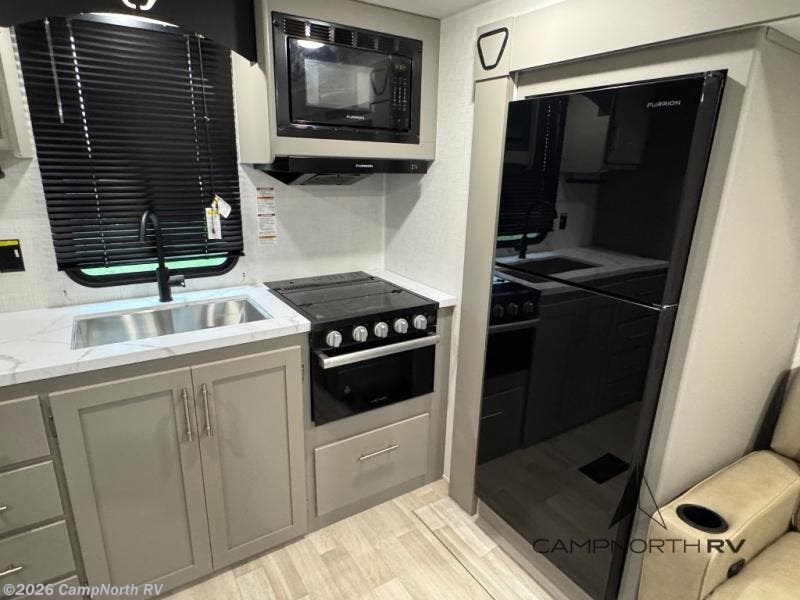 The rear kitchen layout provides a functional and spacious cooking area, complete with a three-burner stove, pantry, sink, and refrigerator, making meal prep simple whether you’re camping for the weekend or an extended stay.
