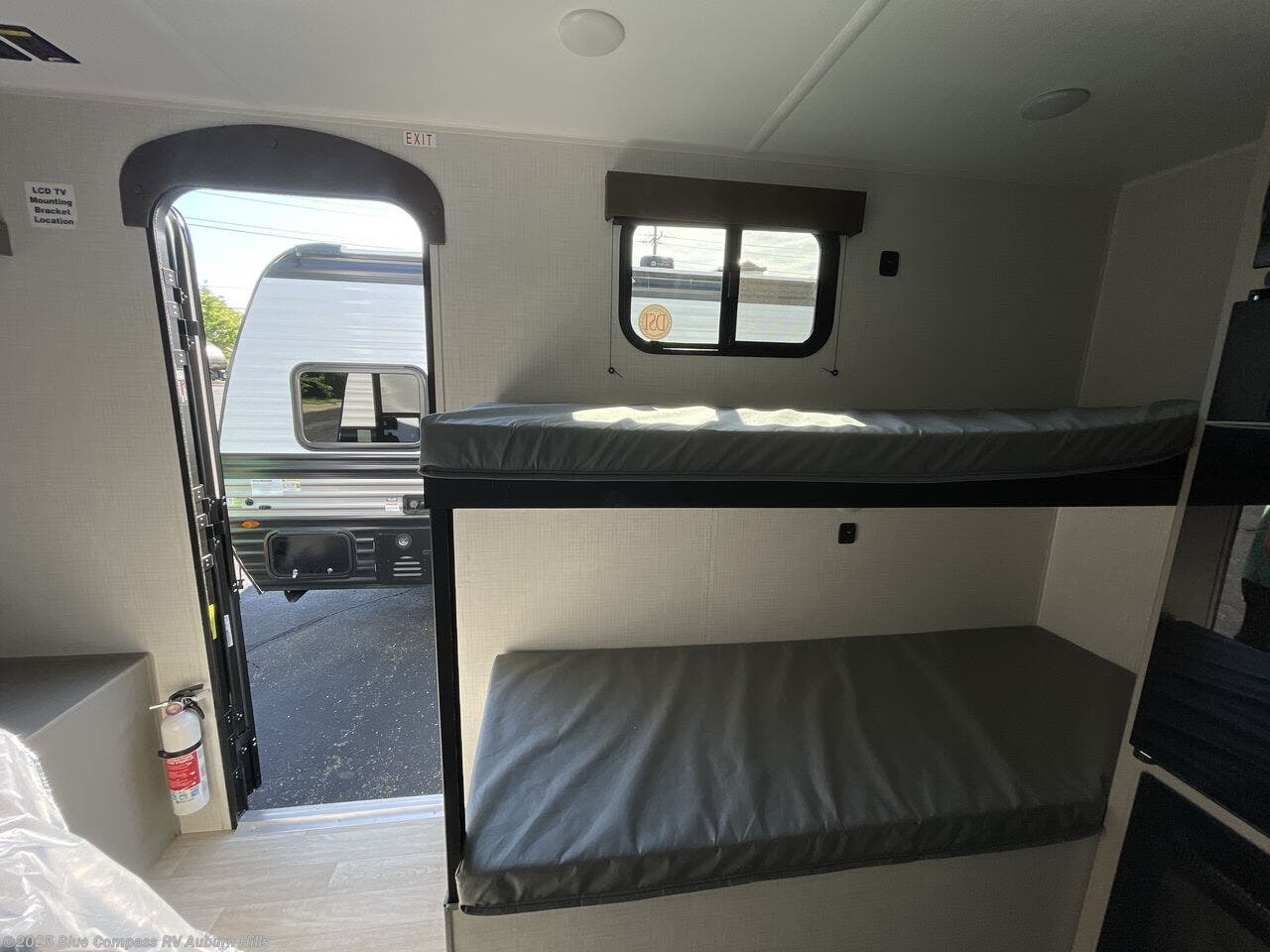 This lightweight travel trailer is perfect for four happy campers. You'll enjoy the front full-size bed, while your guests or little ones take the 28" x 74" bunk beds. There is also a shelf above the bed to keep your things organized. A private bath includes a shower with a toilet so you can freshen up each day without having to leave your camper. You can make your meals on the two burner gas cooktop or in the microwave oven, then take your plate outdoors to eat under the 8' power awning!