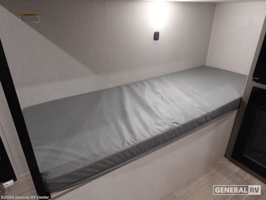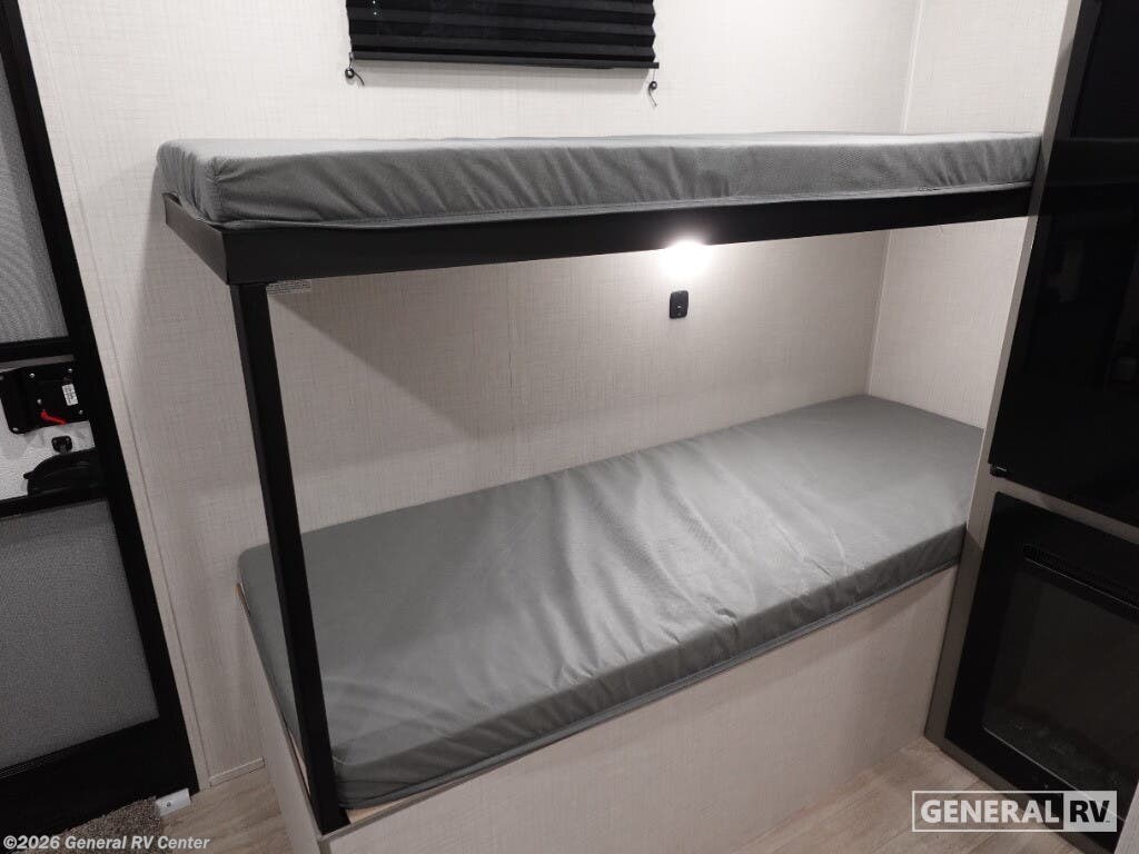 Keystone Hideout Mini travel trailer 130BH highlights: Full-Size Bed Exterior Pass-Thru Storage 3.3 Cu. Ft. 12V Refrigerator Bunk Beds This lightweight travel trailer is perfect for four happy campers. You'll enjoy the front full-size bed, while your guests or little ones take the 28" x 74" bunk beds. There is also a shelf above the bed to keep your things organized. A private bath includes a shower with a toilet so you can freshen up each day without having to leave your camper. You can make your meals on the two burner gas cooktop or in the microwave oven, then take your plate outdoors to eat under the 8' power awning! With any Hideout Mini travel trailer by Keystone, you will enjoy lightweight towing thanks to their single-axle! The AlphaPly TPO roof membrane is ultra durable, and the power awning will provide protection from the sun as you relax in your camp chairs outside. Each model includes blackout night shades, LED lighting, plus many more interior comforts. There is also a roof A/C and 20K BTU furnace to keep you comfortable, plus a tankless water heater for endless hot showers!