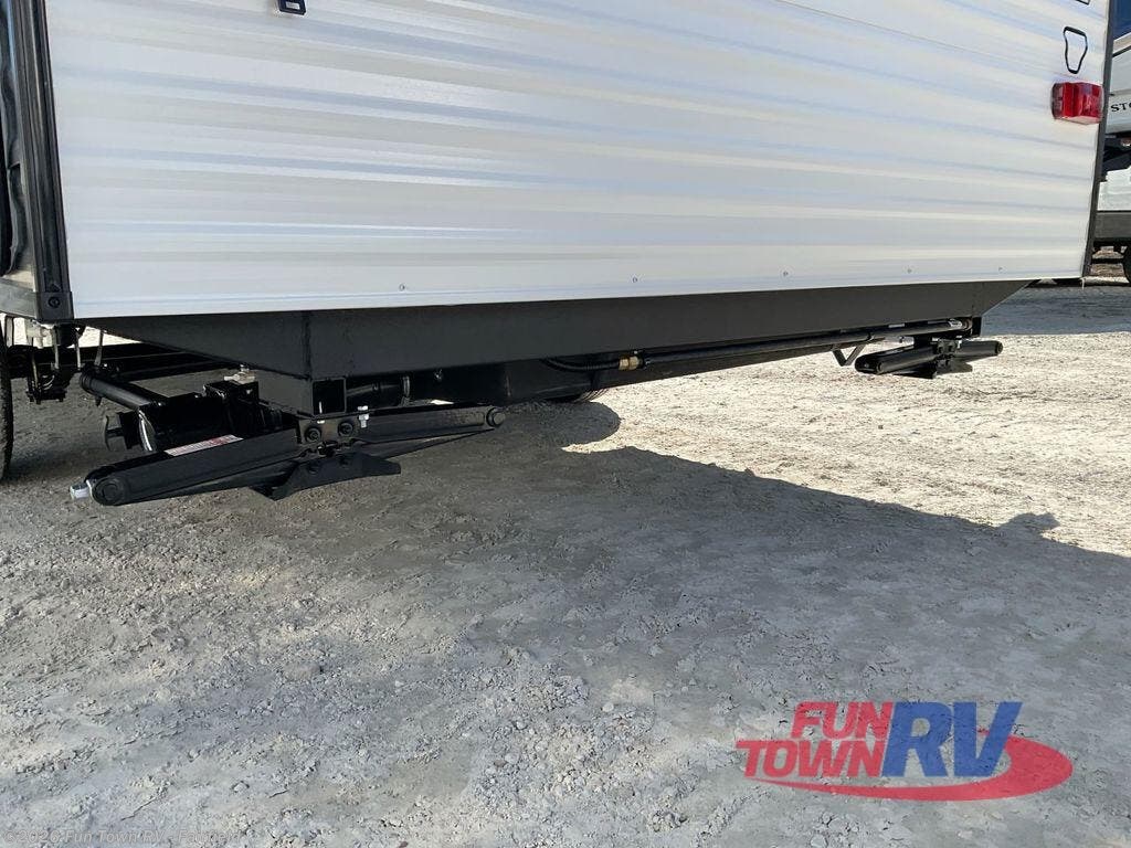 This travel trailer with rear corner bunk beds is sure to be a hit at the campground! While your guests or little ones take the bunks, you can enjoy the front Olympic RV queen bed to yourselves. There is even storage under the bed, an overhead shelf, and a wardrobe for your things. The chef of your group can whip up meals on the two-burner cooktop or in the microwave oven, and there is a 3.3 cu. ft. 12V refrigerator to keep food fresh. A booth dinette provides a place to dine together, or you can take your plate outdoors to sit under the 8' power awning with LED lights!