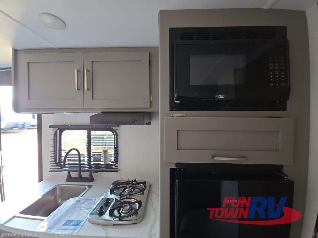 This travel trailer with rear corner bunk beds is sure to be a hit at the campground! While your guests or little ones take the bunks, you can enjoy the front Olympic RV queen bed to yourselves. There is even storage under the bed, an overhead shelf, and a wardrobe for your things. The chef of your group can whip up meals on the two-burner cooktop or in the microwave oven, and there is a 3.3 cu. ft. 12V refrigerator to keep food fresh. A booth dinette provides a place to dine together, or you can take your plate outdoors to sit under the 8' power awning with LED lights!