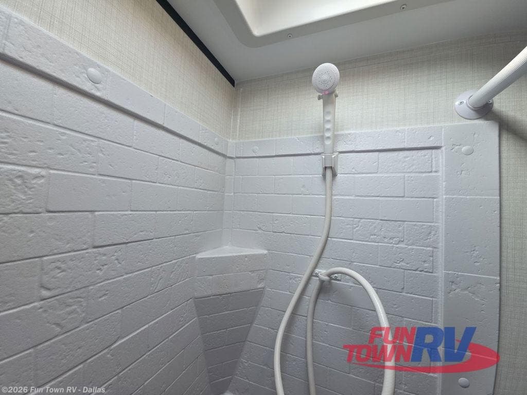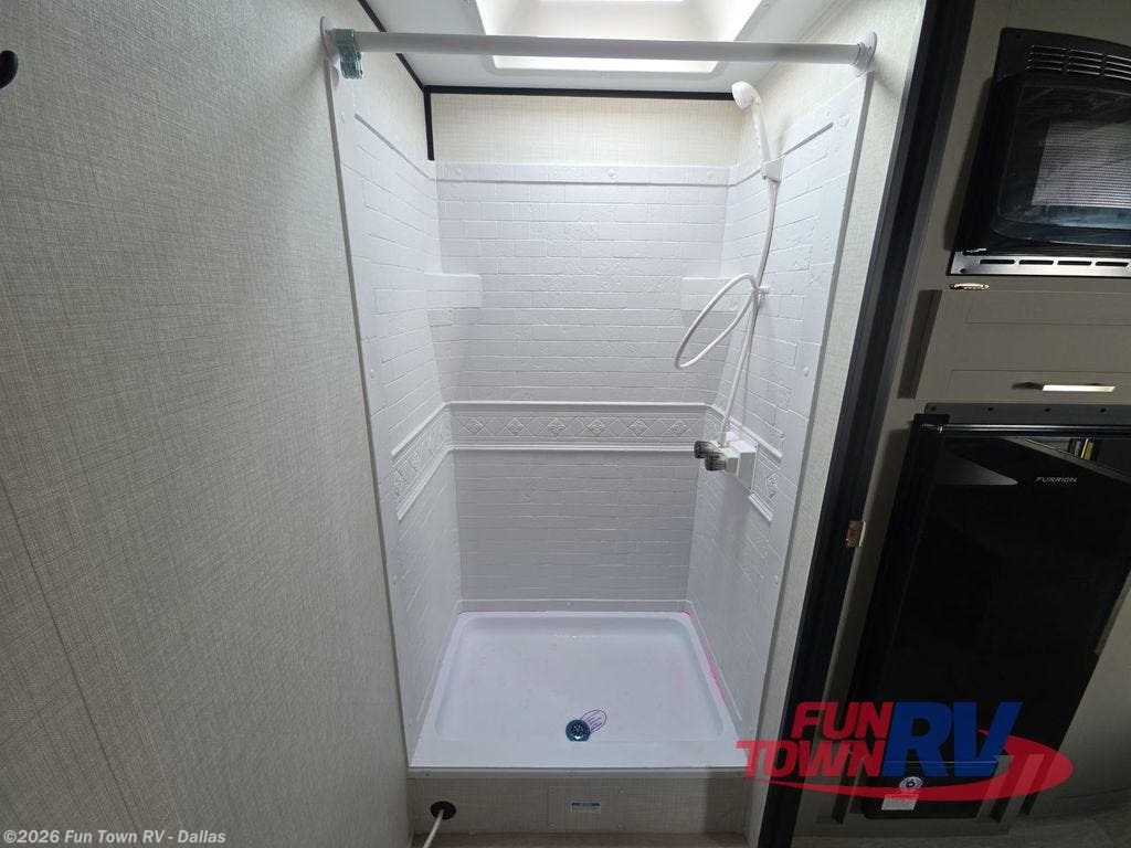 Camping trips just got easier travel trailer that can sleep three to four each night! There is a front Olympic RV queen bed with an overhead shelf and bedside wardrobe for your things. A two-burner cooktop and microwave oven will let you make breakfast for your crew, and a booth dinette provides a place to dine together, as well as convert to sleeping space for a guest or two little ones. This travel trailer also includes a full rear bath, complete with a shower, toilet, and vanity with a sink and overhead cabinet!
