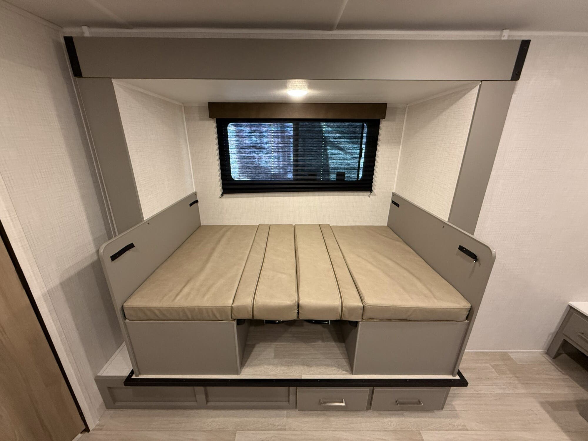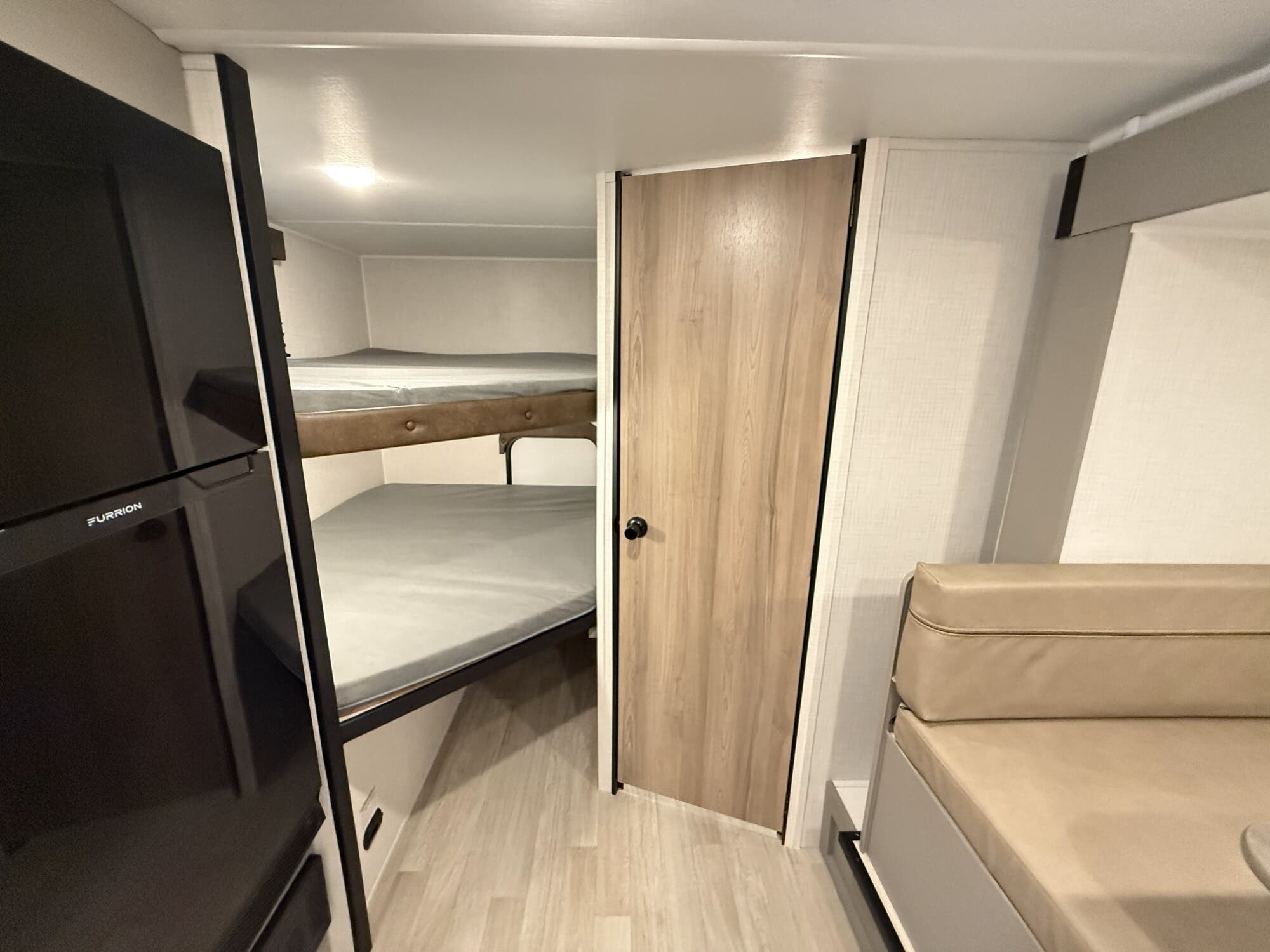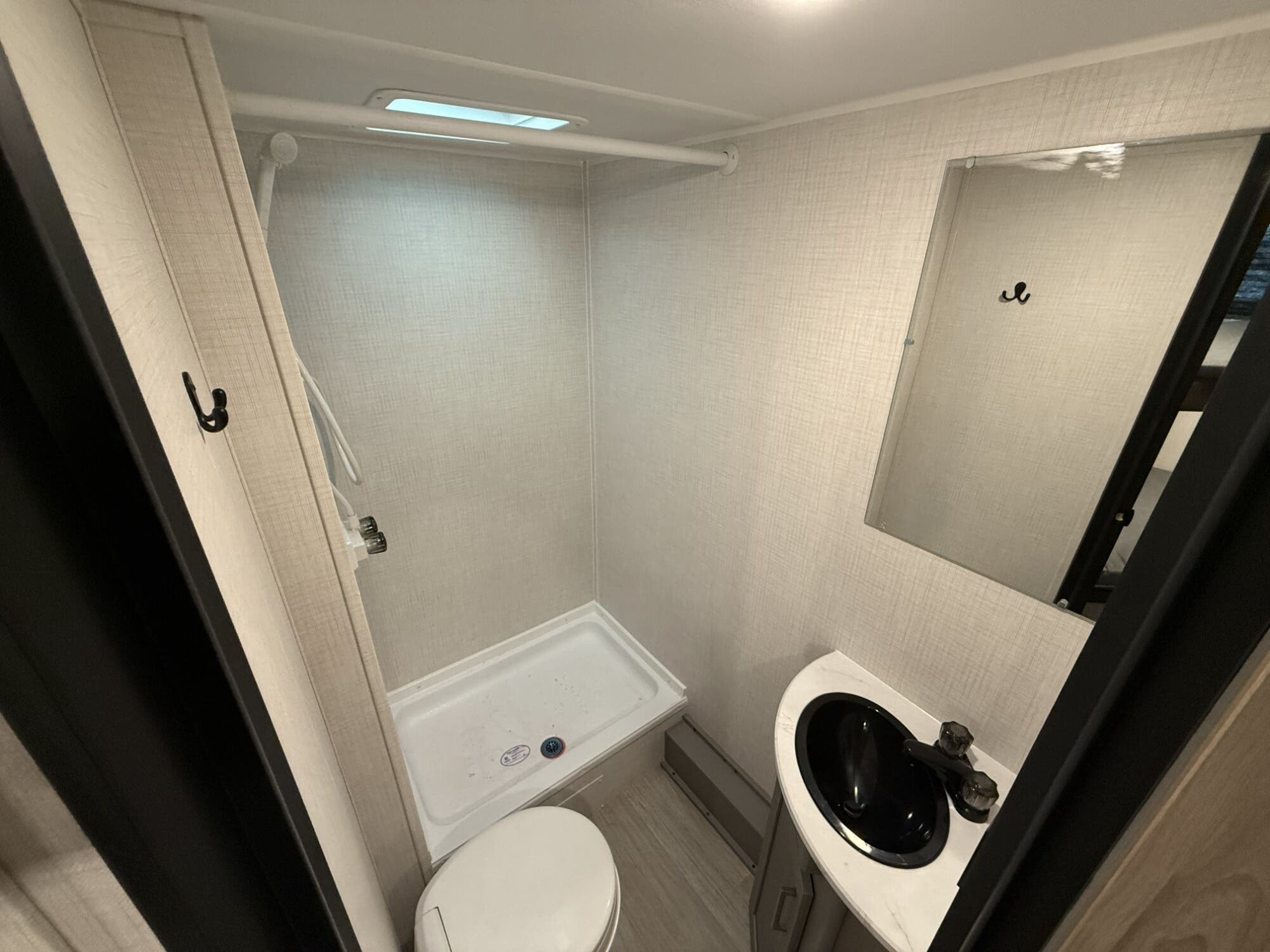 Bunk Beds, Queen Bed, Roof Vents, Shower, Toilet, Vanity
