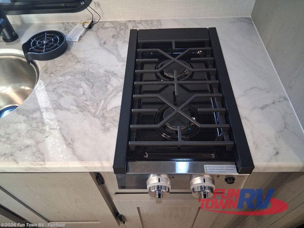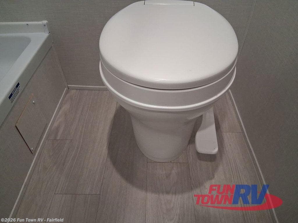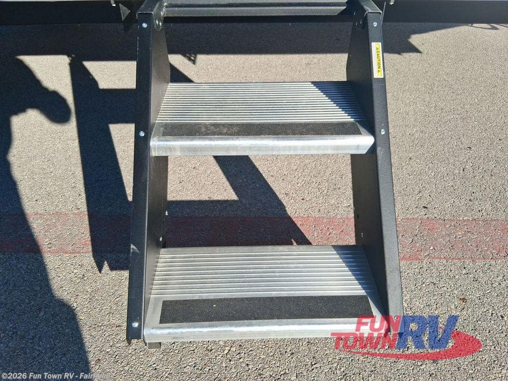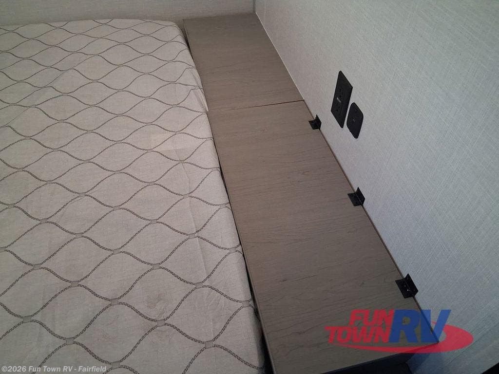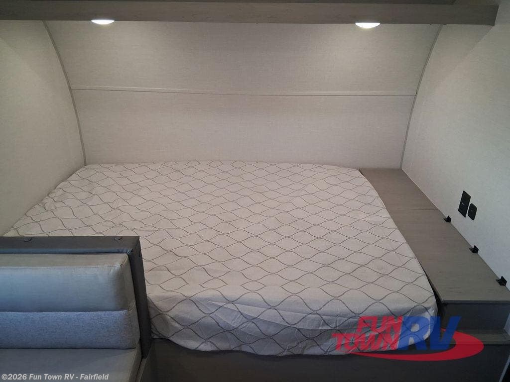 Camping trips just got easier travel trailer with double-size bunks and a sofa slide out for more sleeping and floor space! There is a two-burner cooktop and microwave oven to cook meals each day, plus a 10-cu. ft. 12V refrigerator for food storage. Up front, you'll find a picnic table to dine at, plus a Murphy style pull-out Olympic RV queen-size bed, giving you both seating and sleeping space. Dual bedside wardrobes will let you keep your clothes organized, and an exterior pass-through storage will be perfect for fishing poles, camp chairs and more!