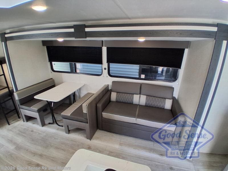 Pack your bags and head for the lake or woods in this spacious trailer! You can comfortably sleep nine to ten with the double-size bunks and the queen bed in the front private bedroom, plus the booth dinette and sofa in the main living area. There is even TV prep here if you want to add a television to the entertainment center for movie nights. The kitchen includes a 10 cu. ft. 12V refrigerator and an extra large pantry for food storage, plus a cooktop to prepare meals each day. The full bath included will let you clean up after a day of exploring outdoors, and you'll find the second entry door here for convenience!