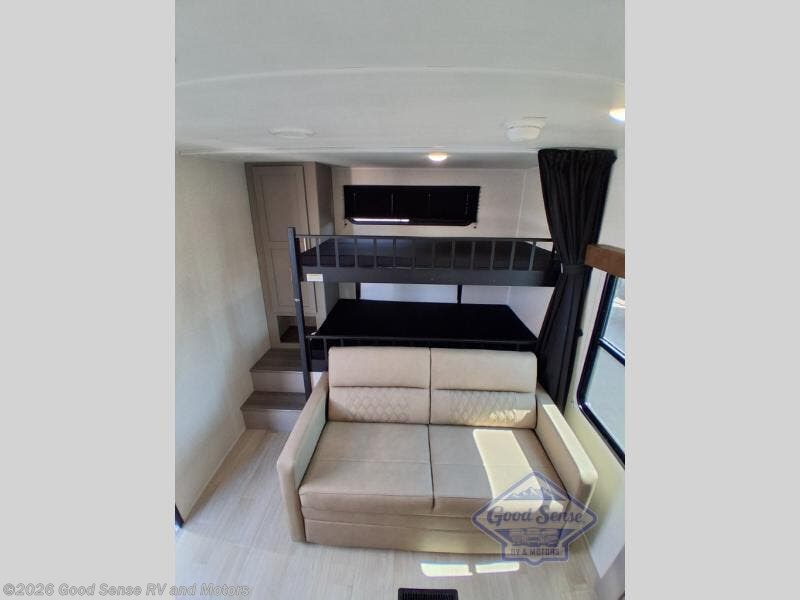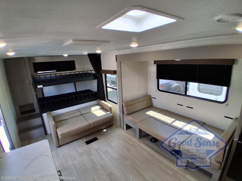 You can easily sleep nine to ten in this travel trailer, so invite the whole gang along! The bunks with flip-up utility storage will allow you to bring along extra gear, plus there is an exterior pass-thru and outside storage so nothing gets left behind. You'll find your own bedroom up front with a queen bed, a private exterior entry door and your own entrance into the walk-through bath! Once lunch has been made, your crew can dine around the U-shaped dinette, relax on the sofa, or enjoy some fresh air under the 18' power awning outdoors!