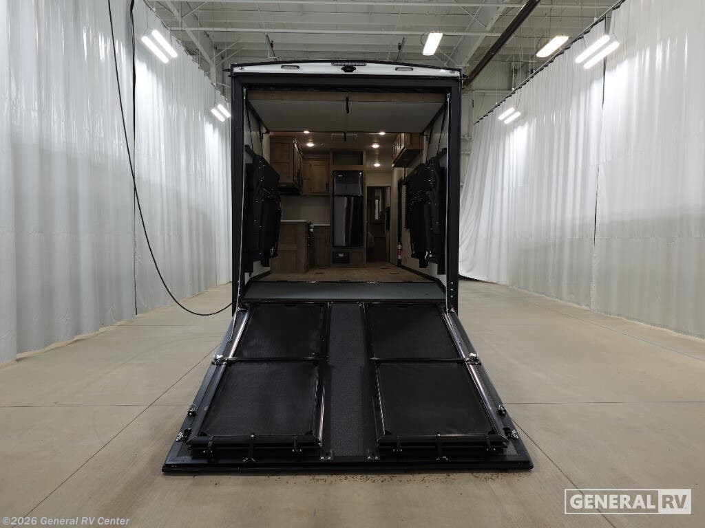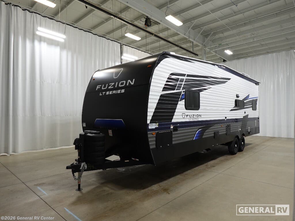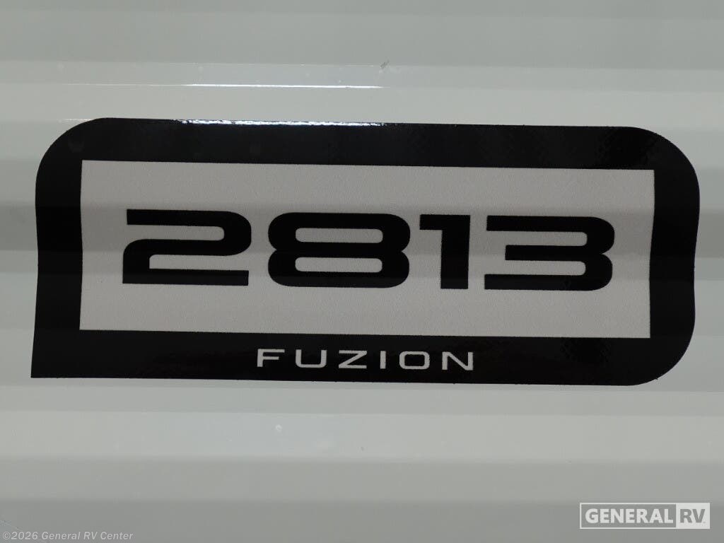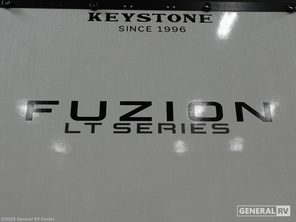 Keystone Fuzion Impact Edition toy hauler 2813 highlights: RV Queen Bed 10 Cu. Ft. 12V Refrigerator 8' Garage Door Aluminum Exterior This open concept toy hauler is sure to meet all of your needs. There is a full kitchen with a Furrion three burner gas range and a microwave oven to prepare meals, plus a 10 cu. ft. 12V refrigerator to keep food fresh. You'll find comfortable seating space on the dual opposing sofas with a top queen bed, and there is an entertainment center. The RV queen bed in the front master bedroom will bring a great night's rest, and the dual entry bath lets you clean up after trail riding. When you're ready to head home, the 13' 4" garage area includes frame welded tie downs to keep your toys secure. Embrace the great outdoors with a Fuzion Impact Edition toy hauler by Keystone! There is an aluminum exterior and a 8' 4" wide-body construction for your toys and gear! The one-piece polypropylene heated underbelly includes enclosed tanks and valves which will help extend your camping season, and the leaf spring suspension system will provide smooth towing. Head inside to enjoy night shades, hardwood cabinetry, and fiberglass backed linoleum floor with no carpet-free for easy cleaning. Each model also includes a Girard on-demand water heater, two 30 lb. LP tanks, recessed LED puck lighting throughout, and the list of comforts goes on!