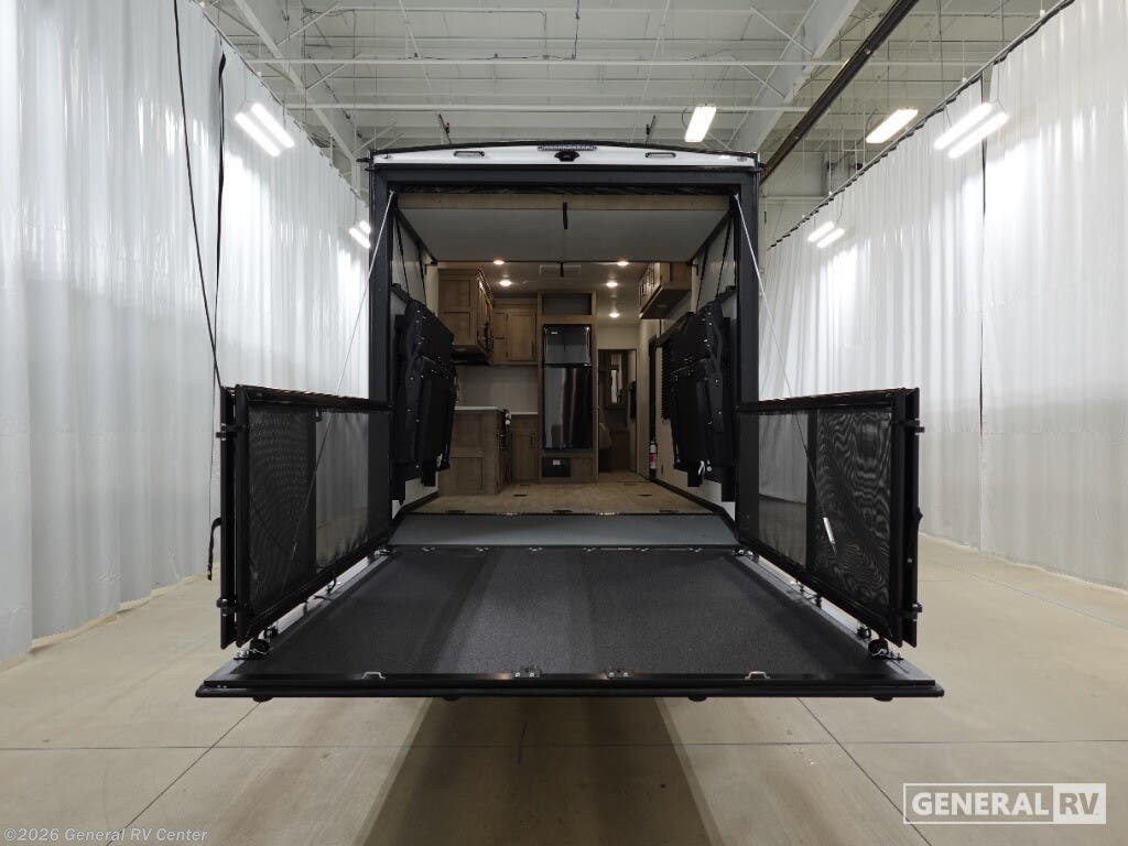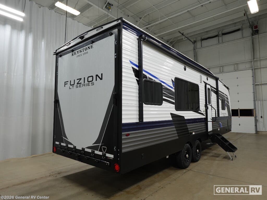 Keystone Fuzion Impact Edition toy hauler 2813 highlights: RV Queen Bed 10 Cu. Ft. 12V Refrigerator 8' Garage Door Aluminum Exterior This open concept toy hauler is sure to meet all of your needs. There is a full kitchen with a Furrion three burner gas range and a microwave oven to prepare meals, plus a 10 cu. ft. 12V refrigerator to keep food fresh. You'll find comfortable seating space on the dual opposing sofas with a top queen bed, and there is an entertainment center. The RV queen bed in the front master bedroom will bring a great night's rest, and the dual entry bath lets you clean up after trail riding. When you're ready to head home, the 13' 4" garage area includes frame welded tie downs to keep your toys secure. Embrace the great outdoors with a Fuzion Impact Edition toy hauler by Keystone! There is an aluminum exterior and a 8' 4" wide-body construction for your toys and gear! The one-piece polypropylene heated underbelly includes enclosed tanks and valves which will help extend your camping season, and the leaf spring suspension system will provide smooth towing. Head inside to enjoy night shades, hardwood cabinetry, and fiberglass backed linoleum floor with no carpet-free for easy cleaning. Each model also includes a Girard on-demand water heater, two 30 lb. LP tanks, recessed LED puck lighting throughout, and the list of comforts goes on!