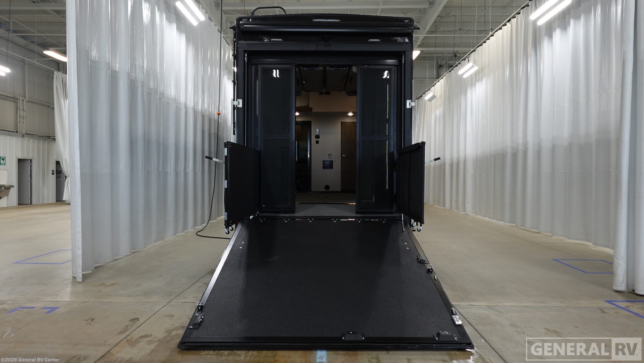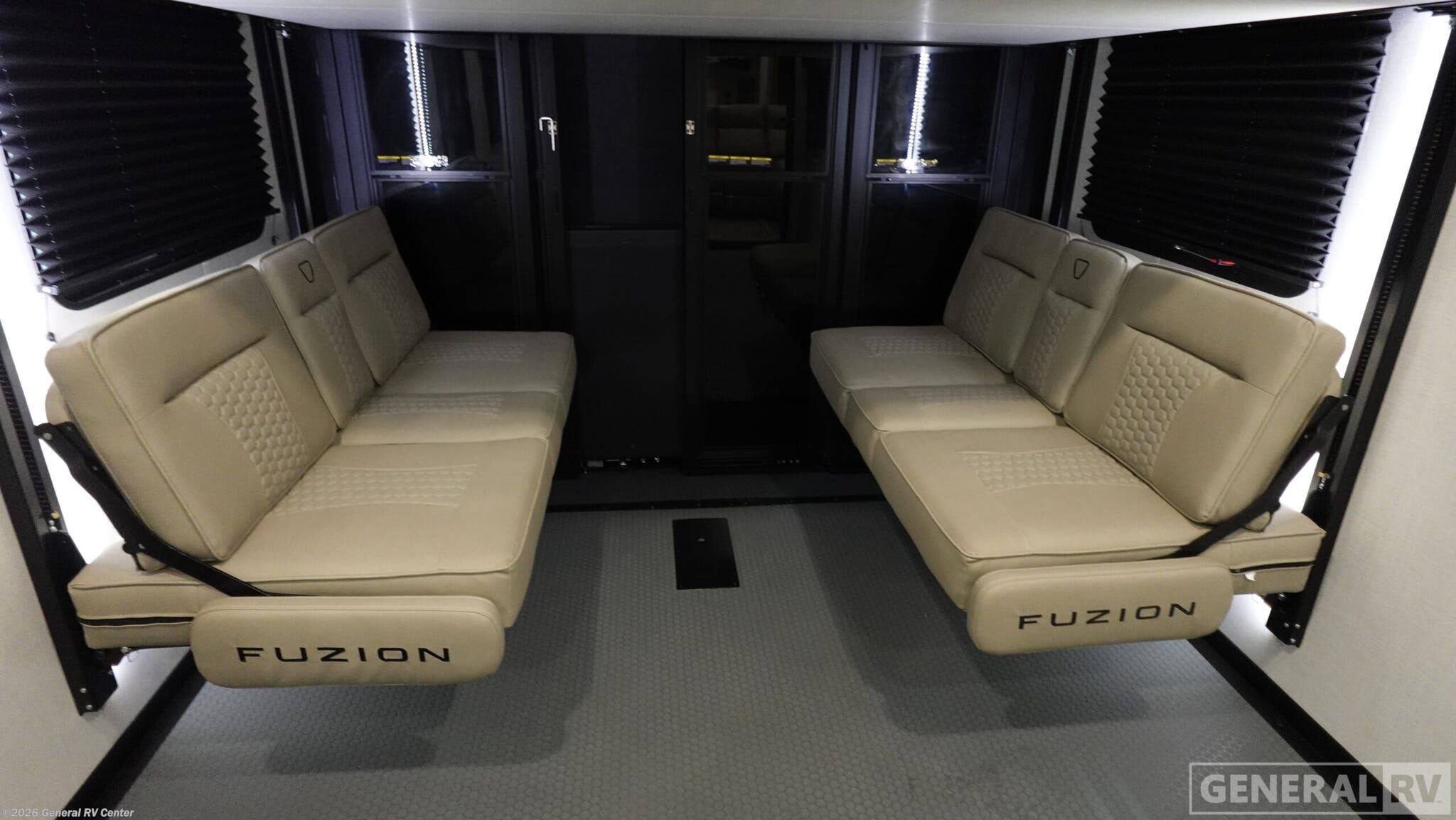 Keystone Fuzion Impact Edition toy hauler 418 highlights: Triple Slides Bath and a Half Loft with Bunk Mat 5k Lb. Tie-Downs Dinette with Free-Standing Chairs Enjoy time at the campground in this triple slide out toy hauler! The 15' separate garage includes dual opposing sofas with a top queen bed, an 8' garage door, a loft with a bunk mat, plus a half bath! The living area will be a favorite hang-out spot with its L-shaped sofa slide out in great view of the entertainment center with a fireplace. The kitchen features a U-shaped countertop, a spacious pantry and 12V refrigerator, plus a dinette with chairs to dine at. A full bath removes the need to use the camp's facilities, and the front private bedroom will feel just like home with its 60" x 74" queen bed and slide out master closet! Embrace the great outdoors with a Fuzion Impact Edition toy hauler by Keystone! There are laminated fiberglass sidewalls and a 8' 4" wide-body construction for your toys and gear! The one-piece polypropylene heated underbelly includes enclosed tanks and valves which will help extend your camping season, and the leaf spring suspension system will provide smooth towing. Head inside to enjoy night shades, hardwood cabinetry, and fiberglass backed linoleum floor with no carpet for easy cleaning. Each model also includes a Girard on-demand water heater, two 30 lb. LP tanks, recessed LED puck lighting throughout, and the list of comforts goes on!