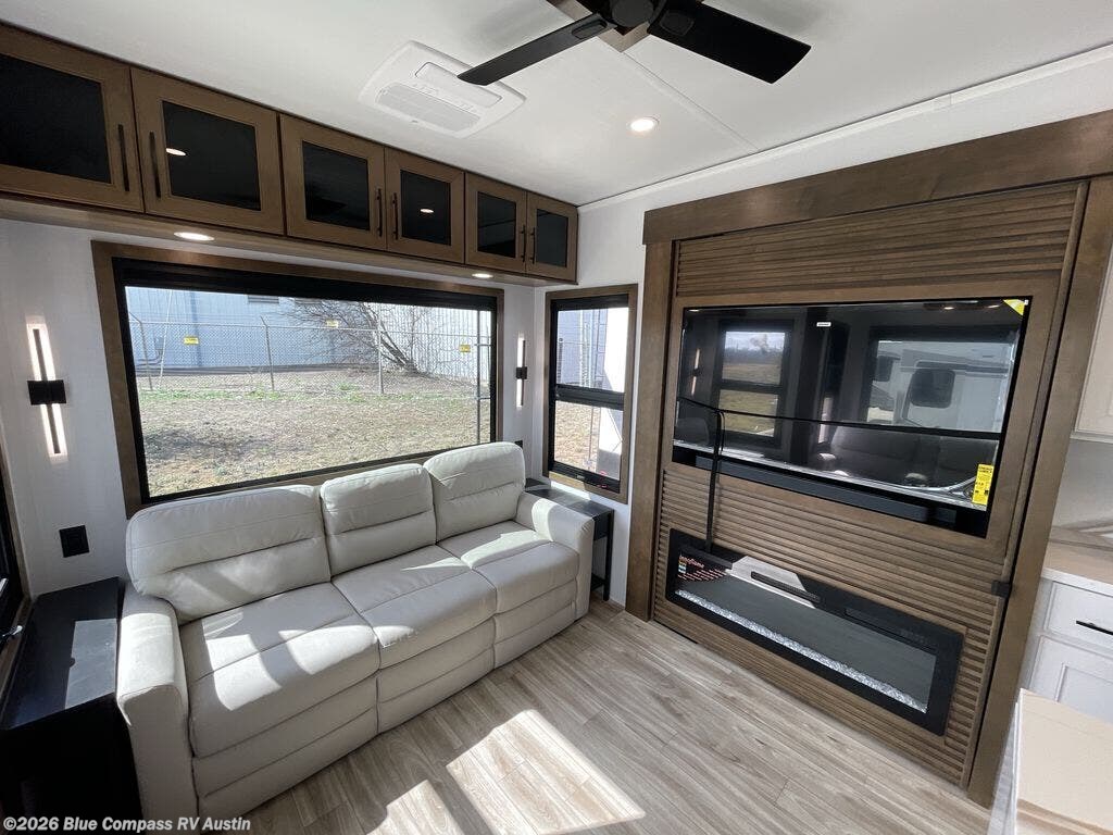 It won't be hard to find comfort in this fifth wheel with triple slides for more space, a spacious front bedroom, and a rear living area with a comfy sofa! Once you've unloaded the exterior pull-out storage tray, you can put out the two awnings, then relax in your camp chairs. A four-burner range inside will let you make lunch for your crew, and a spacious kitchen island will provide more counter space. There is also a pantry, overhead cabinets, plus a second, swing-out hidden pantry behind the entertainment center with a fireplace. The dinette with four chairs, power theater seating, and rear sofa will give you plenty of seating options, and the dual opposing slides in the combined kitchen and living area will create an open floorplan you are sure to love. Head towards the front to freshen up in the spacious bath with ample counter space, then enjoy a perfect night's rest in the front bedroom, complete with a king bed slide, dual nightstands, front wardrobe, plus a second wardrobe with washer and dryer prep.