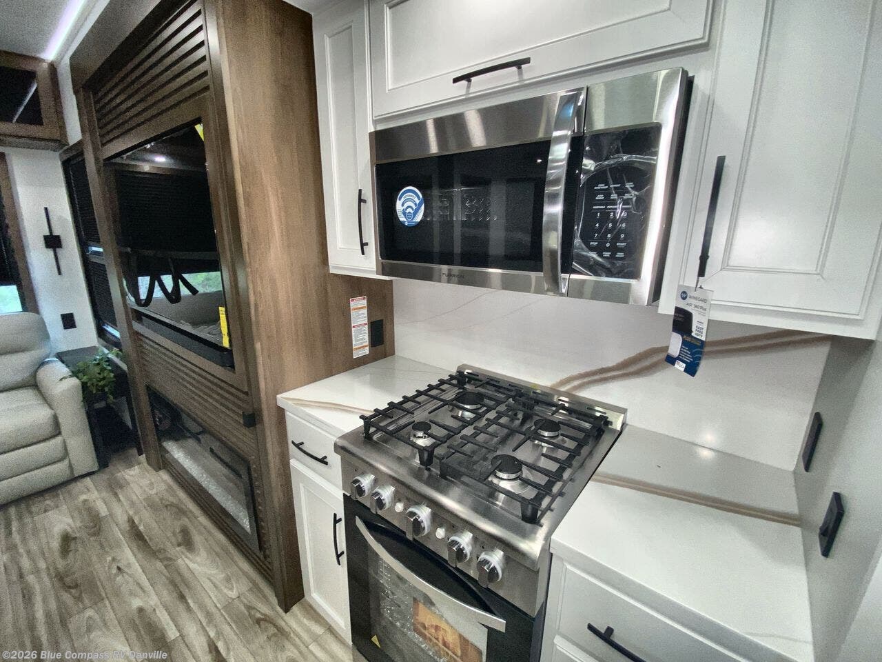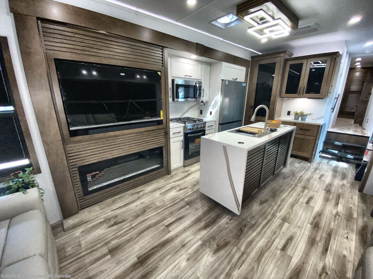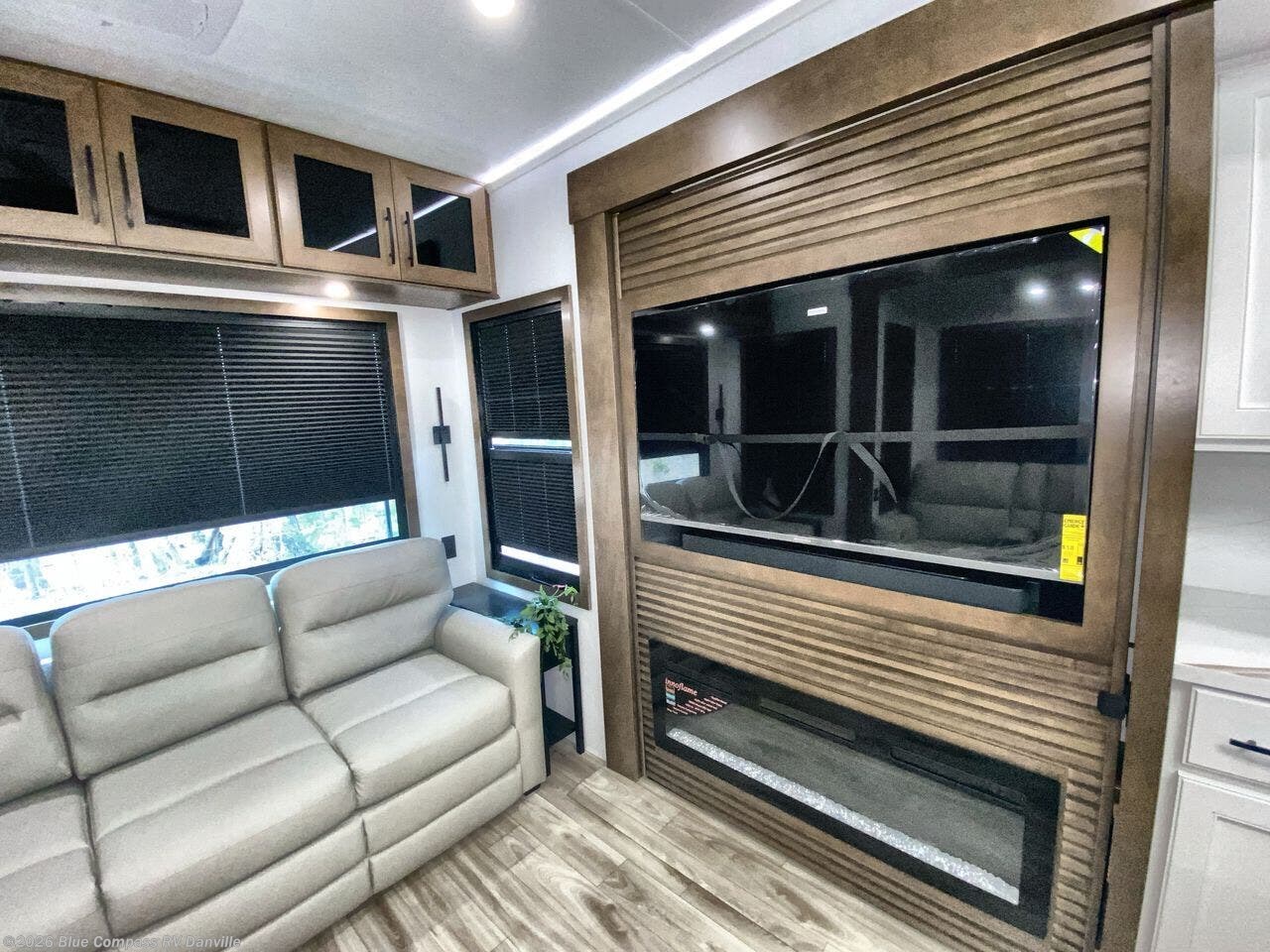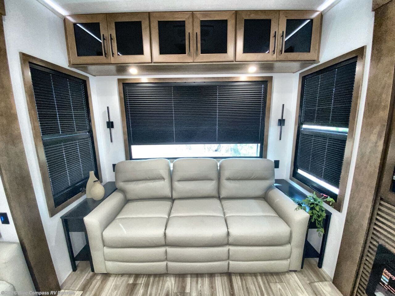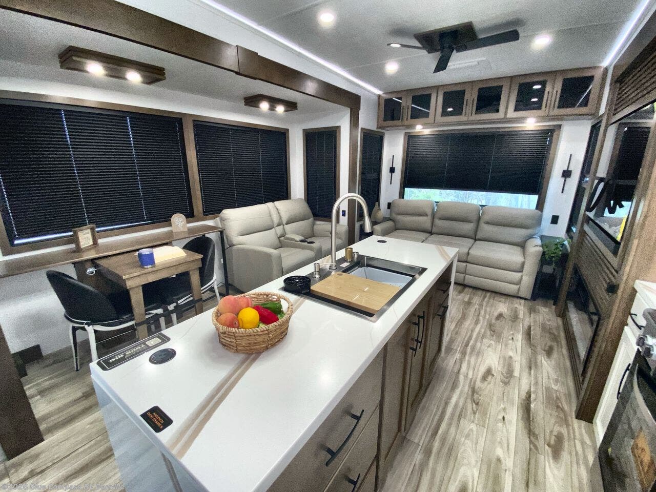 It won't be hard to find comfort in this fifth wheel with triple slides for more space, a spacious front bedroom, and a rear living area with a comfy sofa! Once you've unloaded the exterior pull-out storage tray, you can put out the two awnings, then relax in your camp chairs. A four-burner range inside will let you make lunch for your crew, and a spacious kitchen island will provide more counter space. There is also a pantry, overhead cabinets, plus a second, swing-out hidden pantry behind the entertainment center with a fireplace. The pull-out dinette, power theater seating, and rear sofa will give you plenty of seating options, and the dual opposing slides in the combined kitchen and living area will create an open floorplan you are sure to love. Head towards the front to freshen up in the spacious bath with ample counter space, then enjoy a perfect night's rest in the front bedroom, complete with a king bed slide, dual nightstands, front wardrobe, plus a second wardrobe with washer and dryer prep.