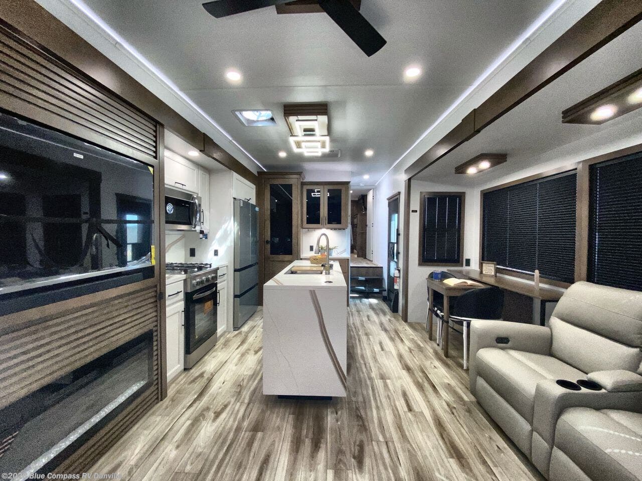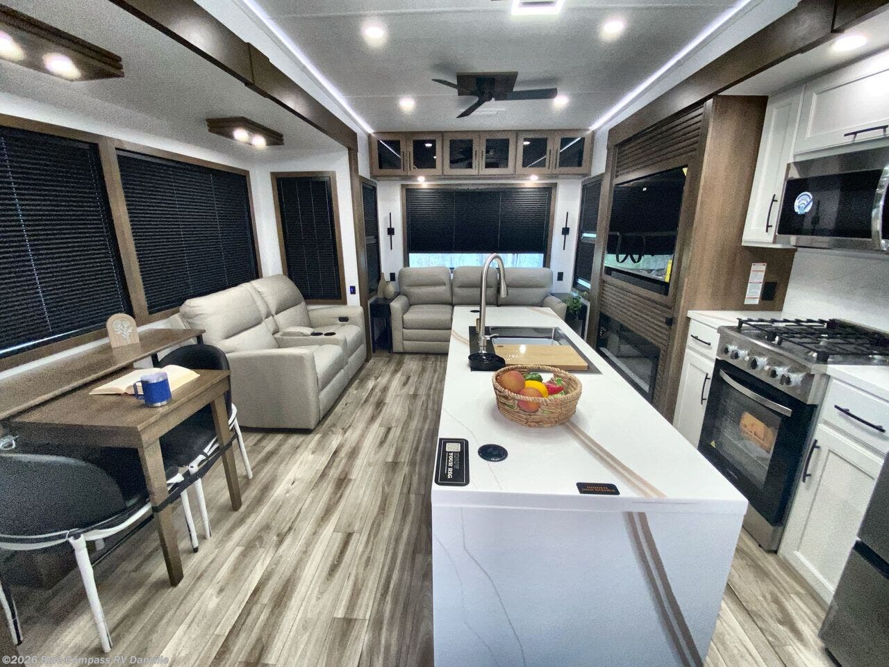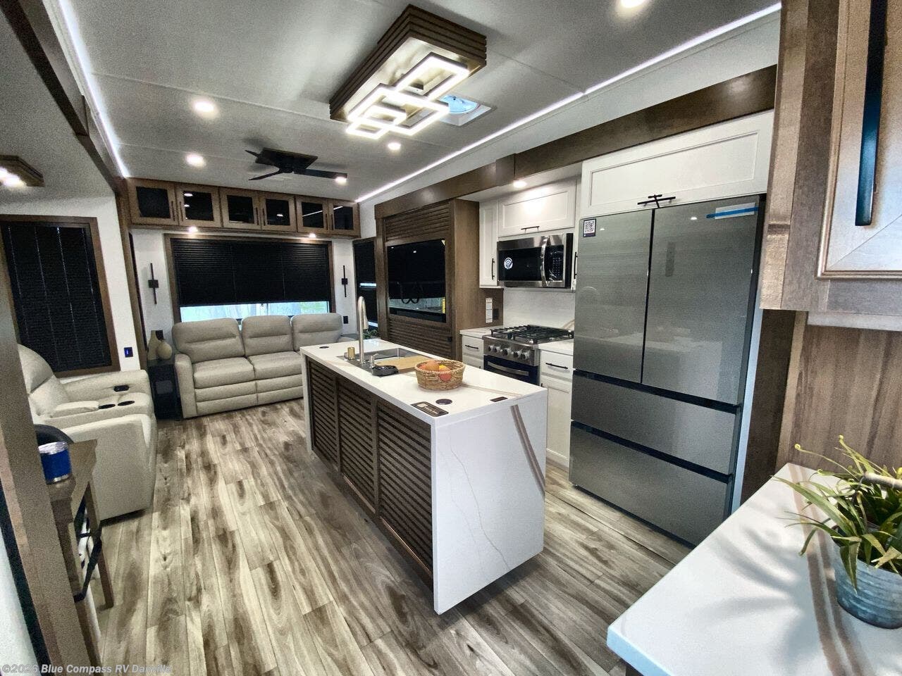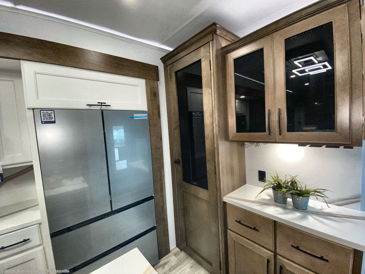 It won't be hard to find comfort in this fifth wheel with triple slides for more space, a spacious front bedroom, and a rear living area with a comfy sofa! Once you've unloaded the exterior pull-out storage tray, you can put out the two awnings, then relax in your camp chairs. A four-burner range inside will let you make lunch for your crew, and a spacious kitchen island will provide more counter space. There is also a pantry, overhead cabinets, plus a second, swing-out hidden pantry behind the entertainment center with a fireplace. The pull-out dinette, power theater seating, and rear sofa will give you plenty of seating options, and the dual opposing slides in the combined kitchen and living area will create an open floorplan you are sure to love. Head towards the front to freshen up in the spacious bath with ample counter space, then enjoy a perfect night's rest in the front bedroom, complete with a king bed slide, dual nightstands, front wardrobe, plus a second wardrobe with washer and dryer prep.