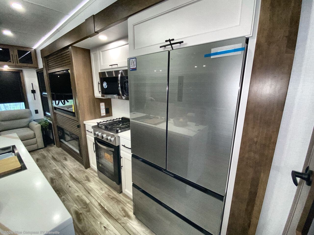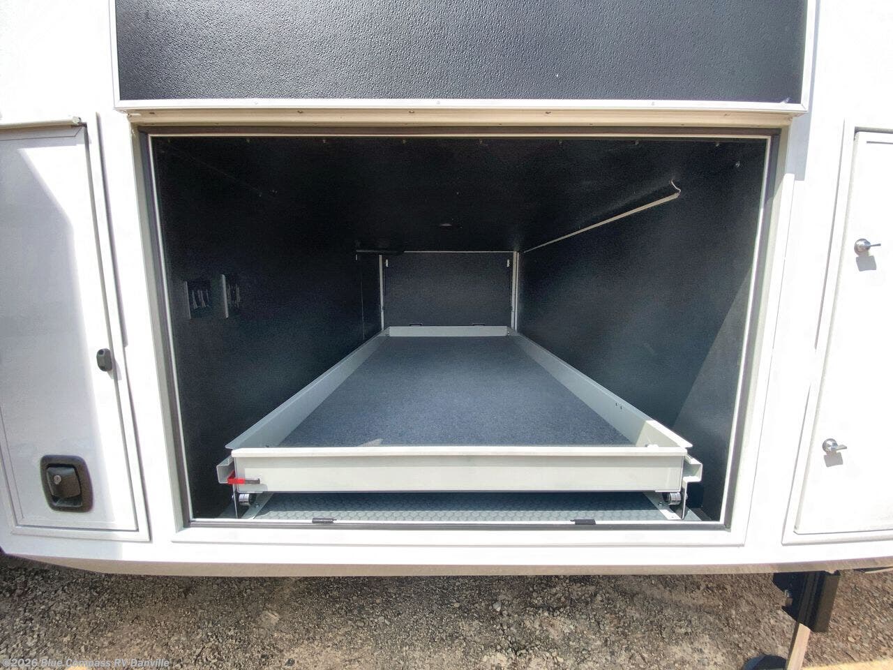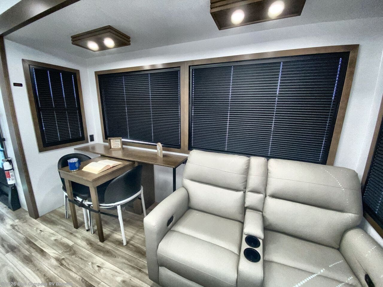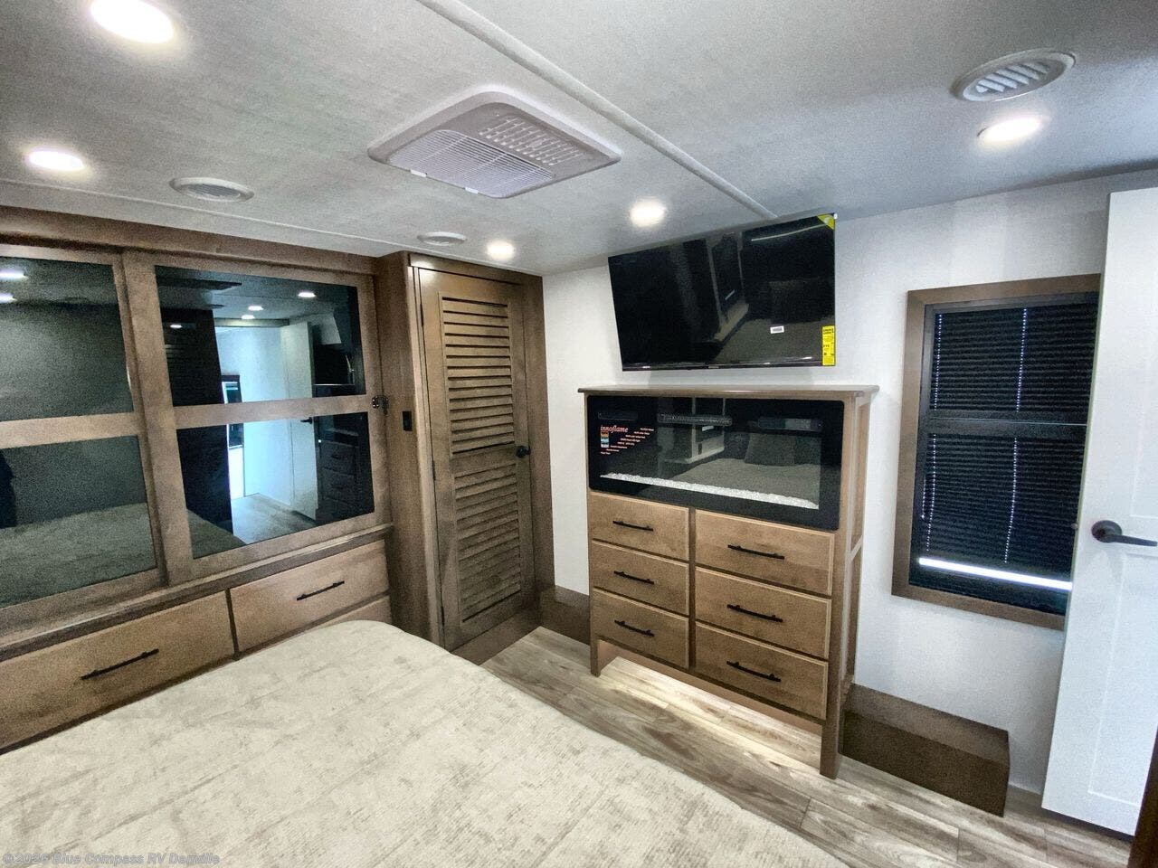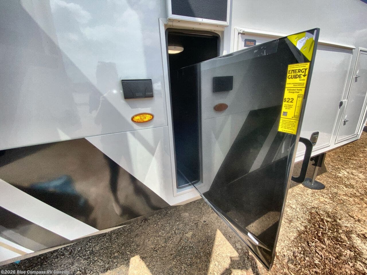 It won't be hard to find comfort in this fifth wheel with triple slides for more space, a spacious front bedroom, and a rear living area with a comfy sofa! Once you've unloaded the exterior pull-out storage tray, you can put out the two awnings, then relax in your camp chairs. A four-burner range inside will let you make lunch for your crew, and a spacious kitchen island will provide more counter space. There is also a pantry, overhead cabinets, plus a second, swing-out hidden pantry behind the entertainment center with a fireplace. The pull-out dinette, power theater seating, and rear sofa will give you plenty of seating options, and the dual opposing slides in the combined kitchen and living area will create an open floorplan you are sure to love. Head towards the front to freshen up in the spacious bath with ample counter space, then enjoy a perfect night's rest in the front bedroom, complete with a king bed slide, dual nightstands, front wardrobe, plus a second wardrobe with washer and dryer prep.